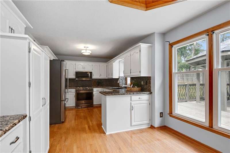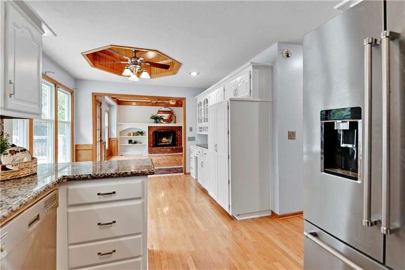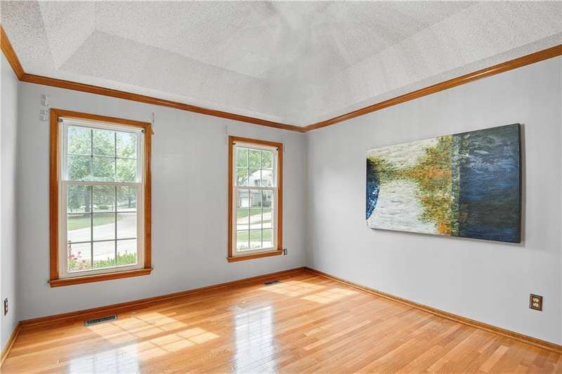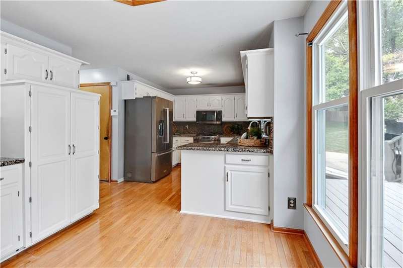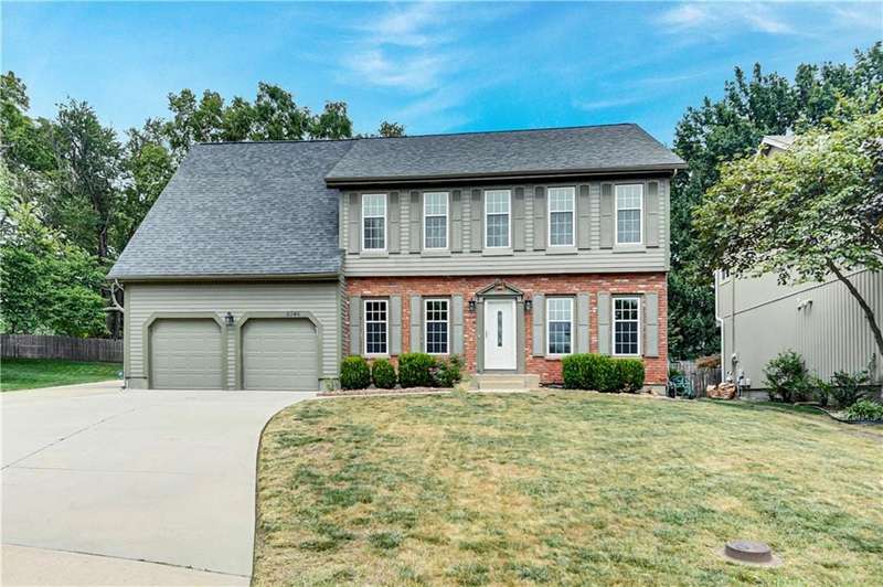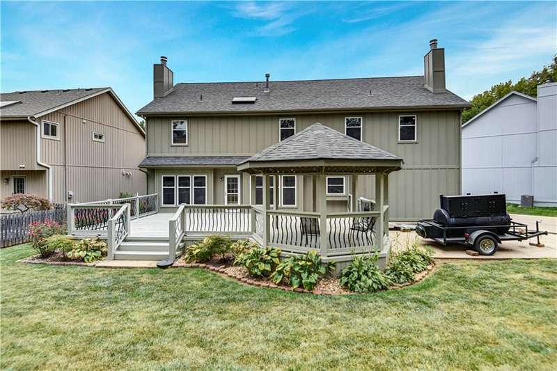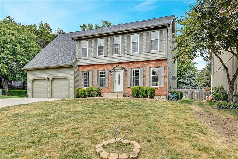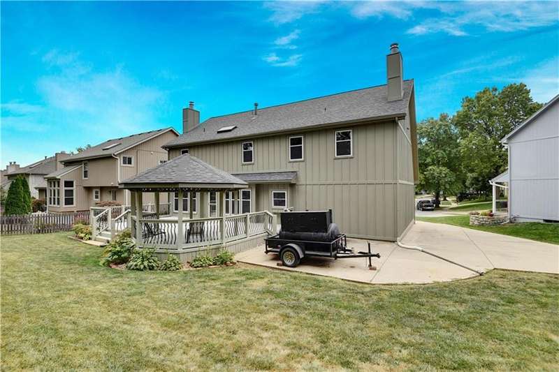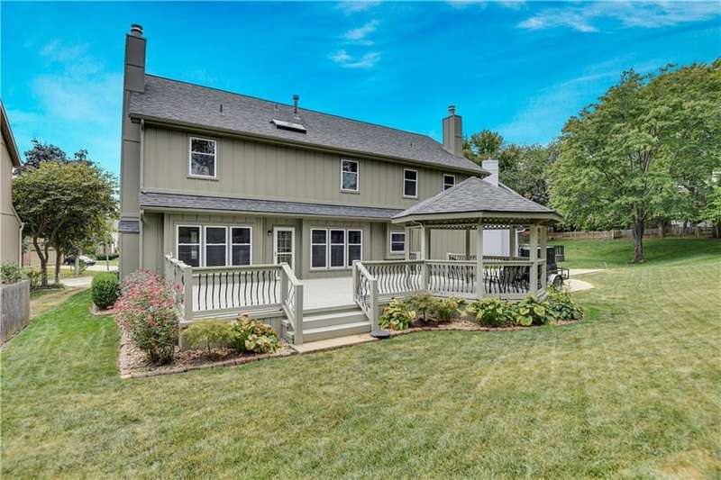 CHARMING 2-Story in The Cedars! Tucked away on a partial cul-de-sac in the heart of Lenexa, this beautifully maintained 5 bedroom (non conforming in basement), 3.5-bath home is truly move-in ready. NEWER WINDOWS, HVAC, ROOF, & CARPET! Step inside to find hardwood floors throughout the main level, a cozy fireplace with built-ins, and a wall of windows overlooking the huge backyard. The kitchen shines with freshly painted white cabinets, granite countertops, newer appliances, and a breakfast bar. An office and formal dining room complete the main level. Upstairs, the upgraded wood staircase with wrought iron spindles leads you to a huge primary suite featuring its own fireplace, sitting room & his/her closets one very large with room to expand further into attic. The spa-like bath offers a soaking tub, double vanities, and a separate shower area. Three additional bedrooms, a full bath with cathedral ceiling, brand-new carpet & convenient laundry room. The finished lower level is perfect for entertaining or relaxing, with a large family room with bar, full bath, 5th bedroom and abundant storage. Outside, enjoy the oversized deck with gazebo, additional patio space for grilling, and side parking for extra vehicles. Conveniently located near shopping, restaurants, parks, schools, and the local library. True pride of ownership in this beautiful home!