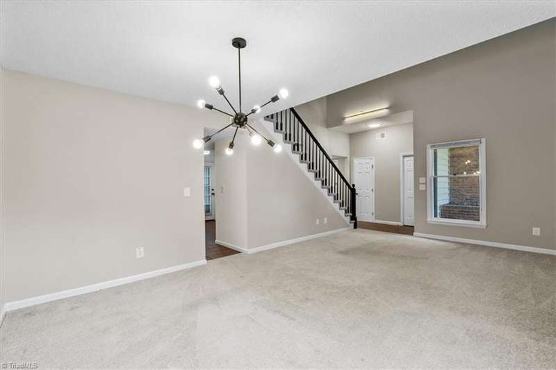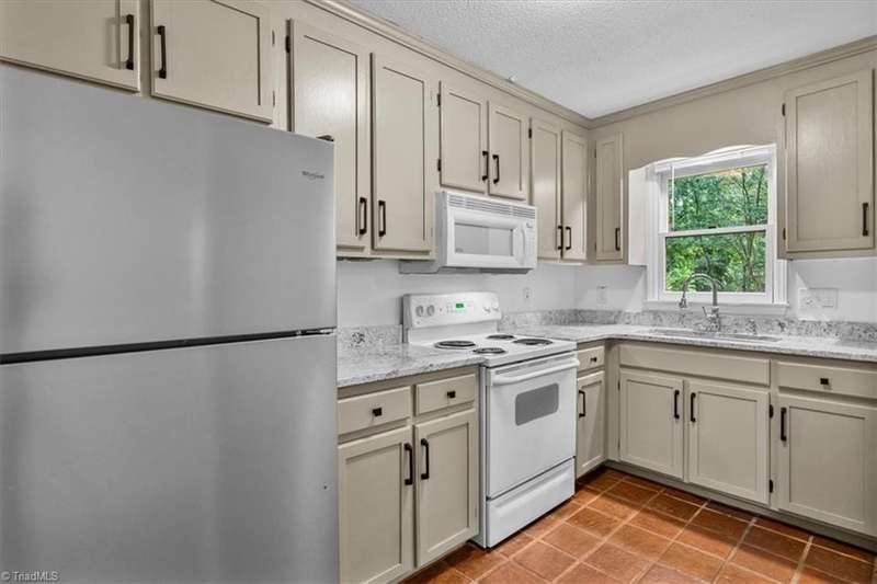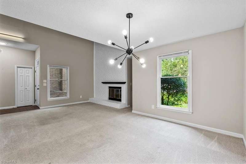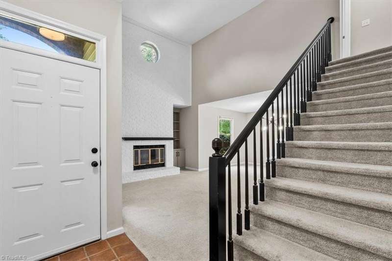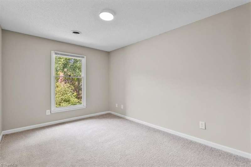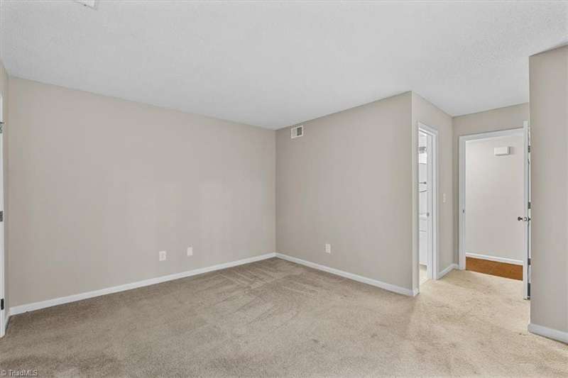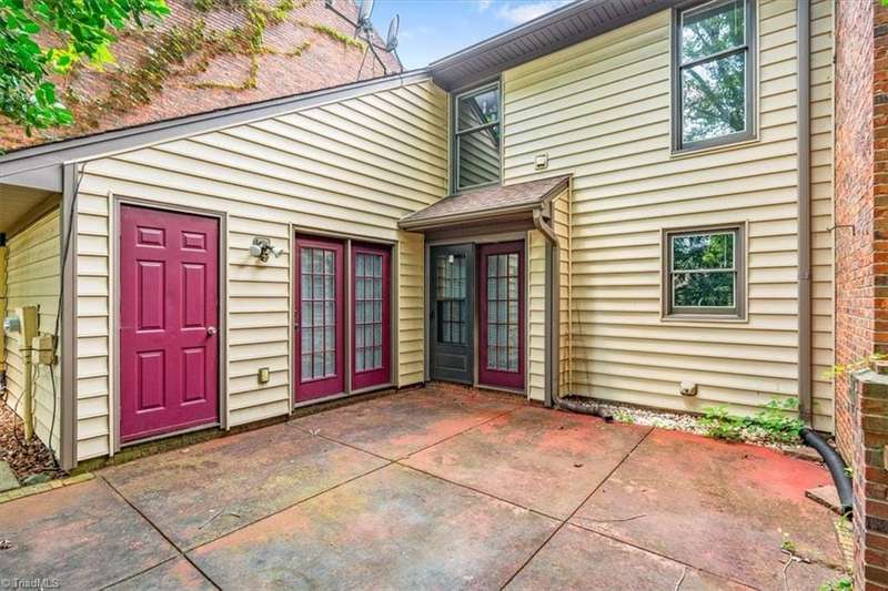 Charming 3 bedroom, 2.5 bath, townhome in Northwest Greensboro. Newly updated bathrooms with fresh tile, new vanities and mirrors. Fresh paint throughout, newer carpet, refrigerator and dishwasher. Main level primary suite with walk in closet that opens to the private patio. Two story great room with fireplace, and built-ins adjacent to dining area. Kitchen features refinished cabinets, new granite countertops and undermount sink. Upstairs has 2 bedrooms and a full bath. Walk in attic for easy access storage. Two assigned parking spaces with community pool. Washer/Dryer included. Neighborhood lies steps from the A&Y Greenway, Military Park & GSO's watershed trails. Approximately 1 mile to Trader Joe's and Home Depot