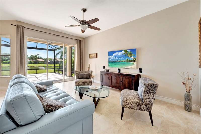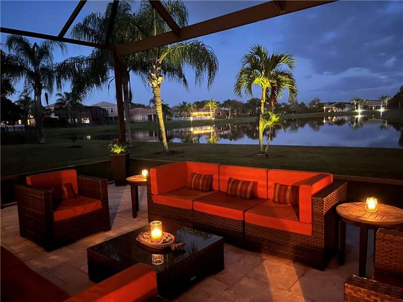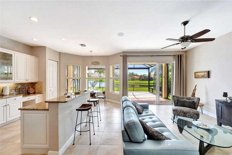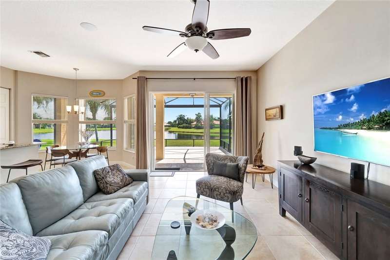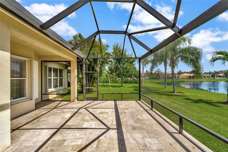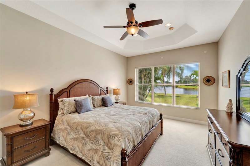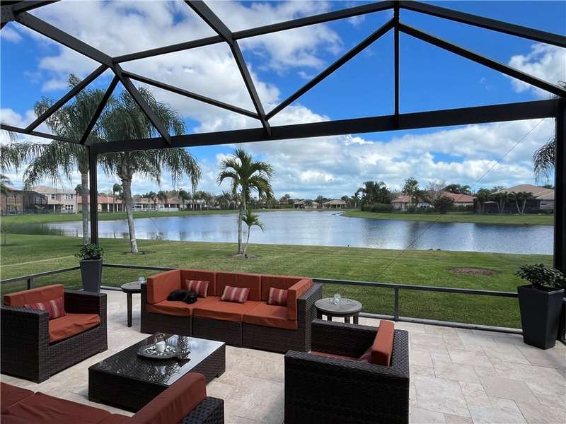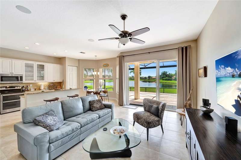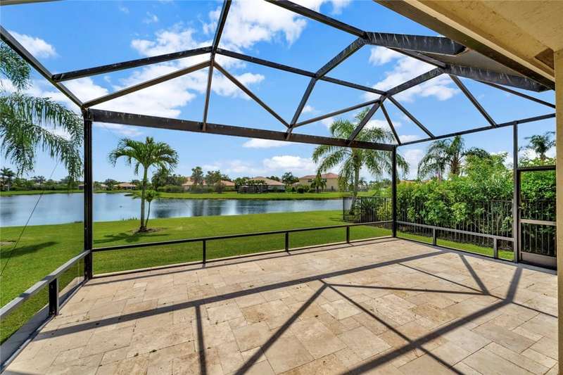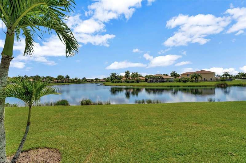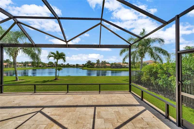 Immaculate lakefront 3BR/2BA home in a sought-after gated community with resort-style amenities! Features a light-filled open layout, soaring ceilings, tile floors, accordion shutters, water filtration system, HWH 2022, and a beautifully upgraded kitchen with SS appliances, double oven, granite c-tops, and custom pantry pull-outs. The spacious primary suite offers dual vanities and a garden tub. Enjoy stunning long lake views from the extended covered porch with travertine pavers and clear view screening. Amenities include a pool, clubhouse, pickleball, fitness center & more! szeaproxsbj2err