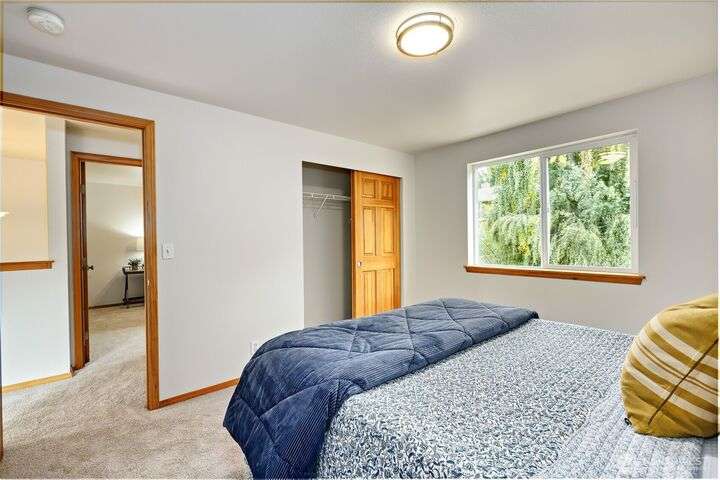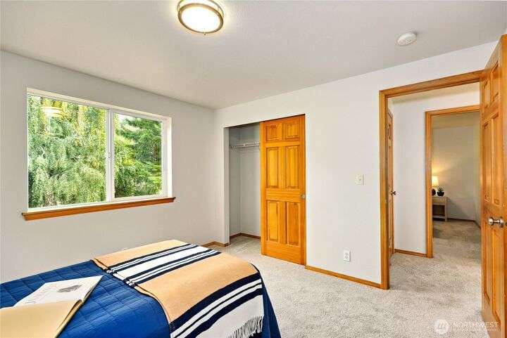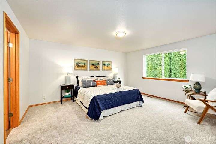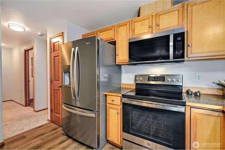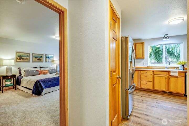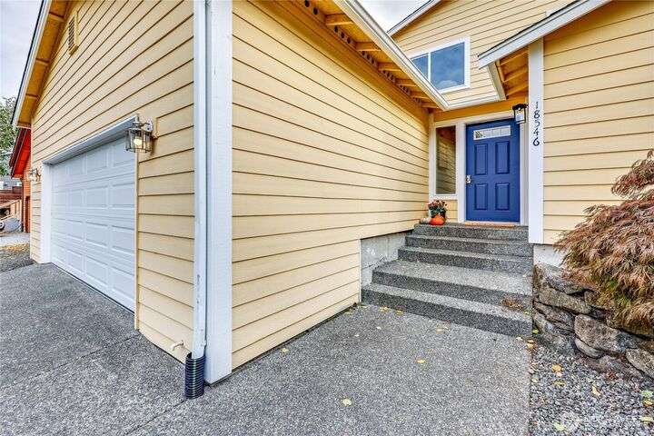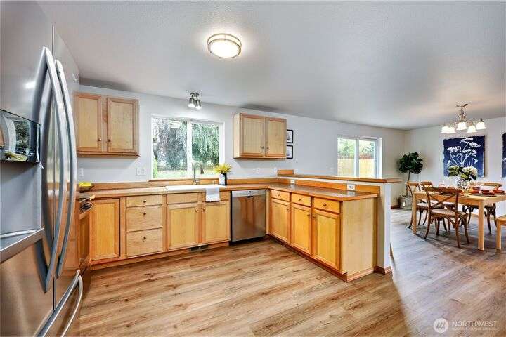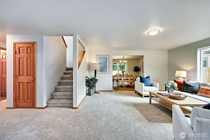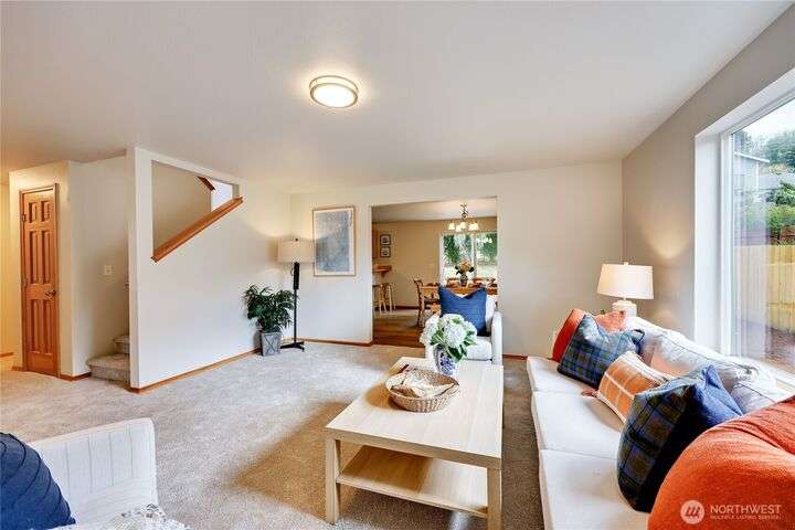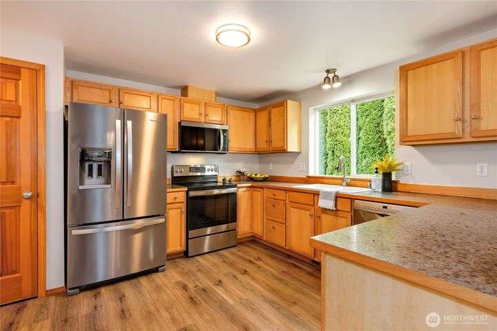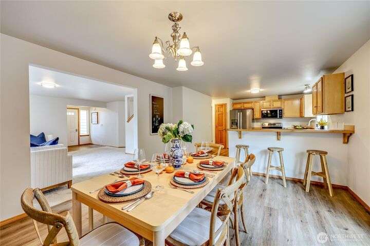 The In-Town location you've been waiting for with Olympic Mt. Views! Charming 2280 sf. 2-story offers 3 bedrooms, 2.5 baths including a main floor primary suite! Main level office, bright living room, large kitchen w/high-end SS appliances, maple cabinetry, eating bar and expansive dining area w/sliding doors to private back yard for pets and play! Laundry & half bath complete first floor. Upper level offers great room w/beautiful Olympic views, two bedrooms and another full bath. Updates include new LVP flooring & carpeting, fresh interior paint, new fridge & microwave, fresh sod & landscape & new garage door. Local shops, schools & waterfront restaurants just minutes away. Come enjoy one of Poulsbo's quaint and convenient neighborhoods!