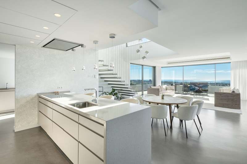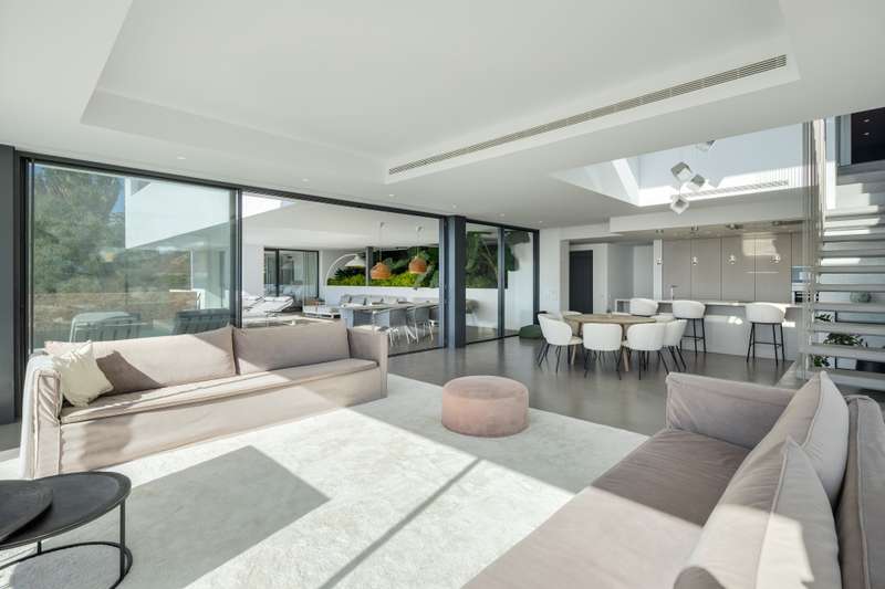 Herrojo 88 is a spectacular Modern villa with a prime location in the gated community of El Herrojo Alto in La Quinta. This property benefits from an elevated position, providing stunning panoramic sea views from all levels of the villa, as well as views of the entire coastline, all the way to Gibraltar and North African coast. The expansive terrace allows for a private pool for all year round enjoyment, as well as chill-out areas and al-fresco dining. The interior offers a stunning open-plan layout, allowing for a seamless flow between living spaces. Floor to ceiling glass sliding doors open up to the exterior terraces, maximising indoor/outdoor living as well as providing incredible views from the interior. The modern kitchen comes fully-equipped with state-of-the-art kitchen appliances and plenty of storage, making the space functional and aesthetic. Offering 4 stunning bedrooms, the master bedroom steals the show, with unparalleled views from the connecting terrace. The property