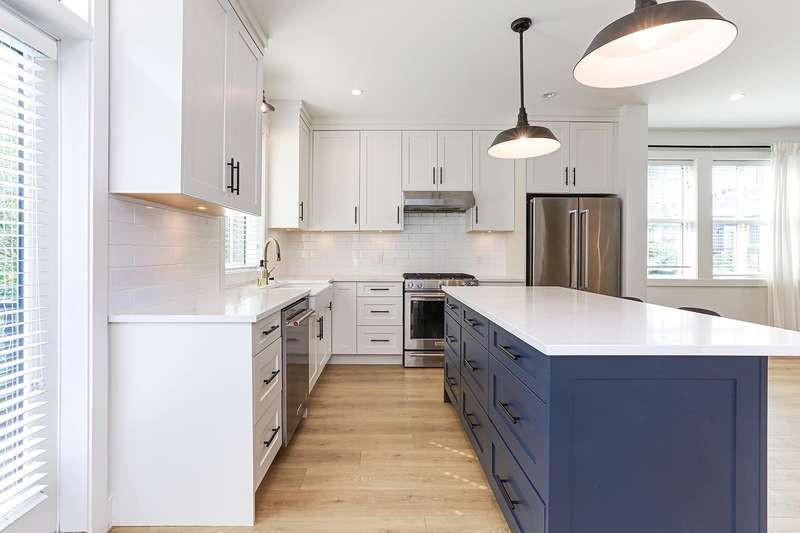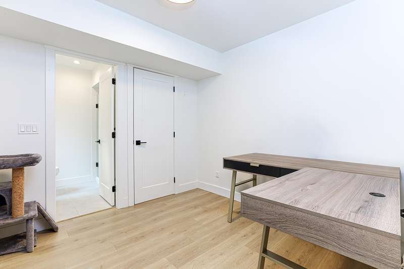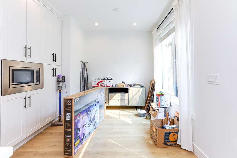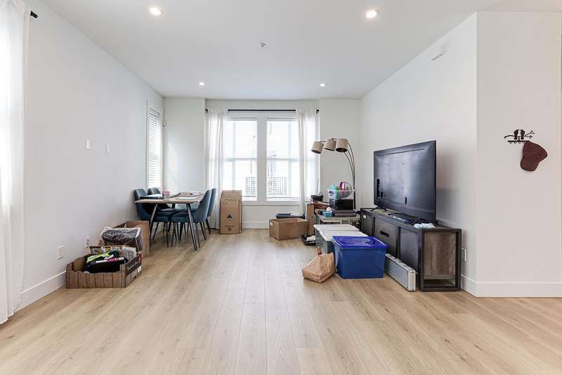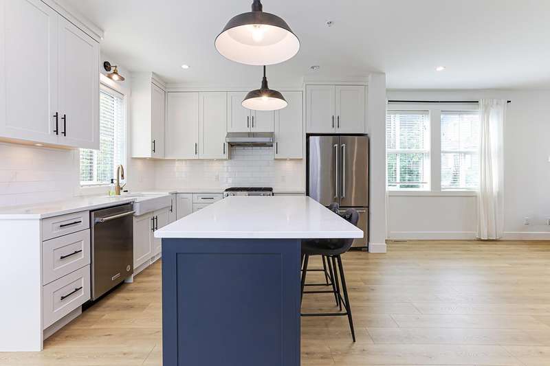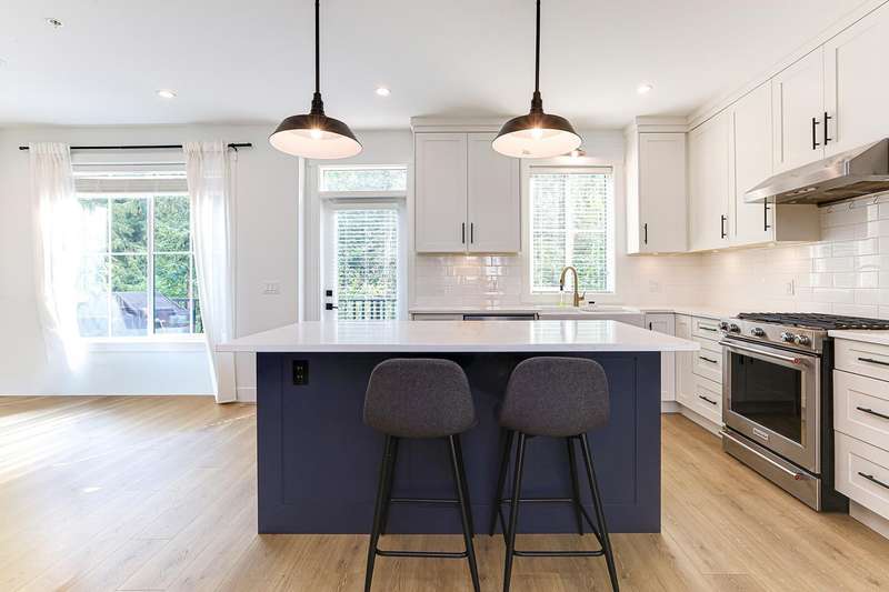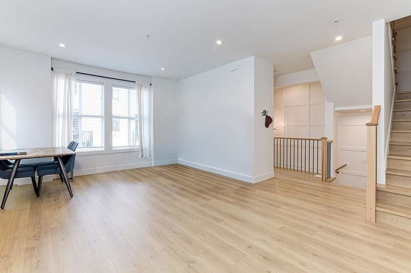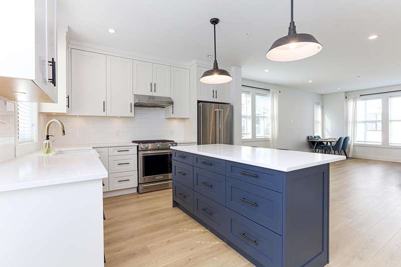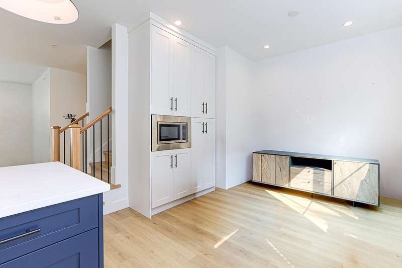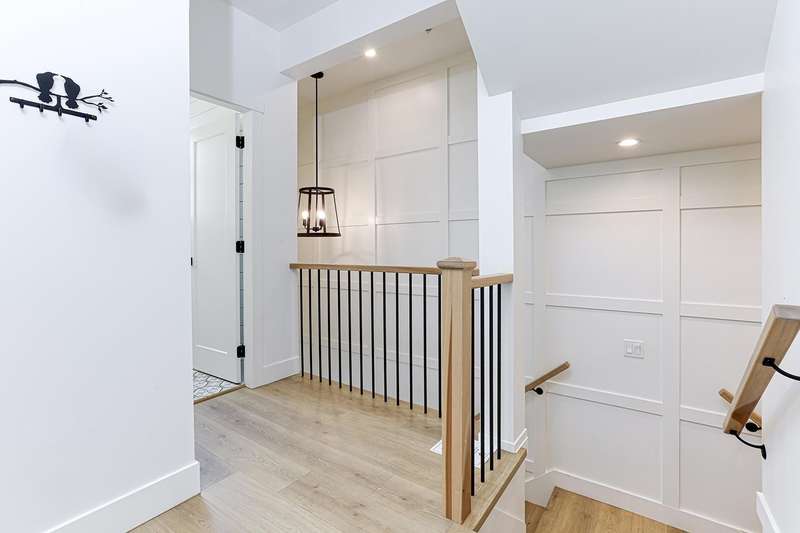 Welcome to HOMESTEAD-this 2021-built 3-storey townhome offers 1,792 SF of elegant living with 4 beds/4 baths, and a side-by-side double car garage. Corner unit! Enjoy luxury finishings including intricately designed feature walls with crown-style detailing, vaulted ceilings in the primary bedroom, and spa-inspired bathrooms. The open-concept main floor features KitchenAid S/S appliances and A/C for year-round comfort. Step out to a spacious, fully fenced backyard backing onto a tranquil greenbelt-perfect for privacy and entertaining. Bedroom with full bath on below level is ideal for guests or office. A rare blend of style, space, and serenity! Walking dist. to parks, trails, schools, transit, & mins to Hwy 1. Low strata fees and pet-friendly. Contact Elton for viewing. (id:58403)