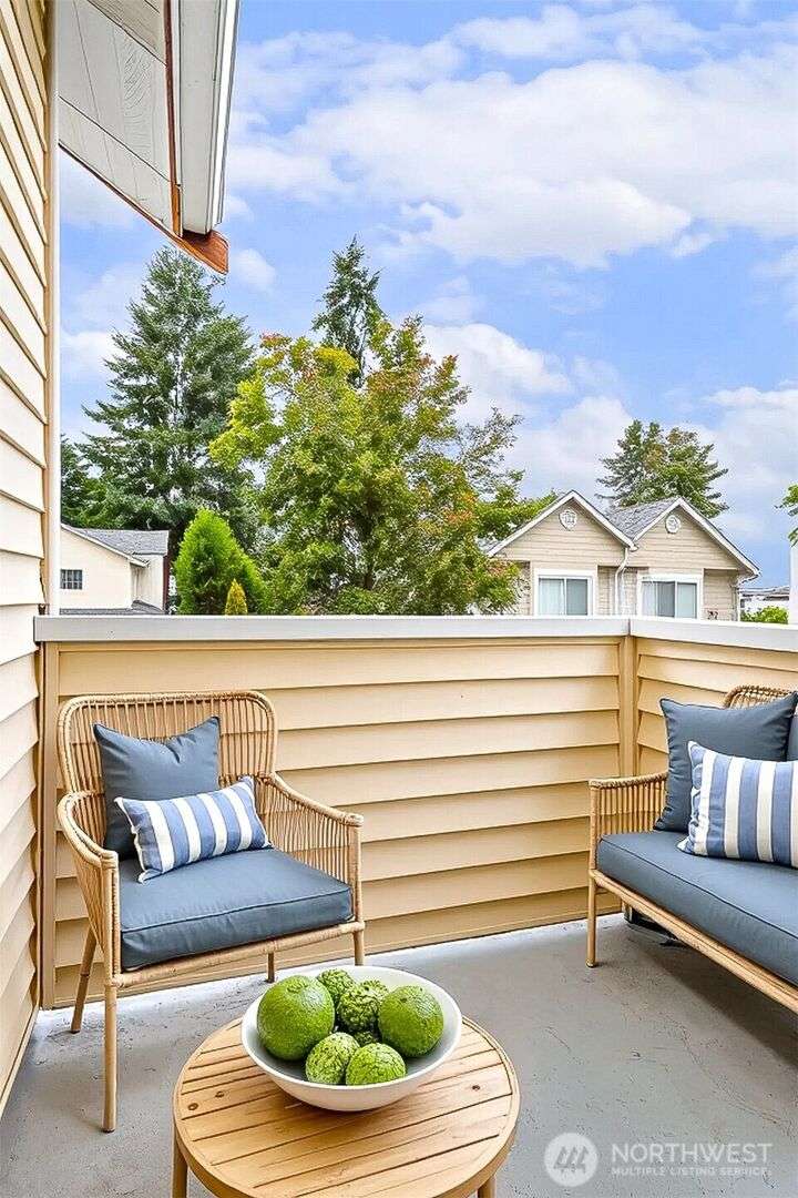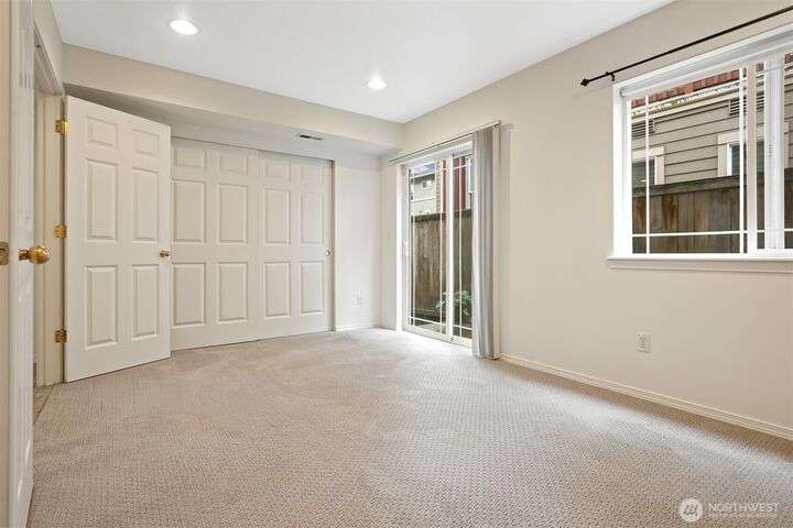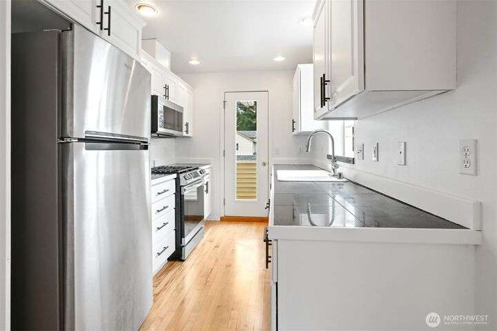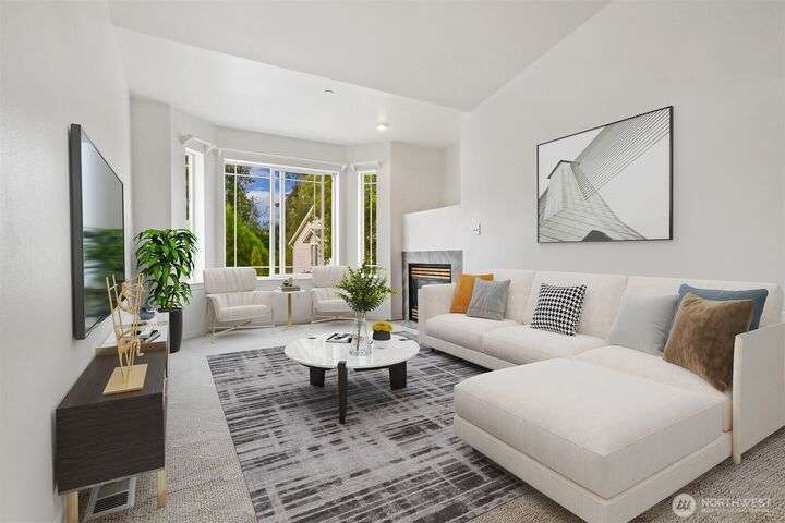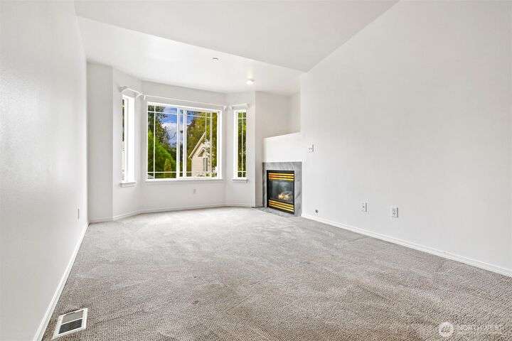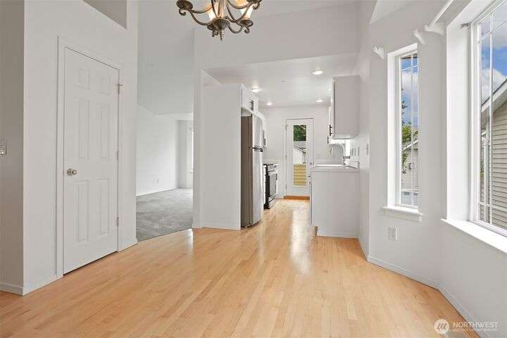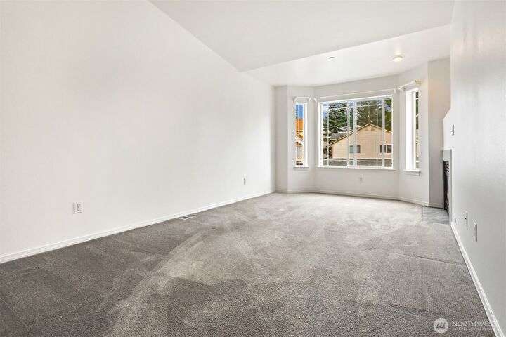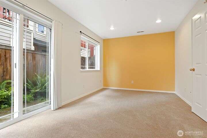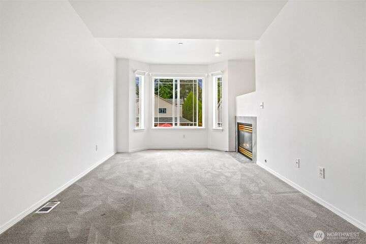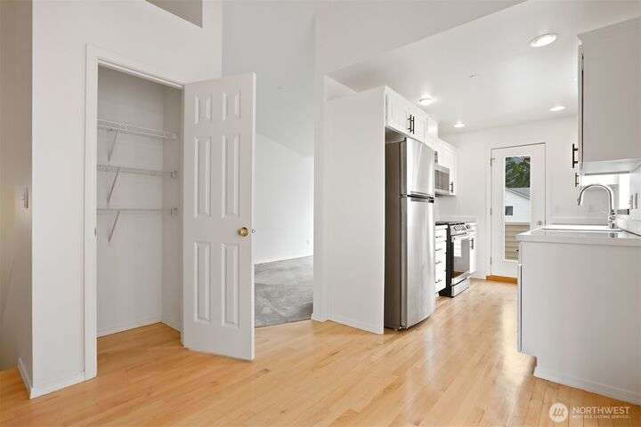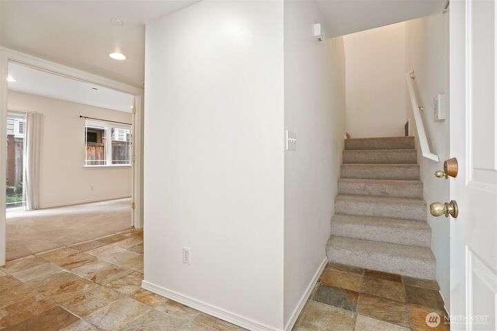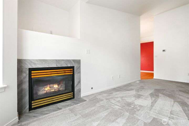 Light-filled, move-in ready townhouse style condo in a quiet community on a dead-end street! The lower level offers a spacious bedroom w/ glass sliders that open to a small yard & patio, a full bathroom & washer/dryer. The upper-level boasts refinished hardwood floors, bay windows, a gas fireplace, dining room, & spacious kitchen w/ gas cooking, & balcony for BBQs. The primary suite includes a walk-in closet & a full bath w/ skylight. Fresh paint throughout, new carpet, new H2O heater, newer furnace & kitchen appliances, 2-car garage w/ additional storage. Low HOA dues & great Shoreline schools. Steps to Interurban Trail. Very close to shops & tons of dining options. Incredibly convenient to 99 & I-5, & the new 148th light rail station.