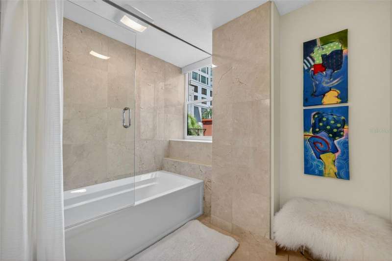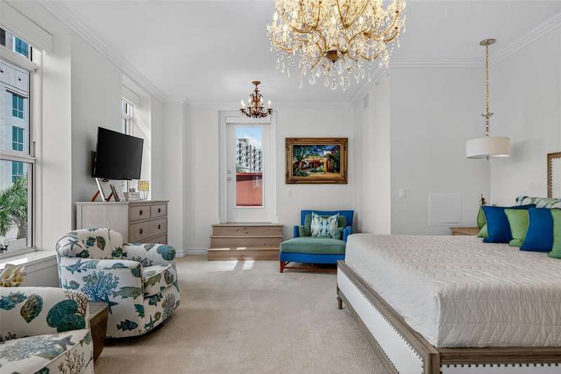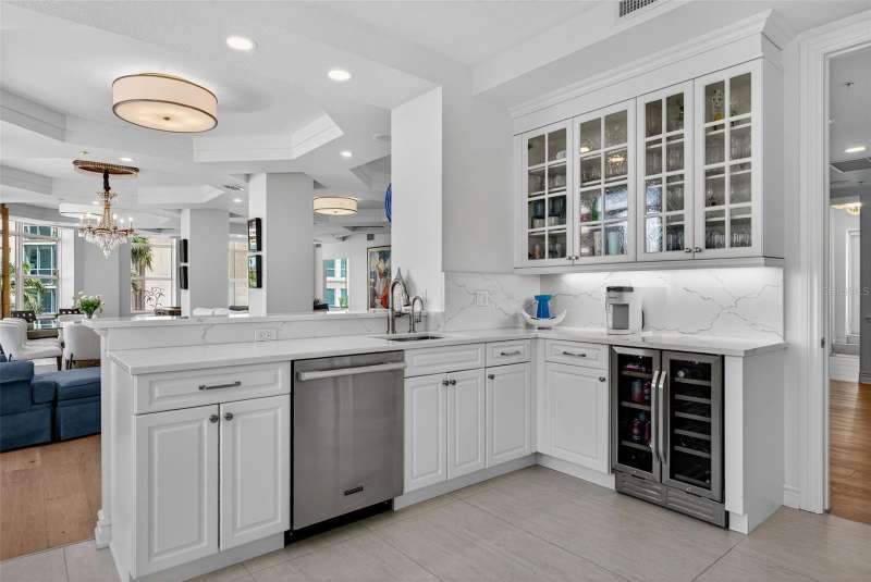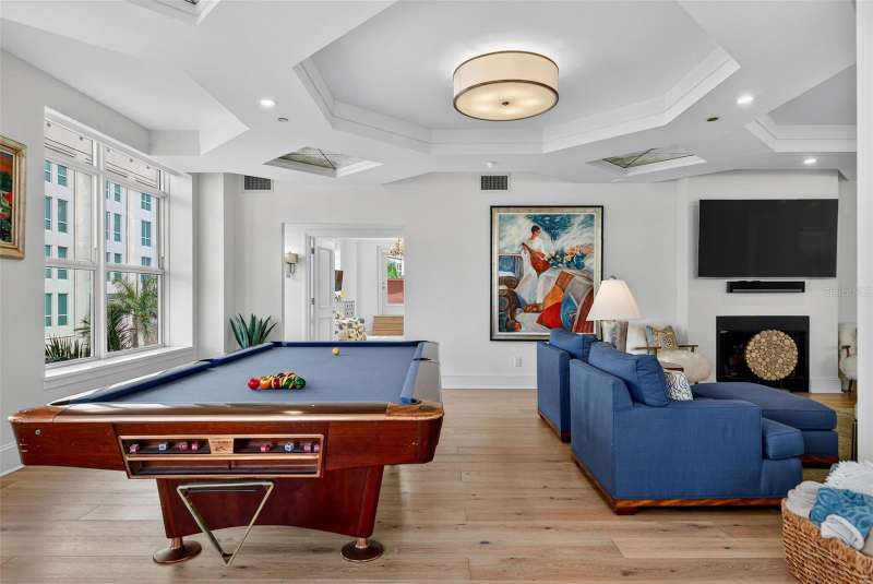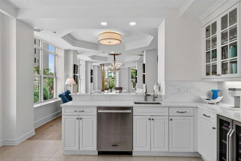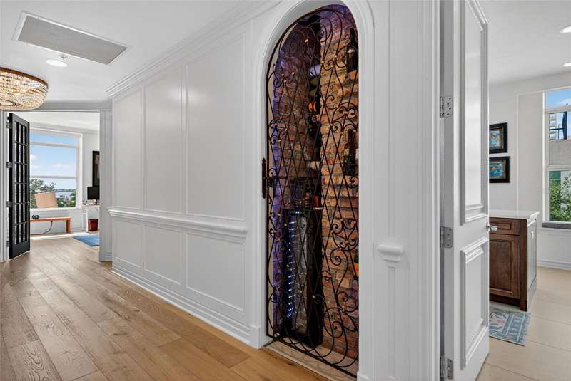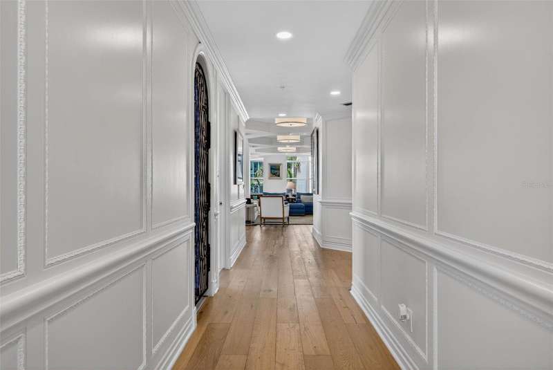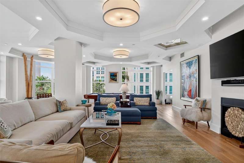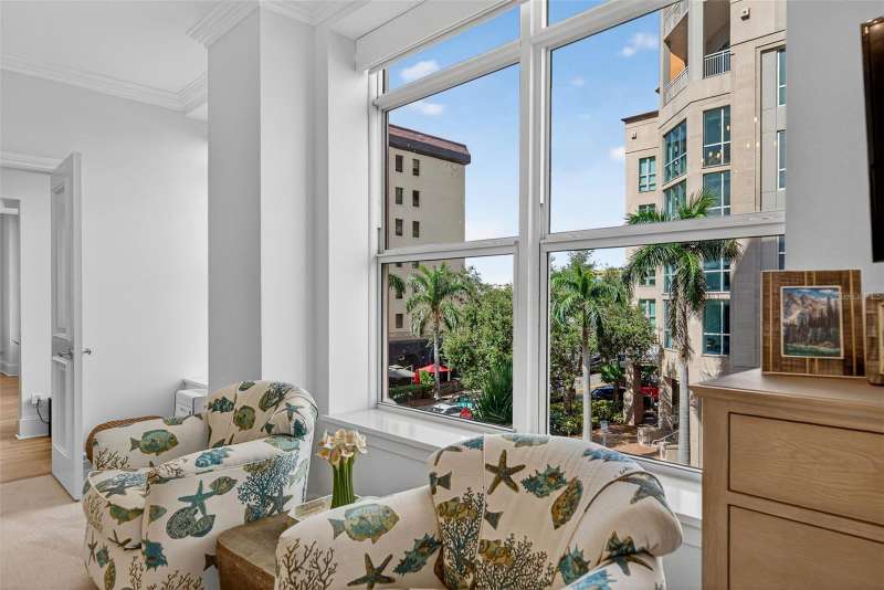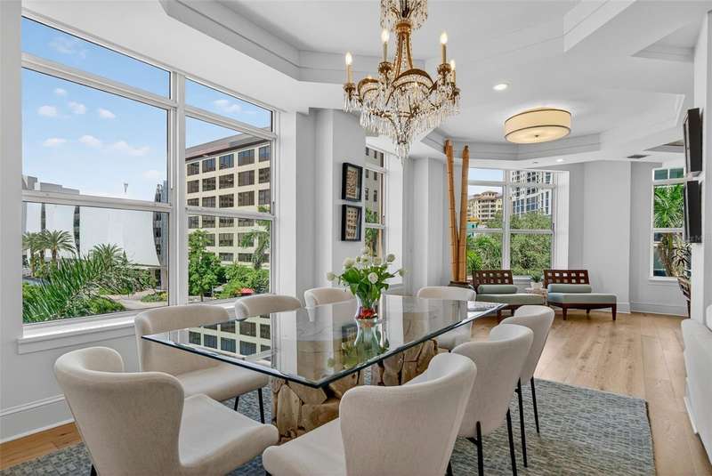 A luxurious piece of Sarasota’s history, combining timeless architecture, generous space, and modern upgrades in the heart of downtown. This rarely available full-floor residence at the iconic Orange Blossom Tower built in 1926, one of downtown Sarasota’s most prestigious addresses at Main Street and Palm Avenue. Occupying the entire third floor, this 3-bedroom, 3-bath, 3,974-square-foot home offers a vibrant urban lifestyle just steps from fine dining, art galleries, boutiques, Bayfront Park, the marina, and Sarasota’s renowned theater district. From your private elevator, a grand foyer opens to a gallery hallway showcasing an antique brick wine cellar with a custom iron door, leading into expansive living and dining spaces adorned with bespoke millwork, a fireplace, octagonal ceiling detail, and oversized 7’ windows that flood the interiors with natural light. Two private terraces, including an oversized 13’ x 46’ retreat, to extend your living space outdoors for al fresco dining, and relaxation. The professionally enhanced kitchen is a chef’s dream, featuring quartz countertops, a Wolf 6-burner gas range, two Signature dishwashers, built-in refrigerator, beverage refrigerator, and a crystal chandelier over the center island. Condo features a water treatment system with reverse osmosis. Other recent updates include new AC units with infrared (2022 and 2023), new hot water heater (2024), new engineered wood flooring and carpet, a remodeled bath, new electrical outlets, electronic shades throughout, quartz window sills, and LED surface-mount fixtures and dimmers, The spacious owner’s suite offers large windows, 17’7” x 18’ antique-brick terrace overlooking tree-lined Palm Avenue, and an elegantly updated bath with dual vanities, walk-in shower, soaking tub, and custom closet system. Two guest suites are tucked into a private wing, each with a full bath and new custom closets—one opens directly to the expansive terrace—while a versatile large den makes an ideal office, reading room, or potential fourth bedroom with views of Sarasota Bay and stunning sunsets. Residents of Orange Blossom Tower enjoy concierge service, secure lobby entry, two deeded garage spaces, and use of the pool, spa, and fitness center at neighboring 1350 Main, along with additional storage room on the terrace and second floor. Importantly, the building’s Structural Integrity Reserve Study (SIRS) and Financial Reserve Study (FRS) were both completed in 2024, ensuring full compliance with current Florida regulations and giving buyers added peace of mind.