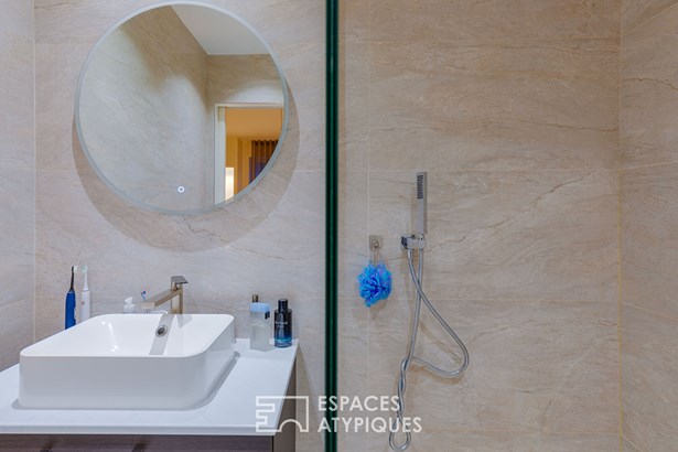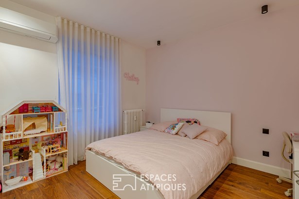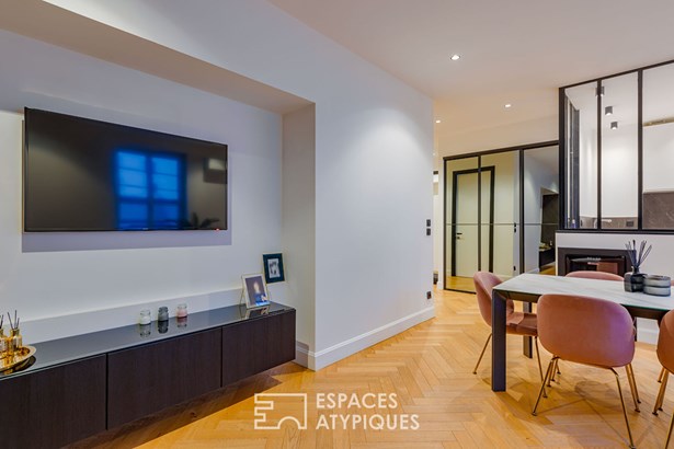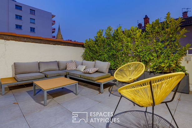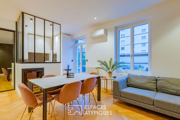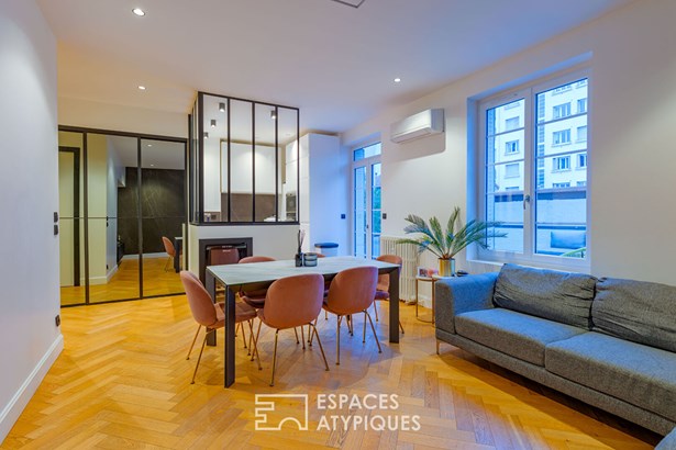 Outside, the over 30 sq m terrace offers a true extension of the living room, sheltered by an awning, in a peaceful setting. The location provides a residential lifestyle while remaining close to urban amenities, local shops, and public transport (Metro D, Tram). Solid wood flooring, carefully selected tiles, custom-made joinery, and comprehensive equipment (air conditioning, wine cellar, double glazing) confirm the high-end character of this property. Quality renovation and contemporary comfort will appeal to those who appreciate high-end features and open-plan living spaces.