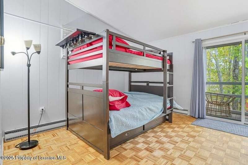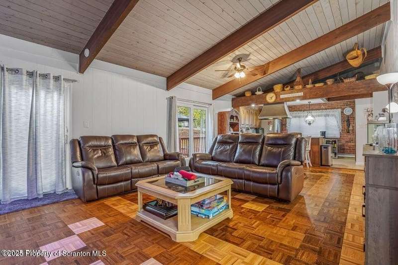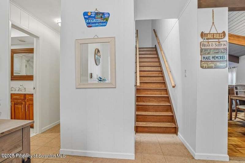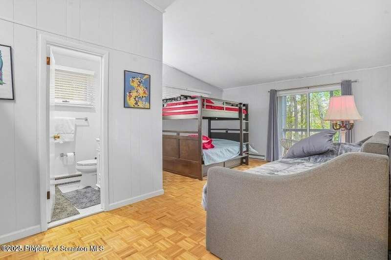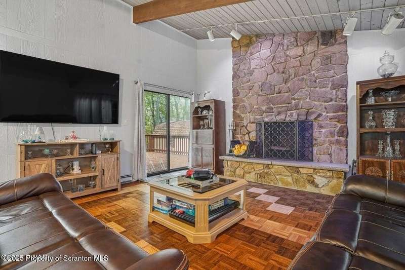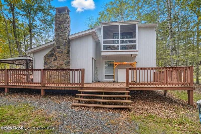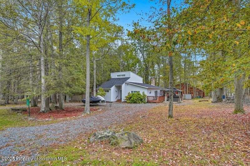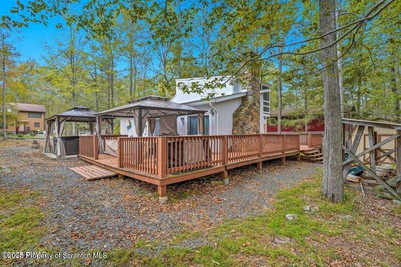 This stunning contemporary-style residence in Wallenpaupack Lake Estates seamlessly blends modern comfort with outdoor leisure, having undergone significant upgrades to elevate its appeal. Featuring three spacious bedrooms and two fully renovated bathrooms, the home offers an open floor plan with a cathedral ceiling in the living room, where a cozy, newly-installed wood-burning fireplace adds warmth. The entire interior has been freshly painted, with refinished wood floors and a completely updated kitchen boasting new countertops, backsplash, and appliances. A new washer and dryer complement the modern amenities. The primary suite includes a private balcony with scenic views, and both bathrooms have been fully renovated with contemporary fixtures. Outdoors, the expansive wrap-around deck has been stained, select boards replaced, and a new hot tub and fire pit area added for ultimate relaxation. A newly-built gazebo enhances the outdoor living space, while new gravel paths and an upgraded driveway improve both curb appeal and functionality. The home also features a brand-new roof, a newly-installed septic pump, and upgraded insulation and a vapor barrier in the crawl space for improved energy efficiency. Residents enjoy access to community amenities such as indoor and outdoor pools, a fitness center, tennis courts, hiking trails, a skate park, RV parking, and camping facilities. The community also offers lake rights to Lake Wallenpaupack, perfect for boating and water activities. This property offers a rare opportunity to own a beautifully updated contemporary home in an amenity-rich community, all set amidst the natural beauty of the Pocono Mountains. This property is also being sold with the extra lot next to it included.