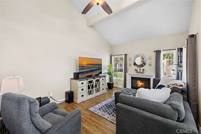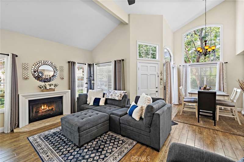 Beautifully upgraded two-story townhome in one of the community's most sought-after locations--one of only a handful with its own private full driveway! This end-unit features soaring cathedral ceilings, a spacious living room with fireplace and travertine hearth, formal dining area with patio access, and a gourmet kitchen with granite countertops, high-end stainless steel appliances, and upgraded fixtures.