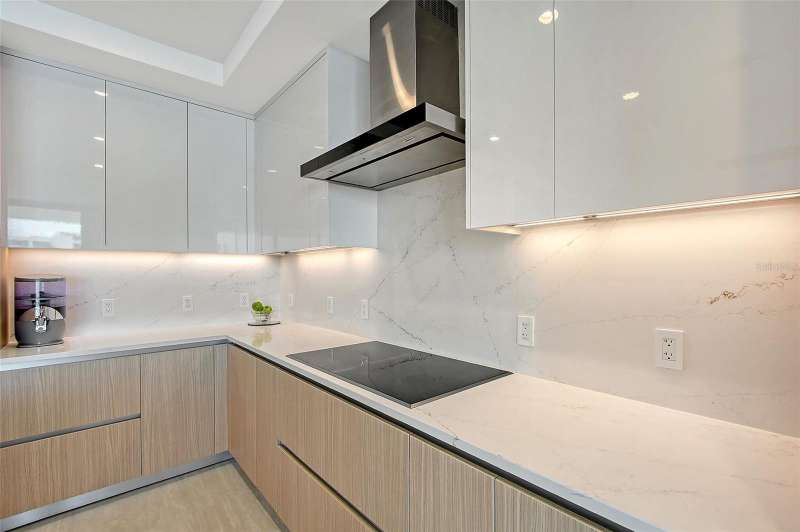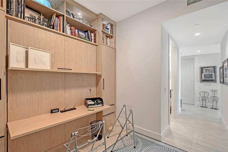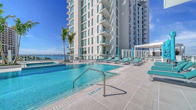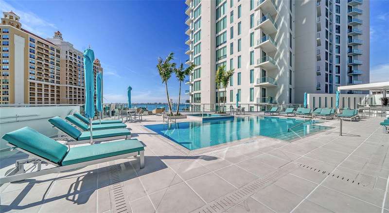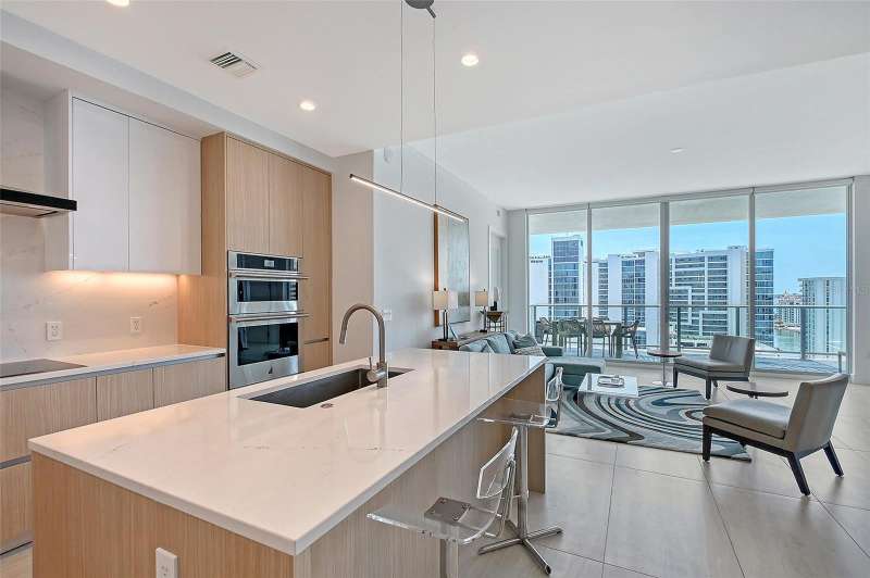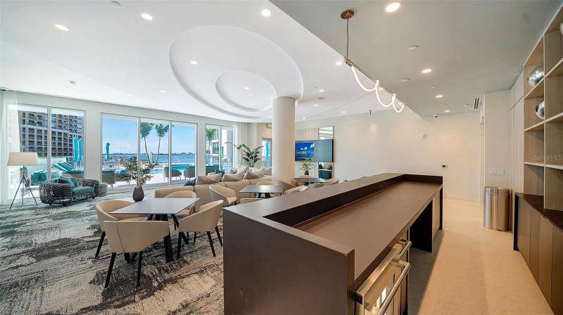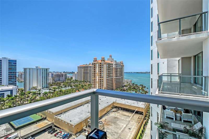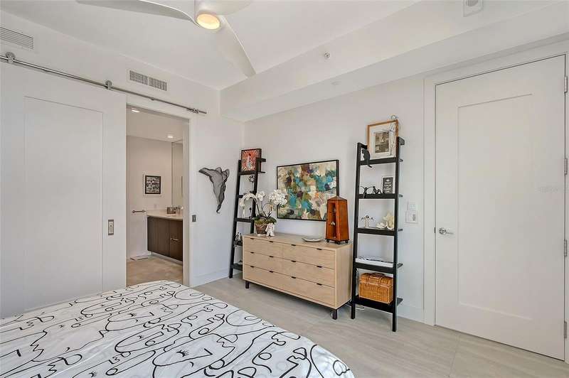 Prepare to be captivated by this absolutely stunning,12th-floor residence at Bayso, Sarasota’s most sought-after luxury tower at The Quay. With postcard worthy southern views of Sarasota Bay and the sparkling downtown skyline from every room, this extraordinary 2-bedroom plus den, 2.5-bath home offers nearly 1,600 square feet of refined sophistication and comfort. The moment you step inside, you’re greeted by a flood of natural light pouring through floor-to-ceiling glass, immediately drawing your eye to panoramic views that stretch endlessly across the bay and city. The elevated 20+ foot above sea level lobby sets the tone for the elegance that awaits above. Soaring 10-foot ceilings, porcelain tile flooring, and tastefully upgraded designer light fixtures throughout the home create a sleek and luxurious atmosphere. The spacious great room and dining area are the heart of the home; perfectly suited for entertaining, relaxing, or simply soaking in the view with your morning coffee or evening glass of wine. This is where everyday living transforms into something exceptional. Step outside to your oversized private terrace with glass railings and indulge in the beauty of Sarasota’s ever-changing skyline. The kitchen is a true showpiece, featuring European-inspired Italkraft cabinetry, glistening quartz countertops, a large center island with rollout drawers, premium Jenn-Air stainless steel appliances including an induction cooktop and double oven; making it ideal for both the everyday chef and the culinary enthusiast. The owner’s suite is a tranquil retreat, offering a spacious walk-in closet with custom built-ins and a spa-like bath complete with Grohe fixtures, double vanity with Robern recessed medicine cabinets, a separate water closet, and a glass-enclosed walk-in shower. The guest suite enjoys its own spectacular views, generous closet space, and a beautifully designed en-suite bath. A versatile den is outfitted with a custom wall unit with a queen-size Murphy bed, offering flexibility as a third bedroom, office, or private media space. A stylish powder room and an oversized utility room with full-size washer and dryer and abundant storage complete this perfectly designed residence. Bayso offers an unmatched array of resort-style amenities. Residents enjoy a 24/7 attended lobby, on-site management, and access-controlled security. The fifth floor is your personal oasis; featuring an elevated pool and spa deck over 60 feet above sea level, outdoor entertainment lounges, kitchen and grilling areas, the serene Splash Lounge, a state-of-the-art fitness center, movement studio, and a private dog park. There's even a formal club room with catering kitchen, co-working spaces, a boardroom for business meetings, secured Wi-Fi throughout all amenity spaces, and a mail room with package storage. The residence includes a premium assigned parking space in the private garage, climate-controlled storage, and there is also separate bicycle storage for the residents. All of this just steps from Sarasota’s thriving arts scene, award-winning dining, boutique shopping, and cultural venues; with the white sands of Lido Key, Longboat Key, and Siesta Key just minutes away. Whether you're seeking an elegant year-round home, a chic pied-à-terre, or a lock-and-leave retreat in one of Florida’s most desirable cities, this residence is your invitation to live the dream. Schedule your private tour today and experience the very best of luxury living at Bayso.