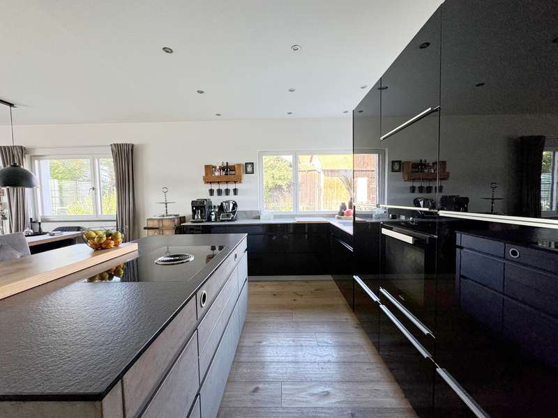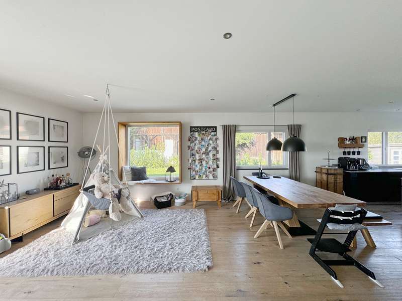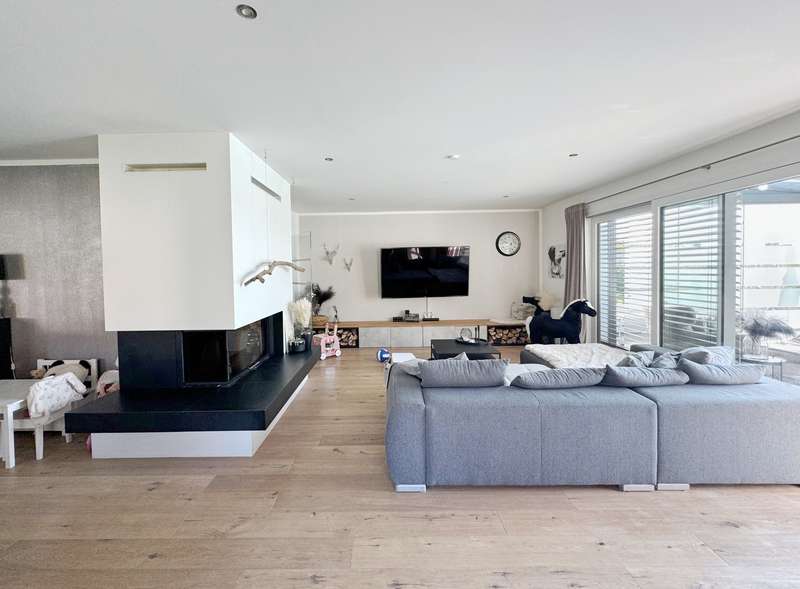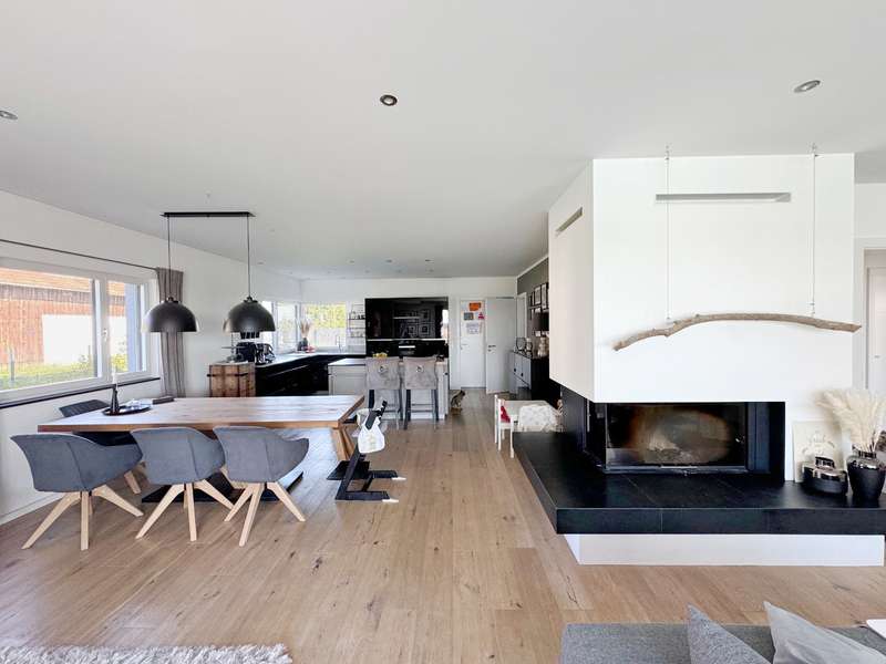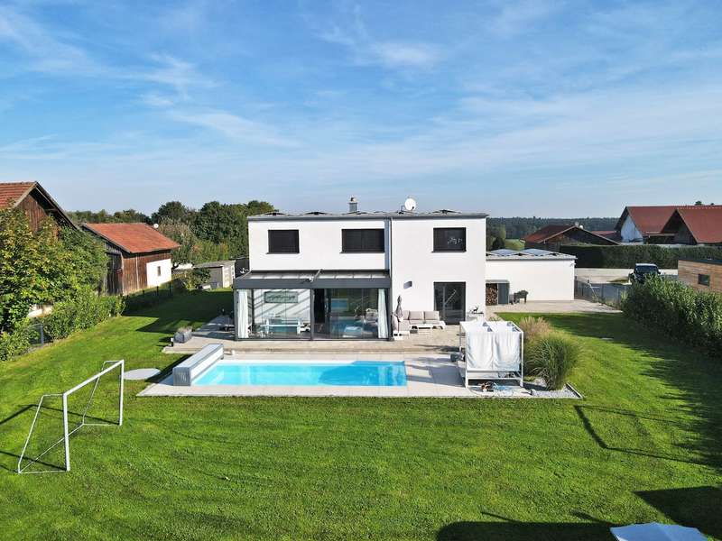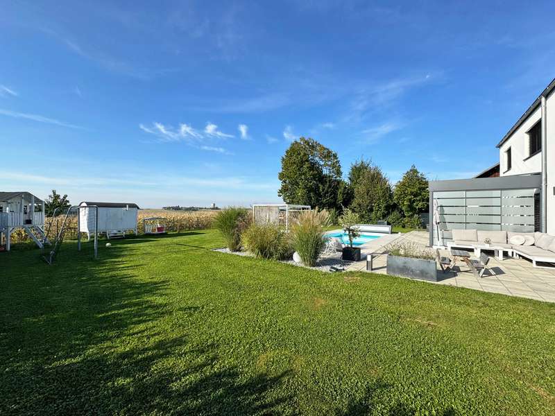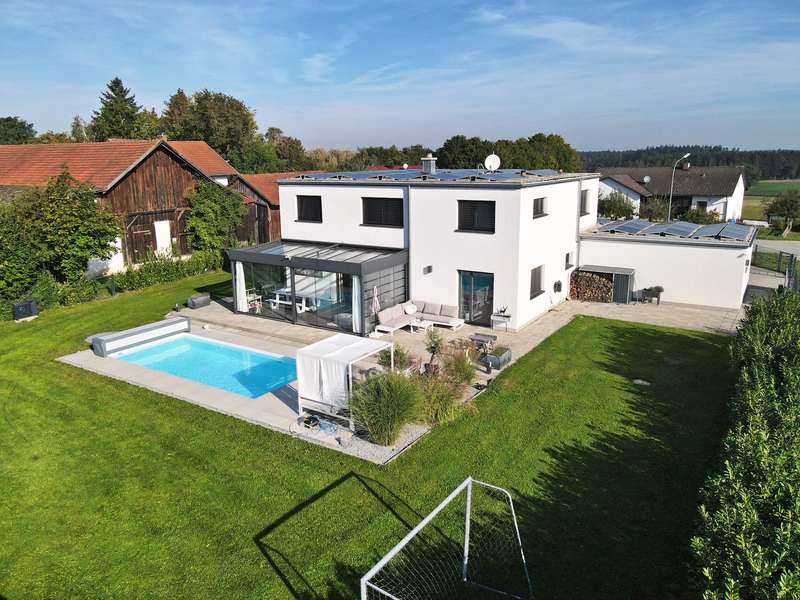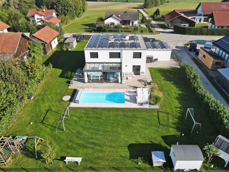 This modern and lovingly designed property, built in 2015, impresses on a generous plot of 1,570 m², idyllically situated on the outskirts of a village in the municipality of Adlkofen. The detached house with an impressive living space of 230 m² not only offers far-reaching views of the picturesque hilly landscape, but also plenty of space and options for a comfortable and contemporary lifestyle. As soon as you enter the house, you notice the open design: The spacious living area with an open kitchen invites you to enjoy convivial evenings. A special highlight is the elegant wood-burning stove, which provides cozy warmth. The high-quality materials such as large-format tiles and fine oak parquet flooring create a stylish atmosphere, which is complemented by lovely furnishing elements such as the cozy sitting window. The conservatory offers a wonderful transition from indoors to outdoors and lets plenty of light into the house. Outside, you will find a fantastic saltwater pool, perfect for warm summer days, as well as a charming garden playhouse for the little ones. The house is technically state-of-the-art: a powerful photovoltaic system with 28.12 Kwp covers a large part of the energy requirements, while a modern heat pump keeps the heating costs low. In addition, a decalcification system ensures soft water throughout the house. The aluminum-plastic windows with external blinds and venetian blinds offer optimum protection and comfort. A special wellness highlight is the sauna in the bathroom, which allows you to relax luxuriously within your own four walls. The video intercom system, the electric entrance gate and the double garage underline the features of the house. This spacious and perfectly planned detached house offers modern living comfort at the highest level - ideal for families who appreciate plenty of space, views and a lovingly designed environment.