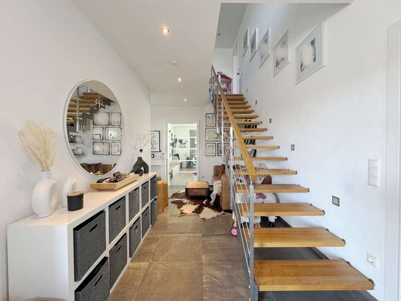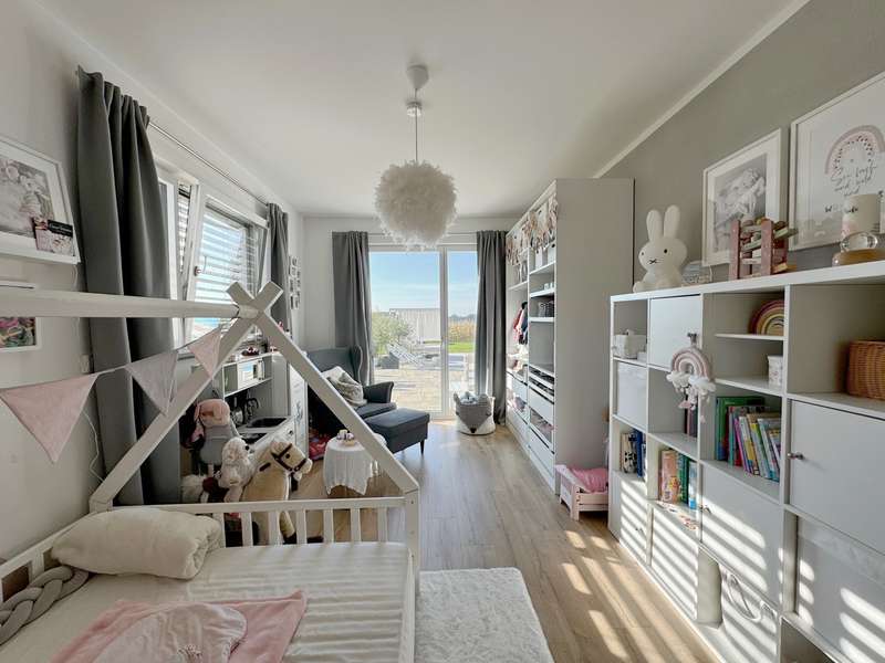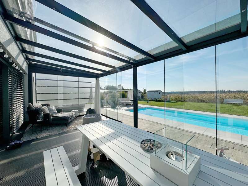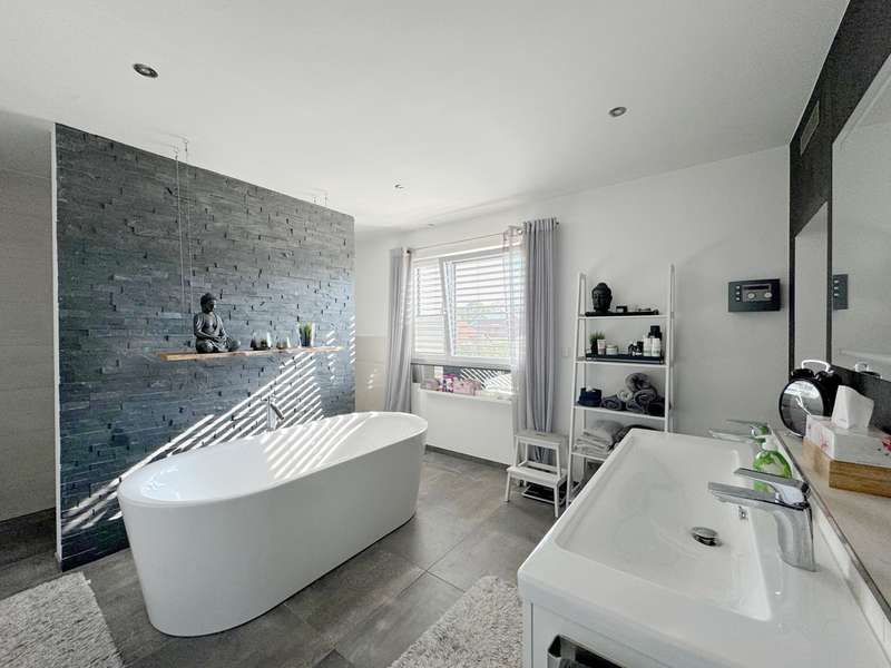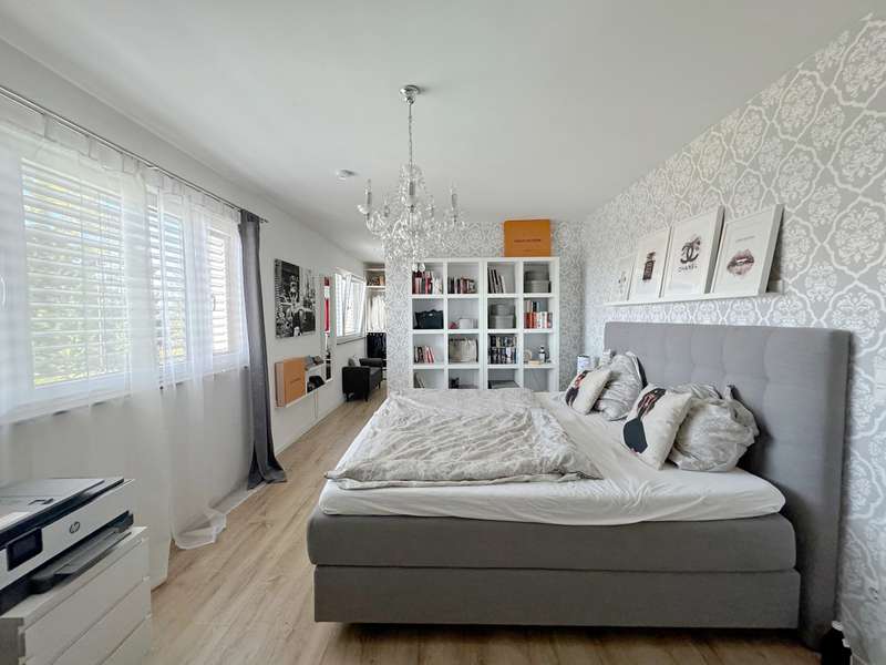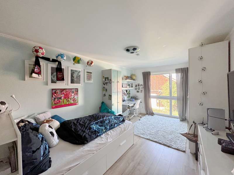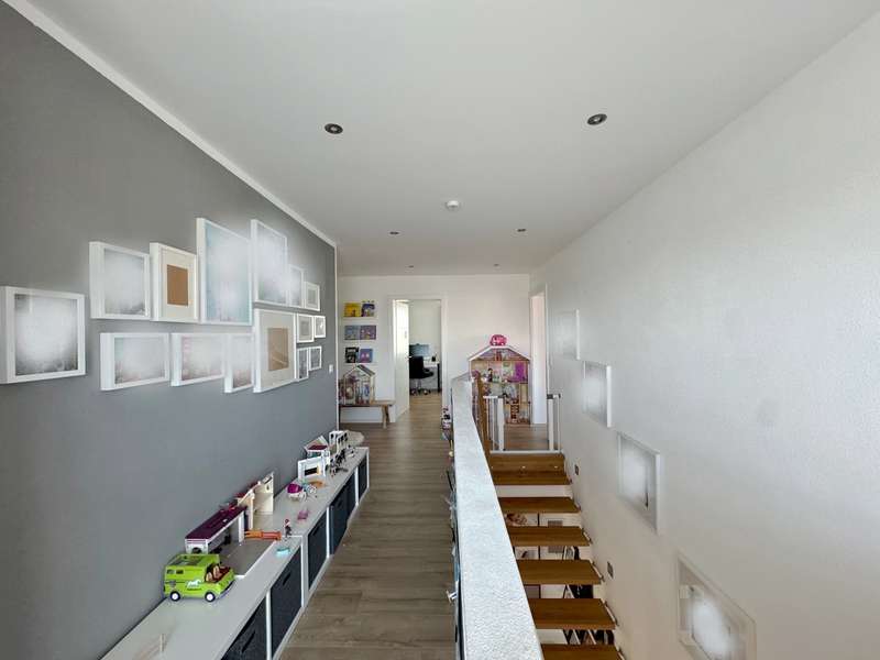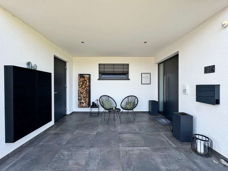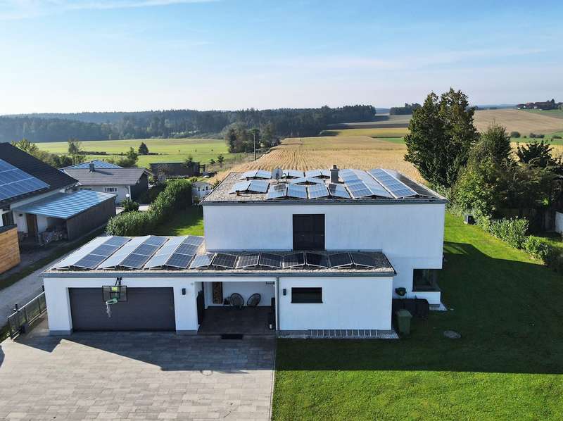 This modern and lovingly designed property, built in 2015, impresses on a generous plot of 1,570 m², idyllically situated on the outskirts of a village in the municipality of Adlkofen. The detached house with an impressive living space of 230 m² not only offers far-reaching views of the picturesque hilly landscape, but also plenty of space and options for a comfortable and contemporary lifestyle. As soon as you enter the house, you notice the open design: The spacious living area with an open kitchen invites you to enjoy convivial evenings. A special highlight is the elegant wood-burning stove, which provides cozy warmth. The high-quality materials such as large-format tiles and fine oak parquet flooring create a stylish atmosphere, which is complemented by lovely furnishing elements such as the cozy sitting window. The conservatory offers a wonderful transition from indoors to outdoors and lets plenty of light into the house. Outside, you will find a fantastic saltwater pool, perfect for warm summer days, as well as a charming garden playhouse for the little ones. The house is technically state-of-the-art: a powerful photovoltaic system with 28.12 Kwp covers a large part of the energy requirements, while a modern heat pump keeps the heating costs low. In addition, a decalcification system ensures soft water throughout the house. The aluminum-plastic windows with external blinds and venetian blinds offer optimum protection and comfort. A special wellness highlight is the sauna in the bathroom, which allows you to relax luxuriously within your own four walls. The video intercom system, the electric entrance gate and the double garage underline the features of the house. This spacious and perfectly planned detached house offers modern living comfort at the highest level - ideal for families who appreciate plenty of space, views and a lovingly designed environment.