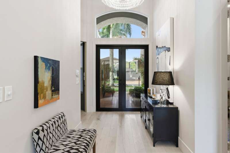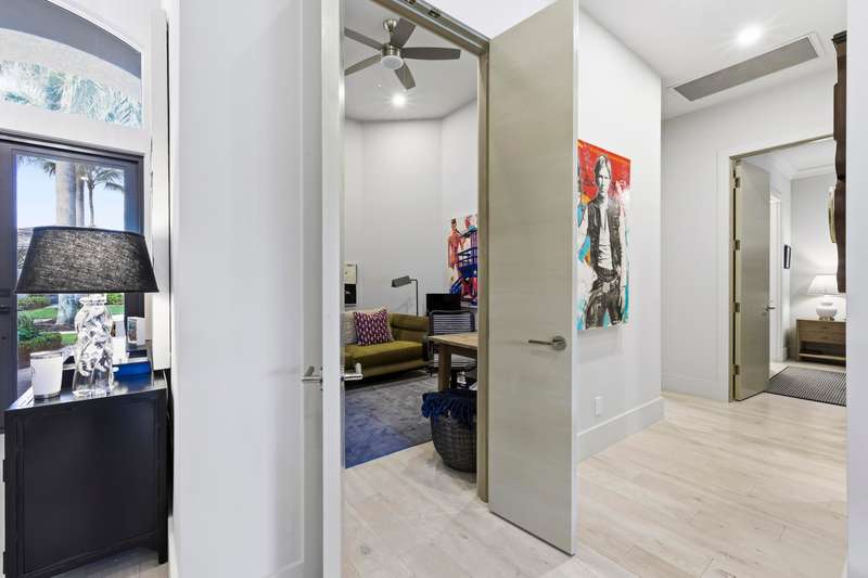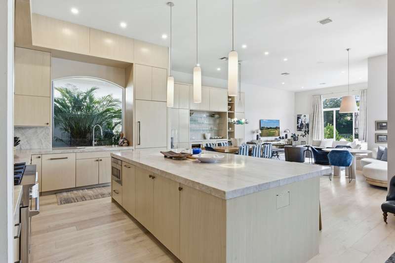 Welcome to sophisticated single-level living at its finest. This meticulously reimagined residence showcases over 1 million dollars in top designer renovations, that blend contemporary elegance with timeless luxury. Rich white oak flooring complemented by matching white oak doors. The kitchen has a show stopping chef's kitchen featuring an oversized Taj Mahal quartzite island, white oak cabinetry with loads of storage and pull out drawers. Premium appliances include 48'' Blue Star range, Sub-zero refrigerator, and Miele dishwasher. adjacent dining area with white oak bar, Taj Mahal counters and Zellige handmade tile backsplash with Sub-zero beverage and wine refrigerators. Custom closets in all suites, bathrooms in all suites. Impact windows and doors, new pool deck, retractable screens,