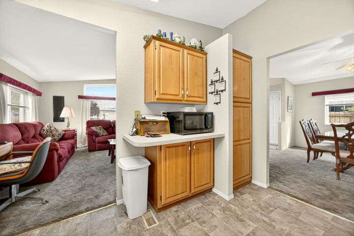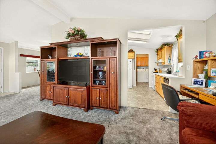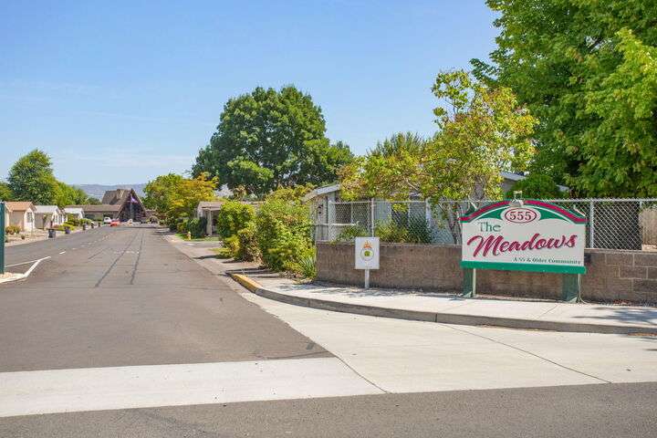 In the coveted Meadows 55+ community, this 1,512 sq. ft. home offers both comfort and convenience. Featuring 2 bedrooms, 2 bathrooms, a spacious office, and a dining room, the layout is ideal for everyday living. Vaulted ceilings, skylights, and ceiling fans enhance the airy atmosphere, while updates like exterior paint (2022), water heater (2020), and new gutter leaf covers provide peace of mind. A ramp leads to the front entry, and the covered back patio with tool storage is perfect for relaxing outdoors. The 2-car garage adds plenty of parking and storage space, and all appliances are included for easy move-in. Located on owned land with access to a clubhouse and pool, this well-maintained property offers an active and welcoming community lifestyle.