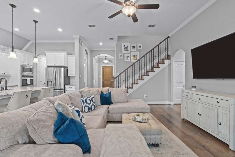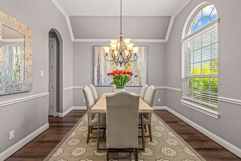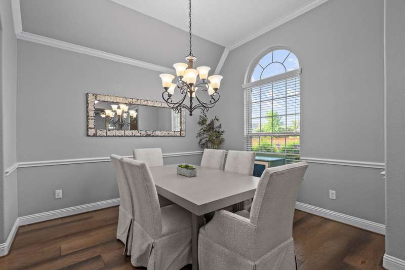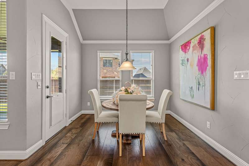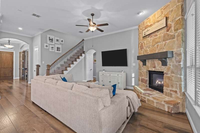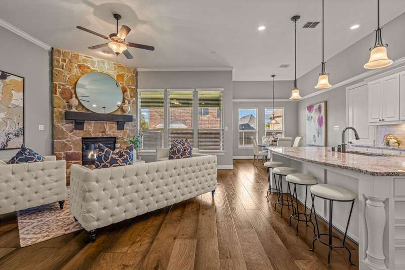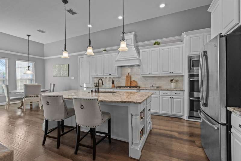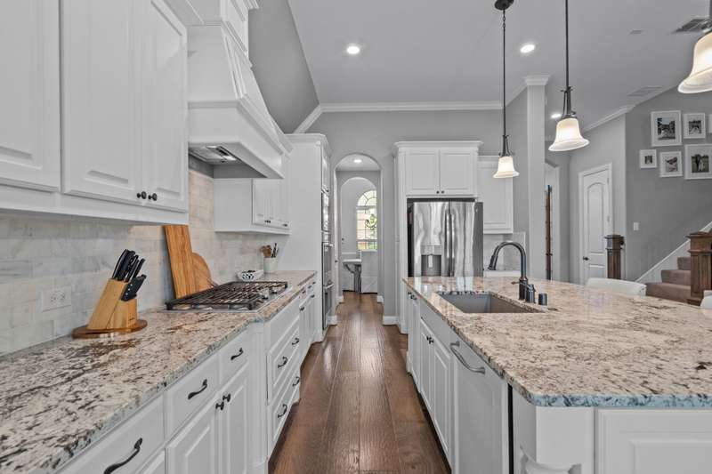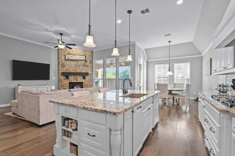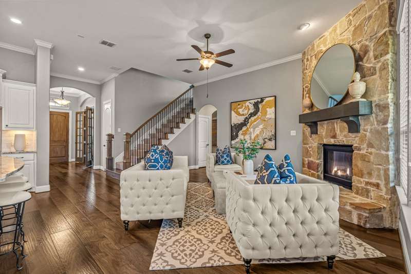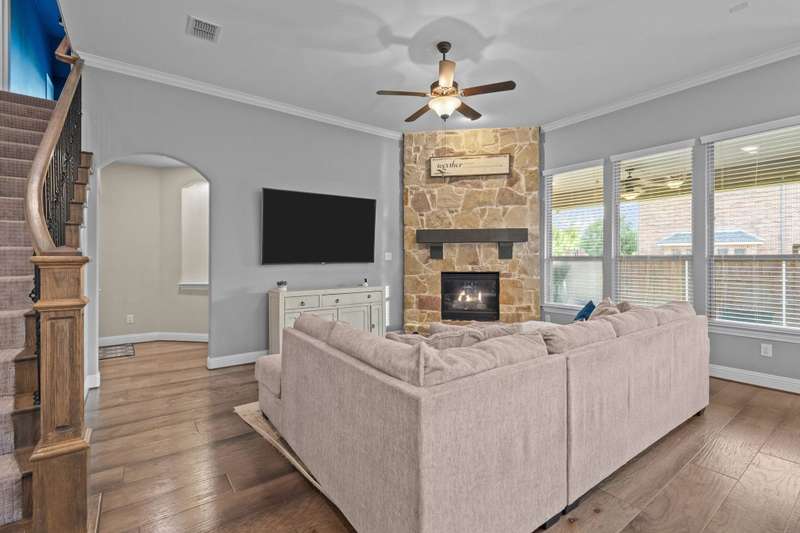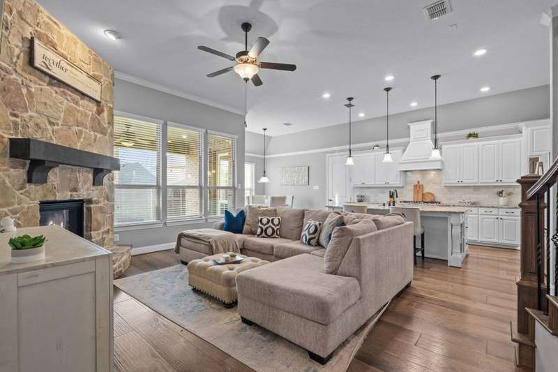 This beautifully designed 1.5-story home offers timeless elegance and flexible living. Rich hardwood floors flow throughout the main living areas, while the gourmet kitchen complete with a large center island, gas cooktop, double ovens, and crisp white cabinetryopens seamlessly to the family room, making it an entertainers dream. The versatile floor plan offers the option of 4 bedrooms or 3 bedrooms with an upstairs game room, ideal for a growing family or those needing flex space. The private primary suite is tucked at the rear of the home and features a spa inspired bath with dual vanities, a glass-enclosed shower and an oversized walk-in closet. Step outside to a covered patio perfect for dining, overlooking a spacious backyardready for play or future pool!