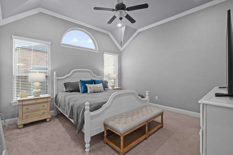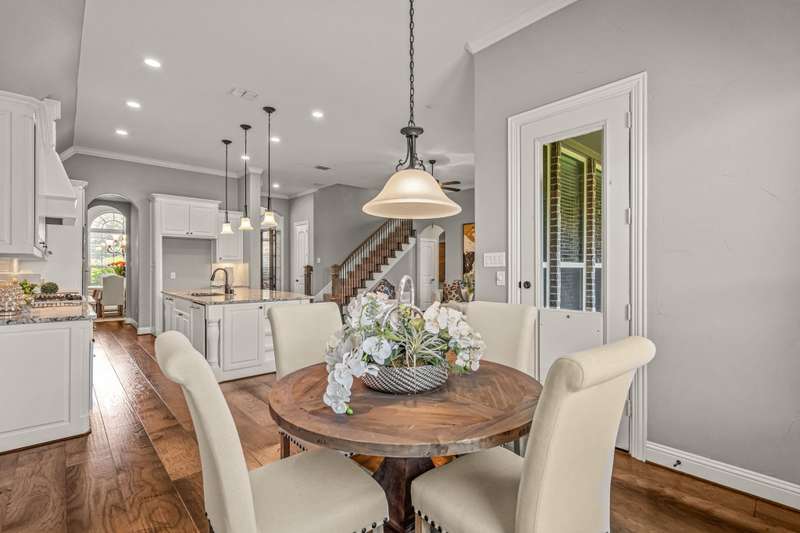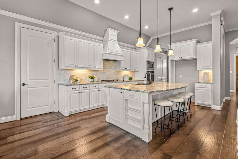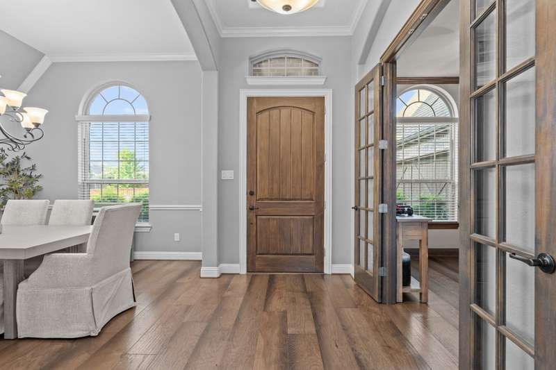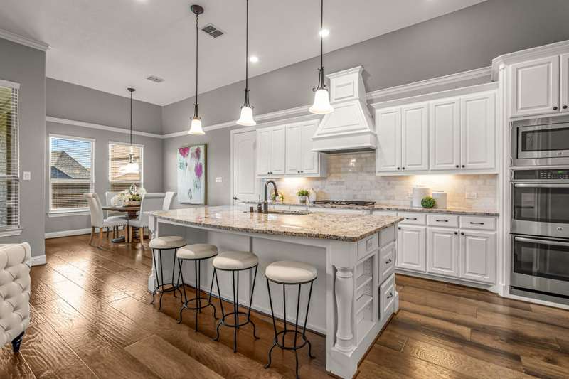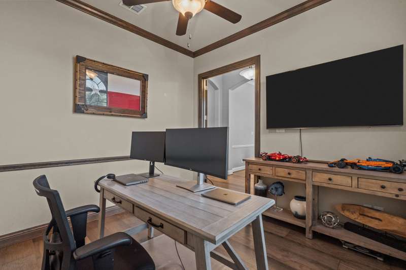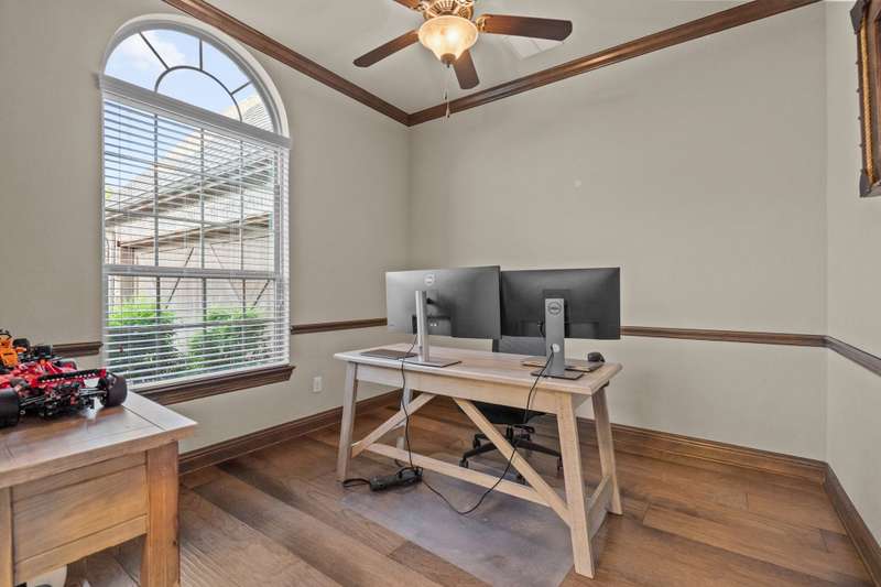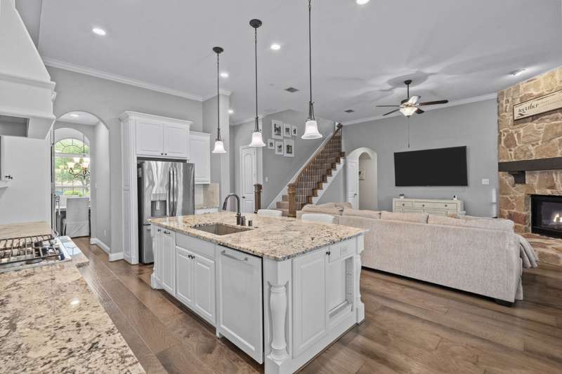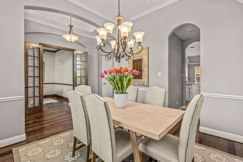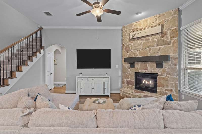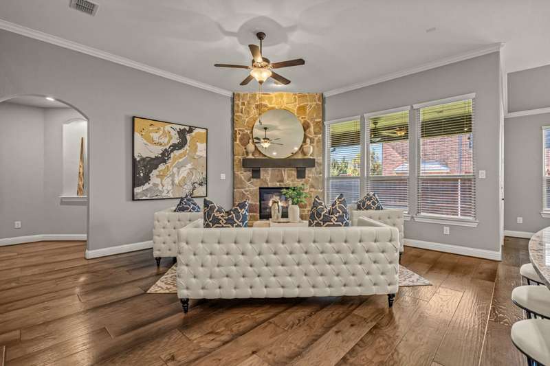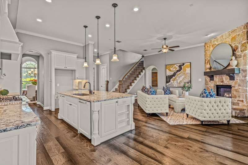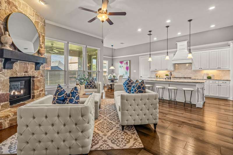 This beautifully designed 1.5-story home offers timeless elegance and flexible living. Rich hardwood floors flow throughout the main living areas, while the gourmet kitchen complete with a large center island, gas cooktop, double ovens, and crisp white cabinetryopens seamlessly to the family room, making it an entertainers dream. The versatile floor plan offers the option of 4 bedrooms or 3 bedrooms with an upstairs game room, ideal for a growing family or those needing flex space. The private primary suite is tucked at the rear of the home and features a spa inspired bath with dual vanities, a glass-enclosed shower and an oversized walk-in closet. Step outside to a covered patio perfect for dining, overlooking a spacious backyardready for play or future pool!