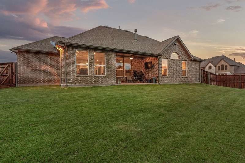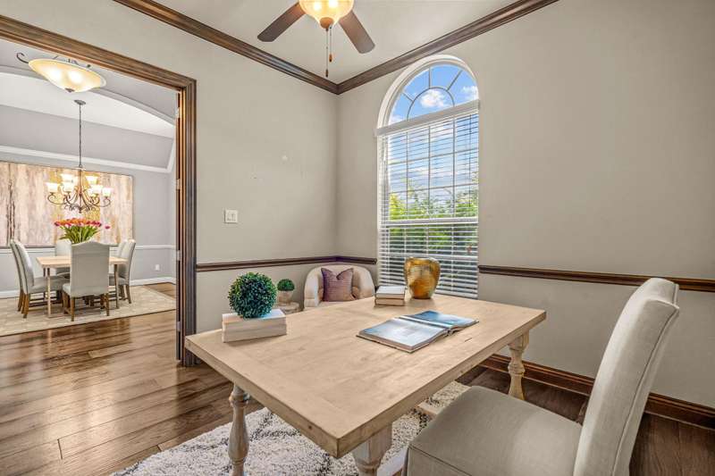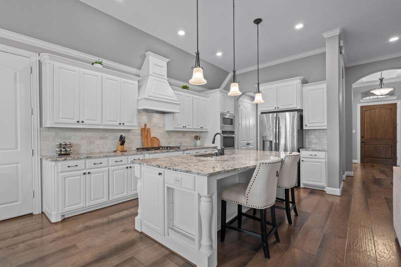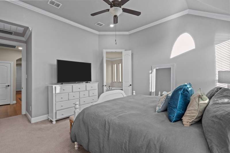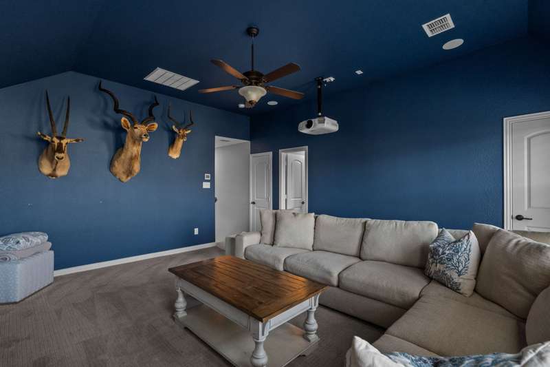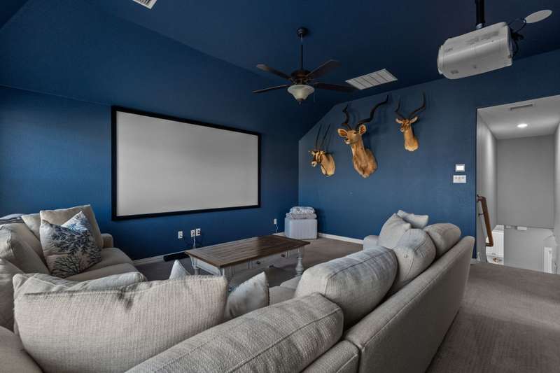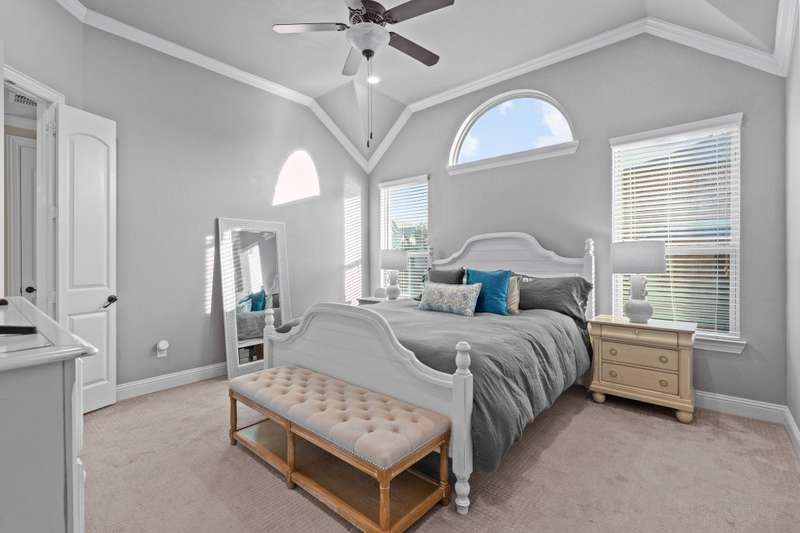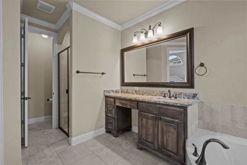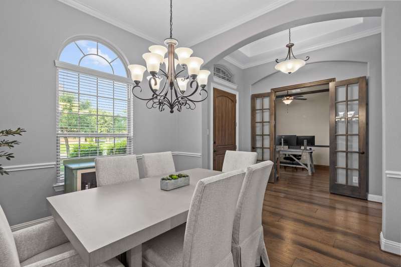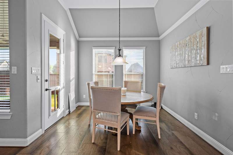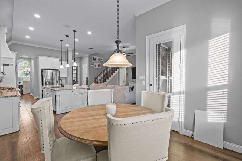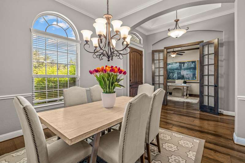 This beautifully designed 1.5-story home offers timeless elegance and flexible living. Rich hardwood floors flow throughout the main living areas, while the gourmet kitchen complete with a large center island, gas cooktop, double ovens, and crisp white cabinetryopens seamlessly to the family room, making it an entertainers dream. The versatile floor plan offers the option of 4 bedrooms or 3 bedrooms with an upstairs game room, ideal for a growing family or those needing flex space. The private primary suite is tucked at the rear of the home and features a spa inspired bath with dual vanities, a glass-enclosed shower and an oversized walk-in closet. Step outside to a covered patio perfect for dining, overlooking a spacious backyardready for play or future pool!
