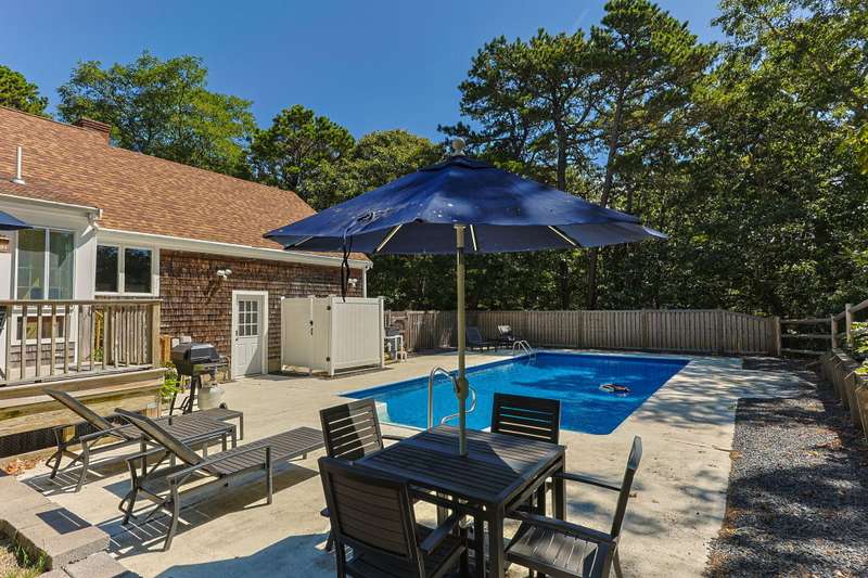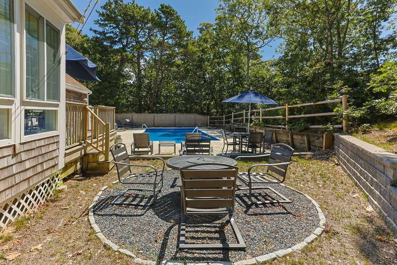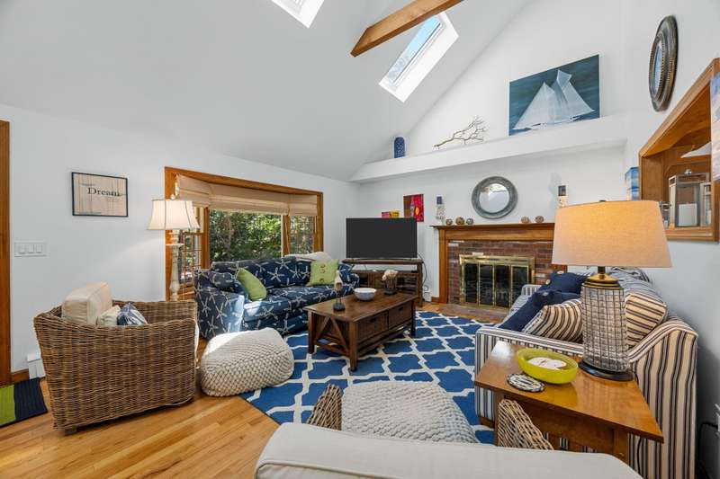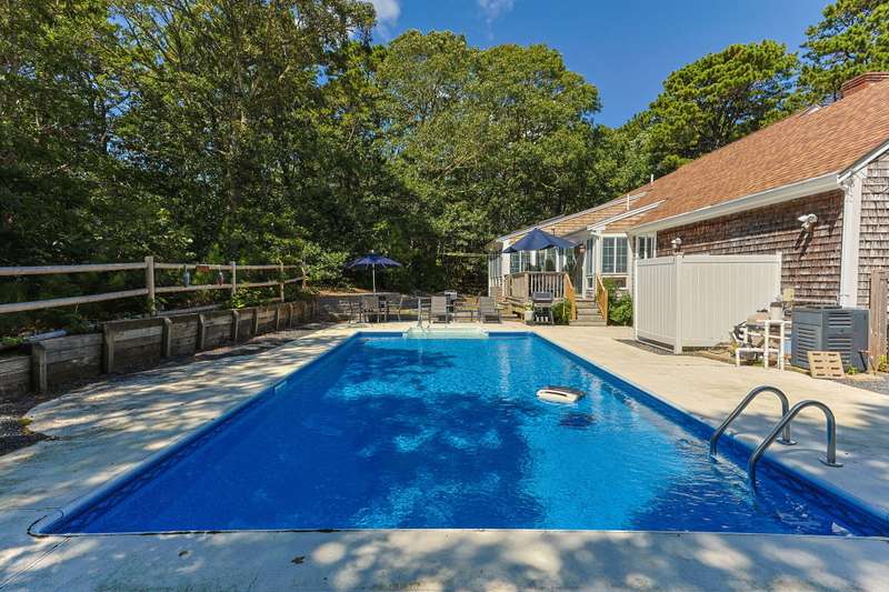 Tucked away on a quiet cul-de-sac, this inviting 3-bedroom, 2-bath ranch offers the perfect blend of comfort and coastal charm. The vaulted living room, enhanced by skylights and a cozy fireplace, creates a bright and welcoming gathering space. A sunroom with a warming stove overlooks the private backyard, while the spacious deck and sparkling pool are ideal for summer living and entertaining. The lower level includes an exercise room, abundant storage, and excellent potential for additional living space. With a newer roof and a quiet setting close to the beach, this home offers privacy, convenience, and an easy Cape Cod lifestyle