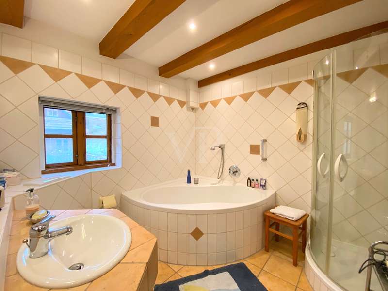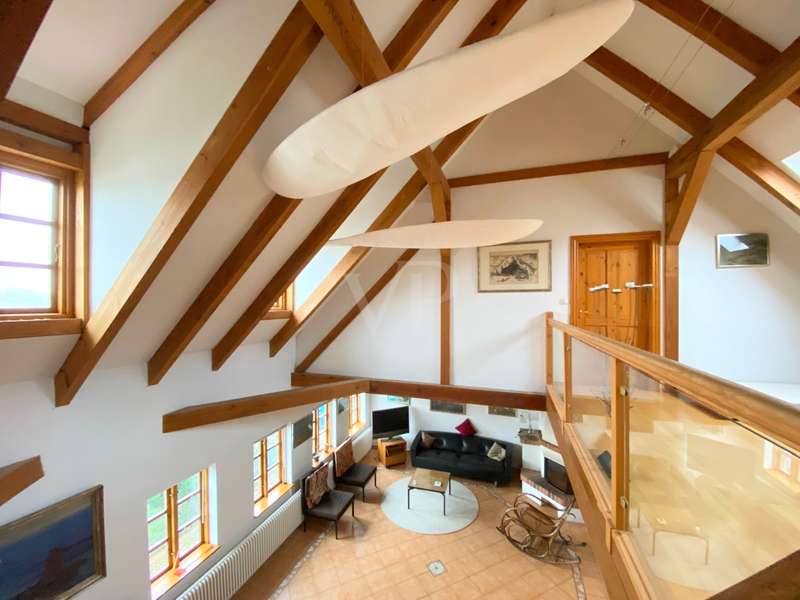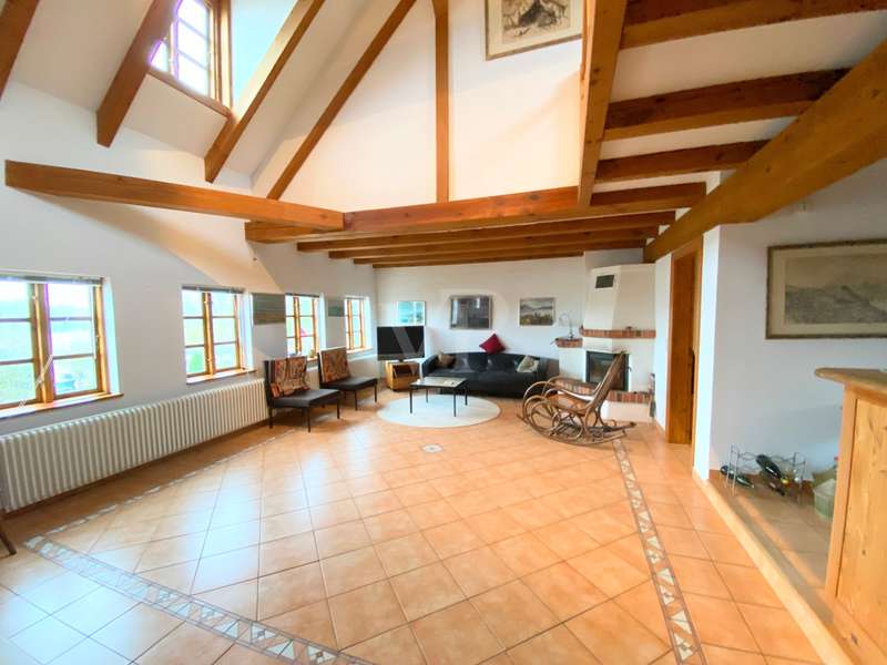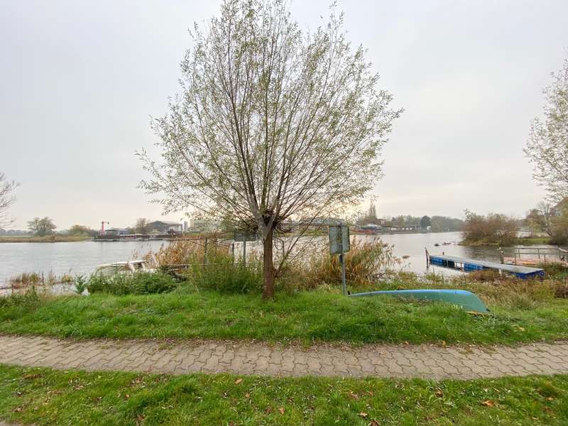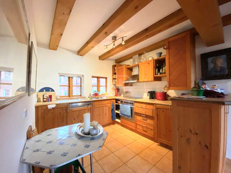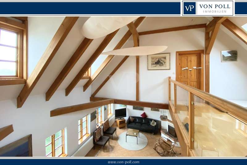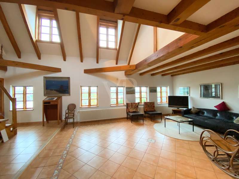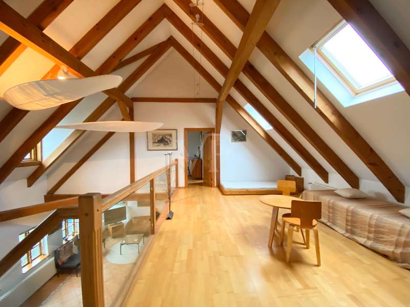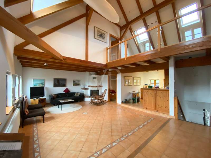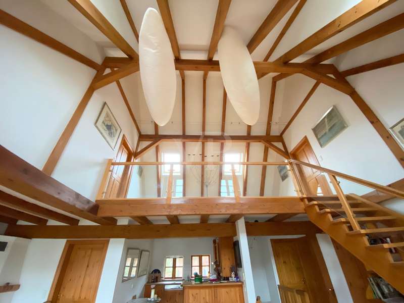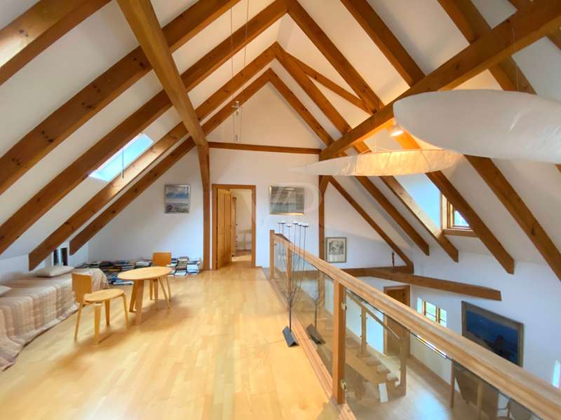 The two-family house was built as a half-timbered house around 1900 and was extensively renovated in 1996. All modernizations have been carried out in accordance with the monument protection. The property is located in the Köperberg monument protection area. On the entire ground floor there is a 3-room apartment with a conservatory and a terrace facing the courtyard, which is currently rented. We will be happy to provide details and further information on this later. On the upper floor and attic there is another apartment with a total of 5 rooms and a gallery level. There are 4 bedrooms, 2 of which are on the upper floor and are wheelchair accessible. 2 more bedrooms are on the top floor, which can be reached via a staircase from the living room. Very high ceilings in the living area with fireplace give the listed half-timbered house an extravagant and cozy atmosphere. The modern kitchen has a stove and dishwasher. There are a total of 3 Mediterranean-style bathrooms. A bathroom with a corner bath, the other bathrooms are shower rooms. There is also a guest toilet upstairs. On the ground floor and first floor, underfloor heating is laid under a Mediterranean-style tiled floor. A special highlight is the approx. 400 m² large garden plot, which is located between the property and the promenade directly on the Havel. There are 2 parking spaces in the front area. On the garden plot there is a garden house and a boat. You can get directly to the Havel via the promenade and can also launch a boat there.