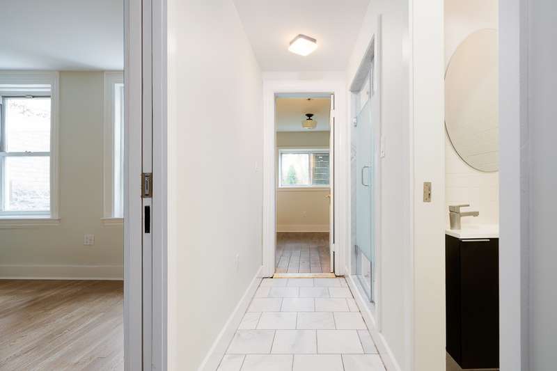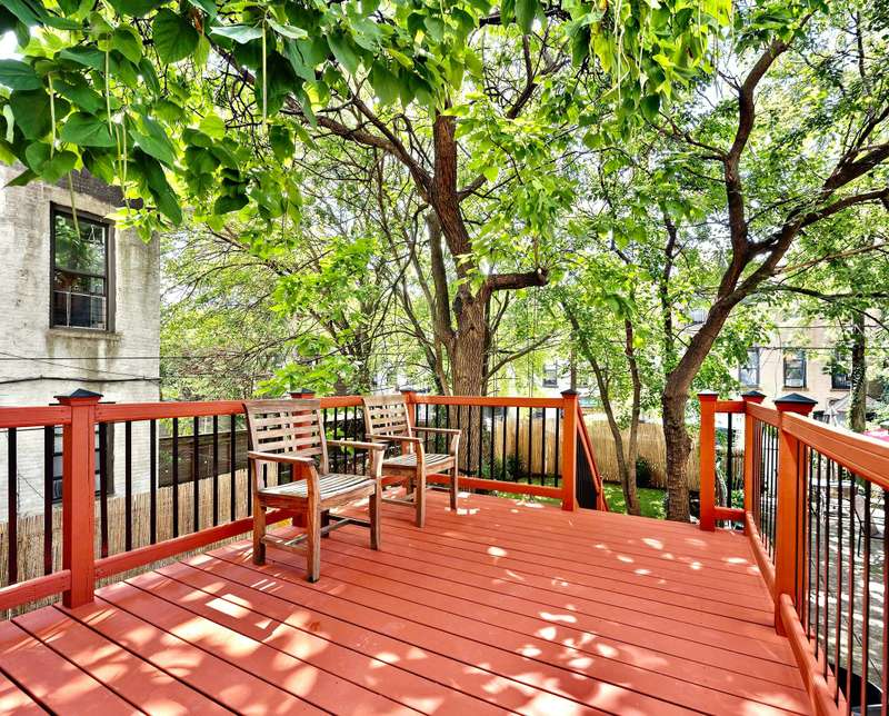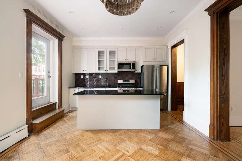 The parlor level welcomes you with soaring ceilings, original inlaid parquet floors, and elegant bay windows that fill the front parlor with natural light. The chef's kitchen, designed with both style and function in mind, opens onto a sunny deck overlooking a sprawling private backyard, perfect for entertaining or quiet relaxation.