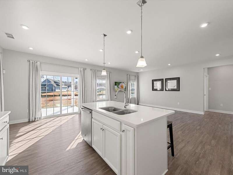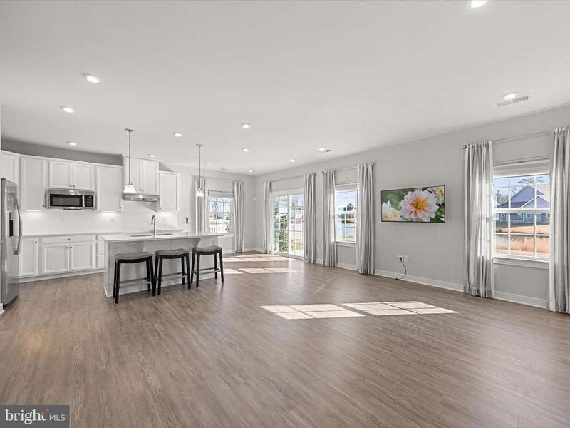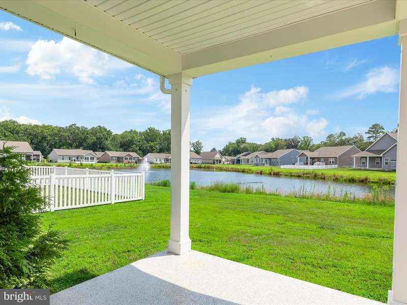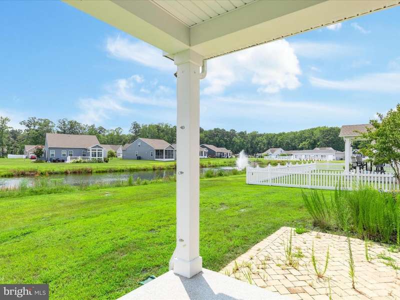 This stunning former model home, built in 2020, is perfectly positioned on a tranquil pond in the sought-after Fox Haven community. Offering low HOA fees and the convenience of on-site RV and boat storage for a minimal fee, this community provides an exceptional coastal lifestyle. Located in Frankford, it is just minutes from Route 54, Harris Teeter in Bayside, the Freeman Arts Pavilion, Fenwick Island's pristine beaches, Ocean City, and an array of superb dining options. Designed for both entertaining and everyday comfort, this one-level home boasts an inviting open-concept layout. At the heart of the home is a gourmet kitchen, featuring sleek quartz countertops, an expansive island with pendant lighting, a classic subway tile backsplash, and a pantry for ample storage. The adjacent dining area enhances the home's charm, making it perfect for gatherings and special occasions. A wall of glass sliding doors leads to a covered patio with a stylish epoxy finish, stepping down to a beautifully designed paver patio-ideal for relaxing and enjoying the peaceful pond views. Throughout the main living area, stylish designer window treatments complement durable LVP flooring, while recessed lighting and a neutral color palette add warmth and sophistication. The private primary suite offers a spacious walk-in closet, a dual-sink vanity, and a stall shower. Two additional bedrooms at the front of the home provide generous space for family or guests. Additional highlights include a Nest thermostat, a two-car garage with an epoxy-coated floor, a dedicated storage area, and a convenient side entry door. Fox Haven's resort-style amenities, including a community pool, clubhouse, and fitness room, further enhance its appeal. With plenty of storage and a perfect blend of style and convenience, this exceptional home offers modern coastal living at its best, just a short drive to Fenwick Island, Ocean City, the Freeman Arts Pavilion, and local shopping and dining.