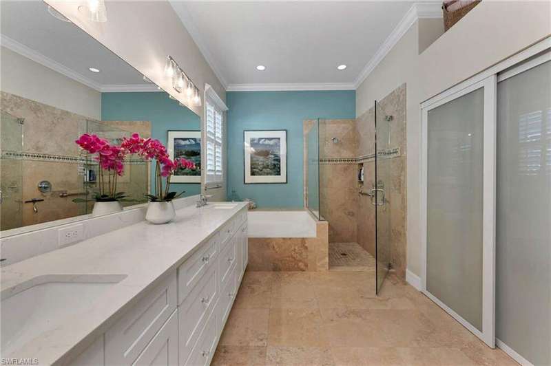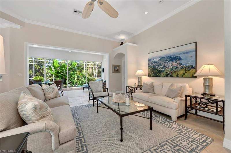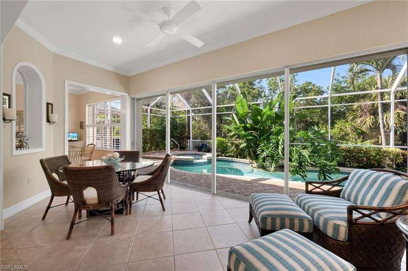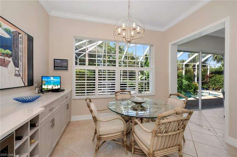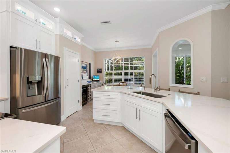 Recently renovated in 2023, this light and airy residence in Bay Harbor at Bonita Bay offers high-end finishes and impressive upgrades throughout. The thoughtful layout maximizes the overall space by adding multiple living areas, providing versatility for both relaxation and entertaining. The kitchen is a standout, featuring quartz countertops, an elegant backsplash, new cabinetry, pull-out pantry drawers, lighted upper cabinets, and a retractable countertop plug for added convenience. A built-in buffet with cabinetry and quartz countertops, perfect for casual meals or grand soirees, enhances the breakfast area. The formal dining room has been transformed into a cozy sitting area ideal for watching TV or having relaxed conversations. The expansive great room flows seamlessly into yet another dining and casual seating area, offering effortless access to the lanai and creating a true indoor-outdoor living experience. The screened lanai has been transformed into a private tropical paradise overlooking the preserve, featuring a lagoon-style pool and spa surrounded by pavers. The renovated bathrooms showcase quartz countertops, new cabinetry, and glass-enclosed showers, while the primary bath includes a separate shower and tub, creating a luxurious spa-like atmosphere. Additional updates include newer roof (2019), LED lighting, upgraded light switches, and refreshed landscaping, all contributing to the home's modern appeal. The laundry room is equipped with a washer, dryer, and laundry sink for added convenience. Hurricane protection is installed on all windows and doors, including impact glass and/or electric and manual shutters, ensuring peace of mind. This outstanding property perfectly combines luxury, comfort, and privacy in a tranquil, exceptional setting.