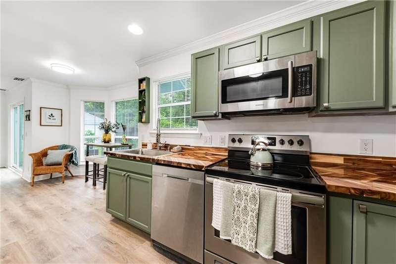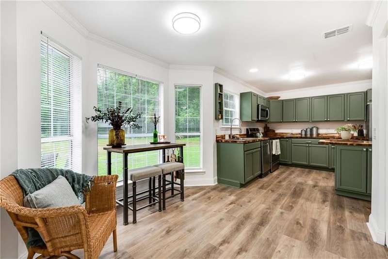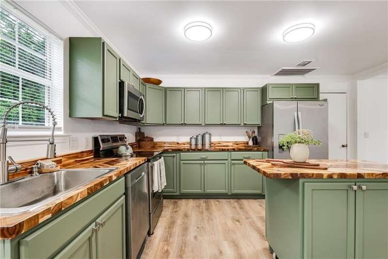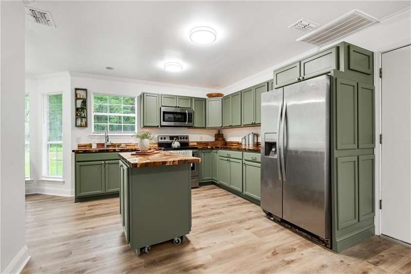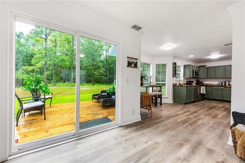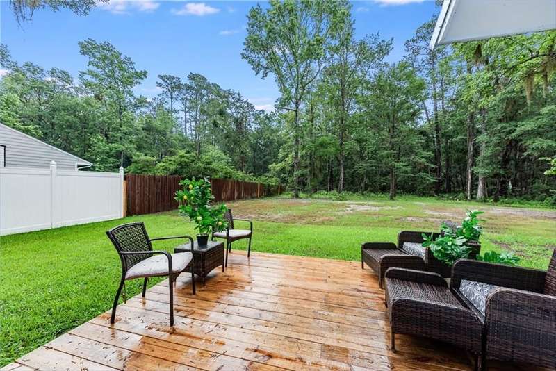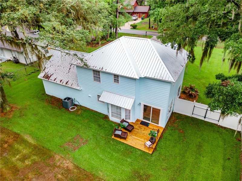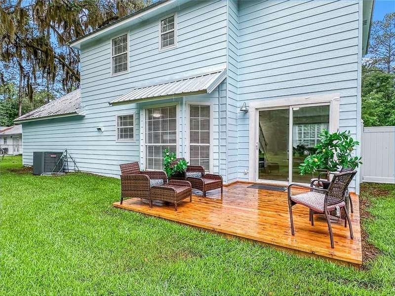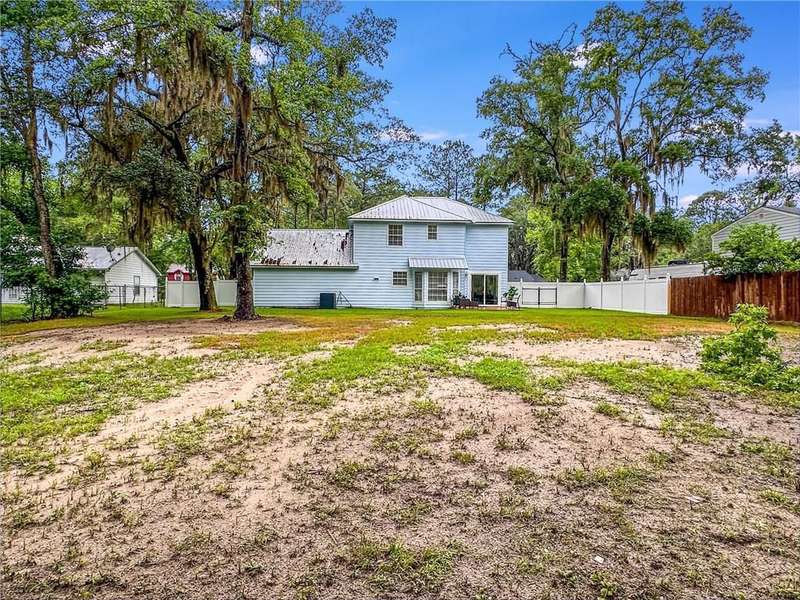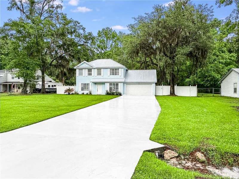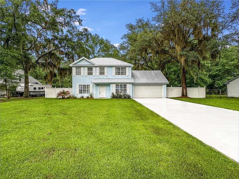 1-Year AHS Home Warranty Included! This beautifully updated 3-bedroom, 2.5-bath home sits on approximately half an acre surrounded by moss-draped oaks in the peaceful Harrietts Bluff community—just 15 minutes from NSB Kings Bay. Step inside to find new LVP flooring throughout the main level and owner’s suite, plus new carpet in the two upstairs bedrooms. The kitchen features chevron-patterned butcher block countertops, a movable island, stainless steel appliances, and cabinetry painted in a warm, woodsy green. A custom walk-in pantry with open stained shelving is both functional and stylish—pretty enough to leave the doors open. Enjoy both a formal dining room and a breakfast nook with a bay window overlooking the backyard. A renovated half bath on the main floor adds guest convenience, while the living room opens through new sliding glass doors to a spacious back deck and fenced yard, perfect for outdoor entertaining. Upstairs, the owner’s suite showcases a tray ceiling, walk-in closet, and a renovated bath with double vanity, tiled shower, slipper tub, and wood-look tile flooring. The guest bath also features a unique tiled shower and matching wood-look tile. Additional highlights include crown molding throughout, a two-car garage with cabinets and laundry hookups, washer and dryer conveying with the property, a tankless water heater, new HVAC, and a metal roof. The freshly sealed garage floors add a clean, finished look. Located in Flood Zone X (no flood insurance required) and outside city limits (no city taxes), this property offers practical value with a serene setting. You’re just minutes from the Harrietts Bluff deep-water boat ramp and less than 10 minutes to Kingsland amenities—including Chick-fil-A! This home blends comfort, convenience, and style—with all the major upgrades compete!