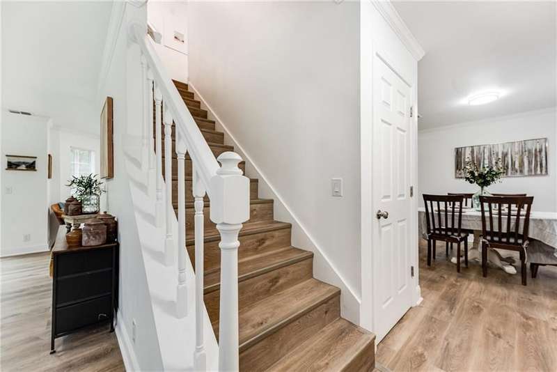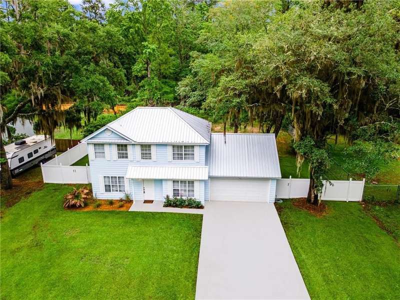 Recently INspected and Repaired-AHS Warranty offered! Updated 3-bedroom, 2.5-bath home on approximately half an acre, surrounded by moss-draped oaks in a quiet Harrietts Bluff neighborhood-just 15 minutes to NSB Kings Bay. Inside, youll find new LVP flooring throughout the main level and owners suite, with new carpet in the two upstairs guest bedrooms. The kitchen features chevron-patterned butcher block countertops, a movable island, stainless steel appliances, and cabinets painted in a warm woodsy green. The custom walk-in pantry includes open stained wood shelving-attractive enough to leave the doors open. The dining room is just off the kitchen, along with a breakfast nook that includes a bay window overlooking the backyard. A renovated half bath on the main floor adds convenience for guests. The living area has new sliding glass doors that lead to a spacious back deck and fenced yard-great for outdoor entertaining. Upstairs, the owners suite features a tray ceiling, walk-in closet, and a renovated bath with double vanity, a tiled shower, slipper tub, and wood-look tile floors. The guest bath also has wood-look tile and a unique tiled shower. Additional features include crown molding throughout, a two-car garage with storage cabinets and laundry hookups, a new tankless water heater, and new HVAC system. The new metal roof and freshly sealed garage floors add to the value. Located in Flood Zone X, no flood insurance is required. There are no city taxes, and youre just a few miles to the public boat ramp with deep water at Harrietts Bluff and less than 10 minutes to Kingsland amenities and Chick-fil-A. This home blends comfort, convenience, and style with practical upgrades already in place.