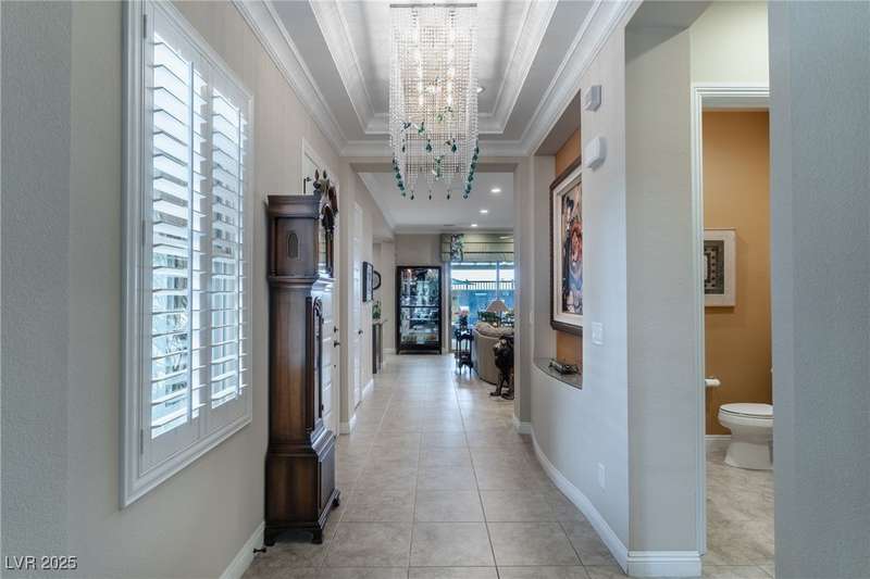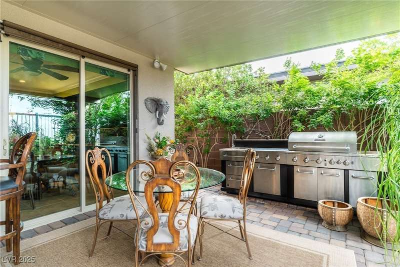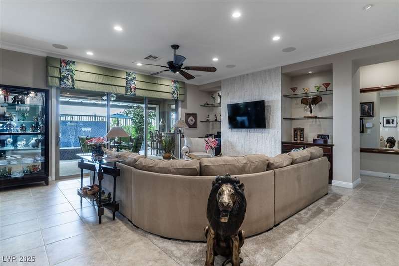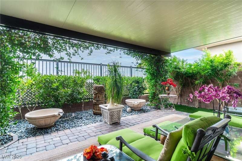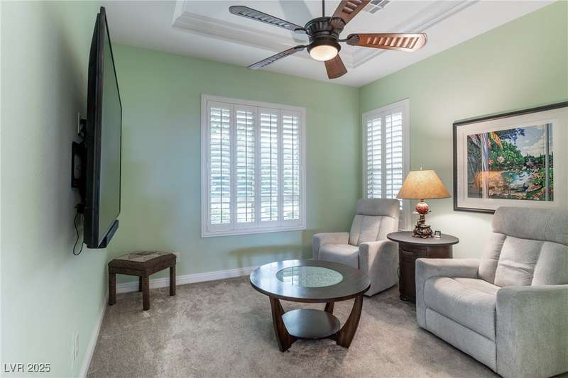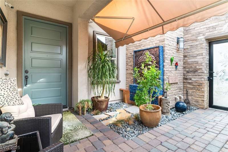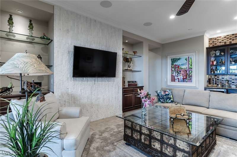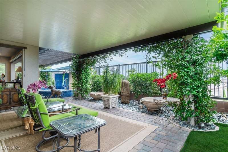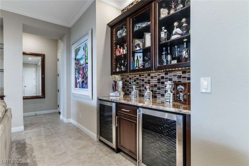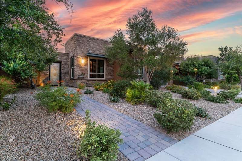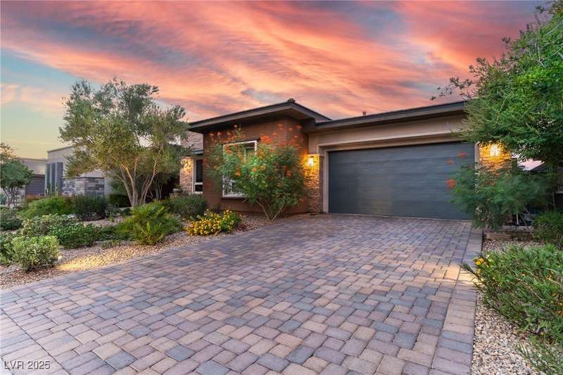 Stunning single story Toll Brothers home in the guard gated Regency community in Summerlin with breathtaking city lights & mountain views. 2 bedrooms +office, 2.5 bathrooms, & luxury upgrades throughout. Gourmet kitchen with high end stainless appliances, granite counters, walk in pantry, ice maker, & upgraded Cherry Heritage Mocha cabinets. Spacious great room with surround sound, wet bar & 2 wine fridges. Primary suite with custom tile shower, double sinks & walk-in closet. Designer Legacy rectified tile, maple carpet in bedrooms, shutters, crown molding, soft-close doors/cabinets, & designer fixtures. Gorgeous front courtyard. Backyard paradise with custom spa & waterfalls, built-in BBQ and fridge, covered patio with solar shades, added pavers & walkway. 2-car garage with epoxy floor, built-in shelves & storage racks. Alarm system & cameras. Steps from the clubhouse, pool, fitness, pickleball & tennis. Resort-style living at its finest.