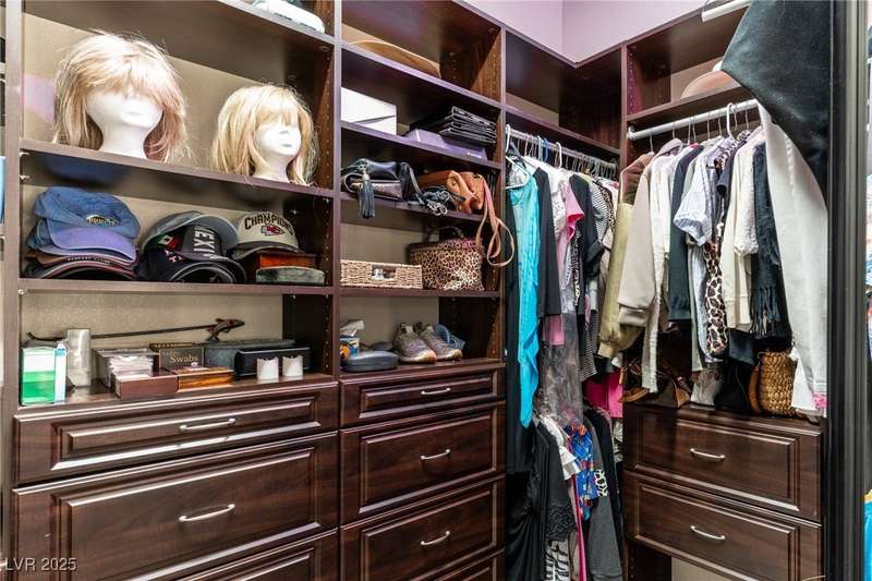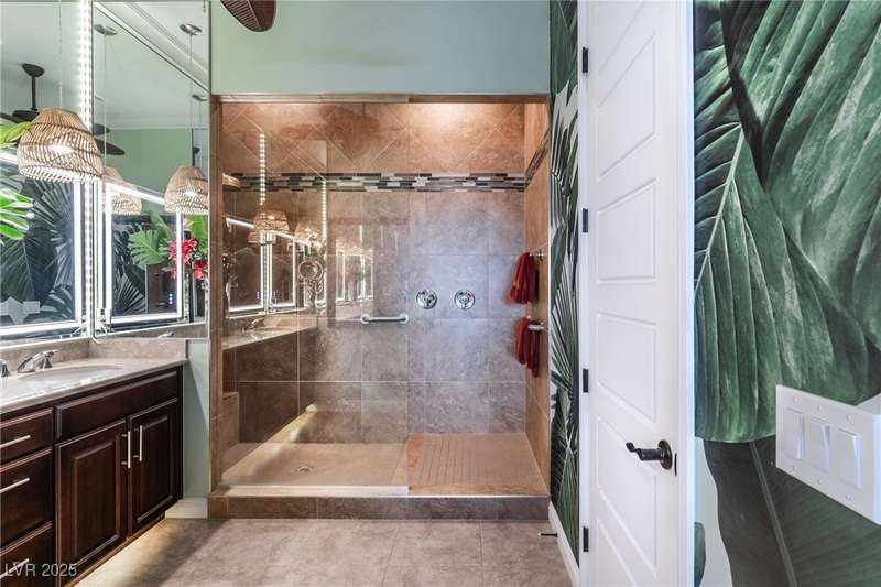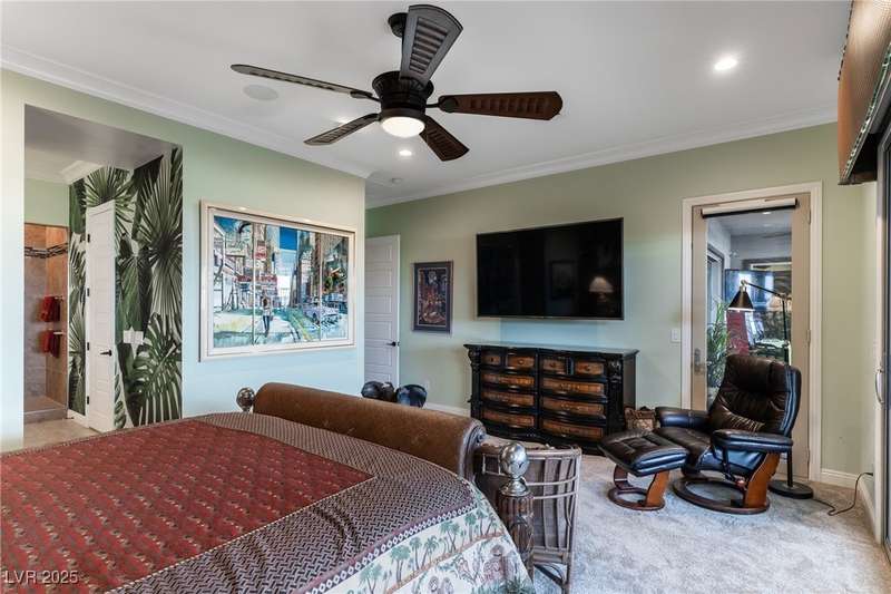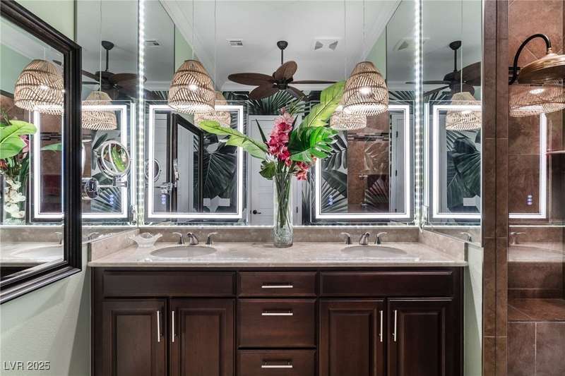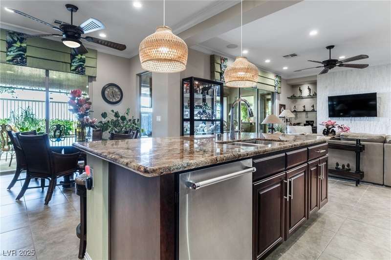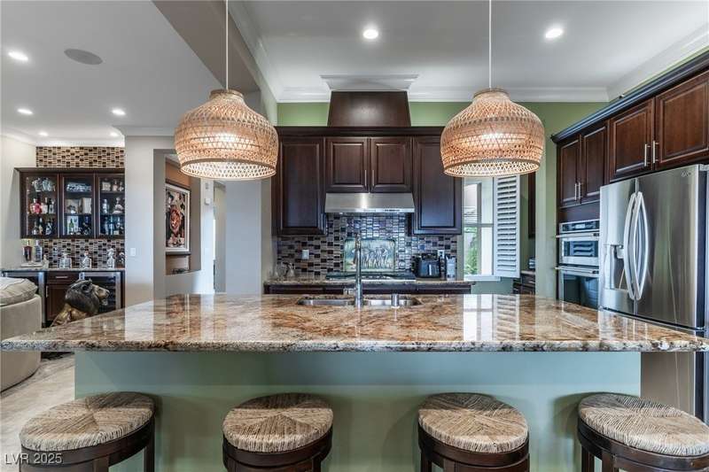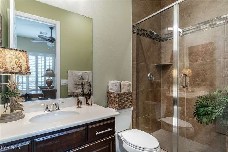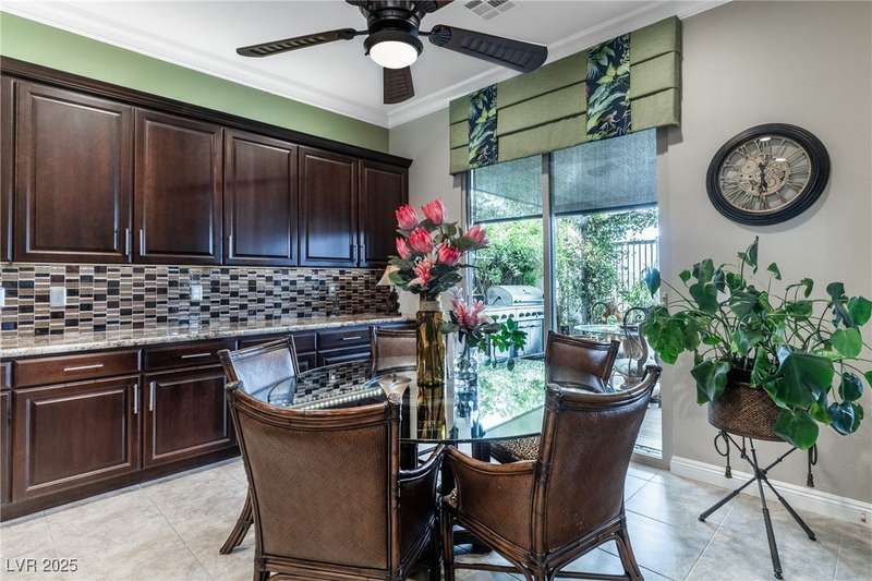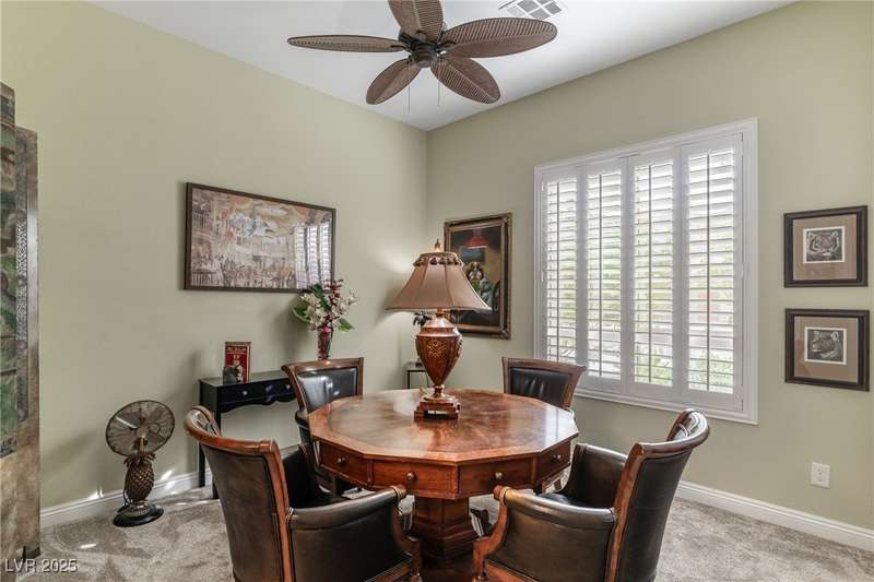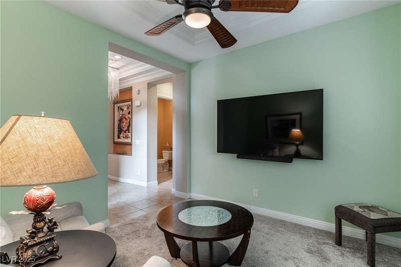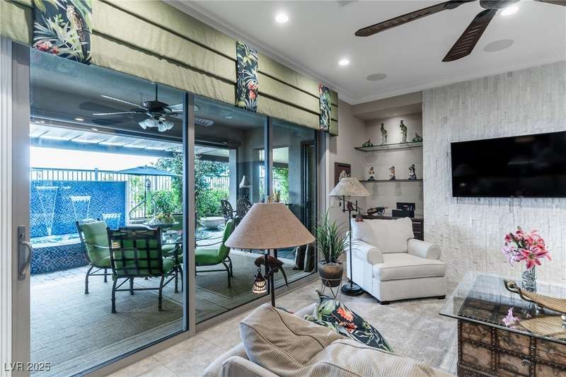 Stunning single story Toll Brothers home in the guard gated Regency community in Summerlin with breathtaking city lights & mountain views. 2 bedrooms +office, 2.5 bathrooms, & luxury upgrades throughout. Gourmet kitchen with high end stainless appliances, granite counters, walk in pantry, ice maker, & upgraded Cherry Heritage Mocha cabinets. Spacious great room with surround sound, wet bar & 2 wine fridges. Primary suite with custom tile shower, double sinks & walk-in closet. Designer Legacy rectified tile, maple carpet in bedrooms, shutters, crown molding, soft-close doors/cabinets, & designer fixtures. Gorgeous front courtyard. Backyard paradise with custom spa & waterfalls, built-in BBQ and fridge, covered patio with solar shades, added pavers & walkway. 2-car garage with epoxy floor, built-in shelves & storage racks. Alarm system & cameras. Steps from the clubhouse, pool, fitness, pickleball & tennis. Resort-style living at its finest.