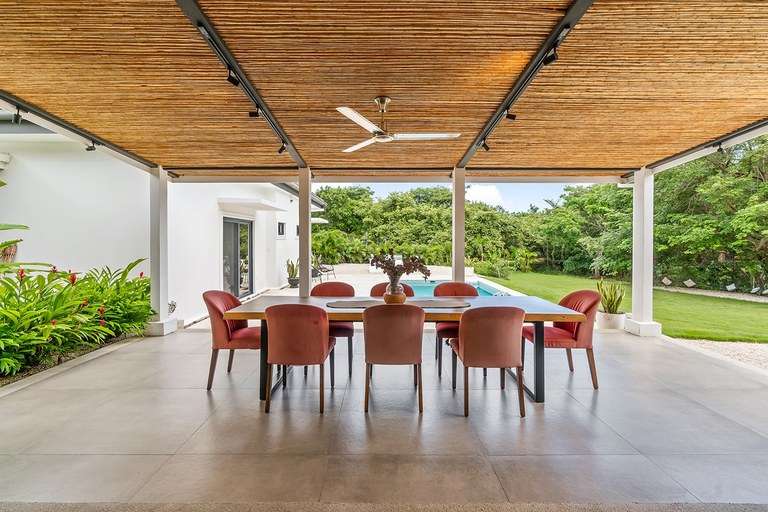 Nestled in Hacienda Pinilla's prestigious Reserva de Golf, this newly built (Nov 2022) luxury home offers 3,649 sq. ft. of air-conditioned living space on a private half-acre lot next to a seasonal stream. The elevated pad ensures optimal drainage, and a covered outdoor dining area inspired by Valencia overlooks a creek frequented by deer. Enjoy a newly installed sauna, cold plunge, and a 226 sq. ft. pool with a 477 sq. ft. covered patio. The layout is designed for both family living and rental potential, with space for a separate casita with its own entrance. A 103 sq. ft. garage adds convenience. The home backs onto an additional half-acre of unbuildable green space, providing over an acre of exclusive enjoyment. Residents have access to world-class surf spots, an 18-hole golf course, bike trails, a beach club, and the JW Marriott with five restaurants and the largest pool in Central America. Just 15 minutes from Playa Tamarindo and 1 hour from Liberia International Airport (LIR).