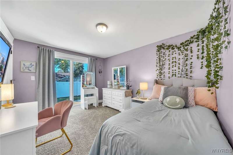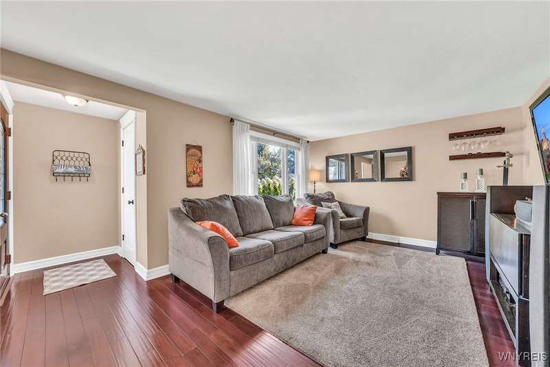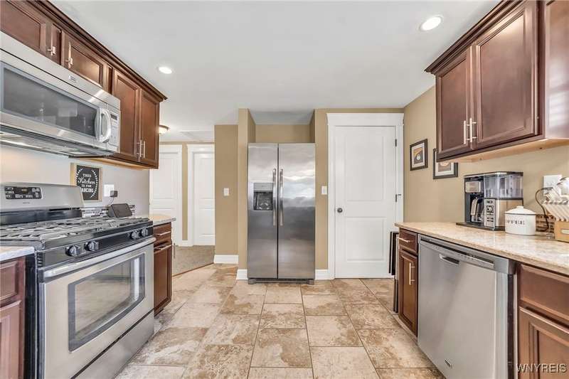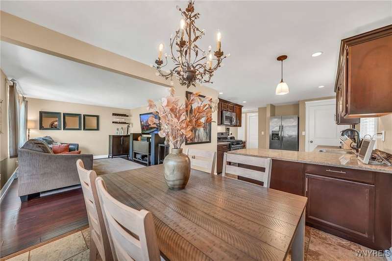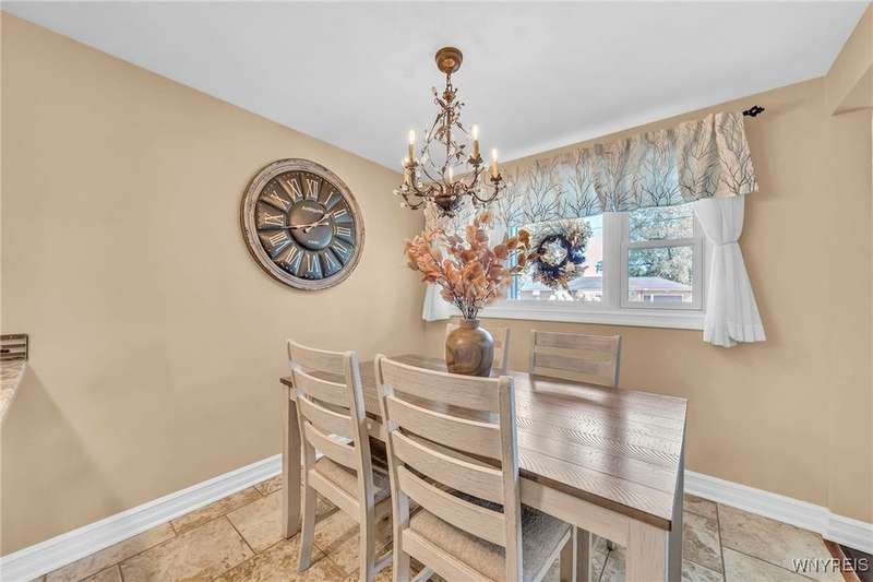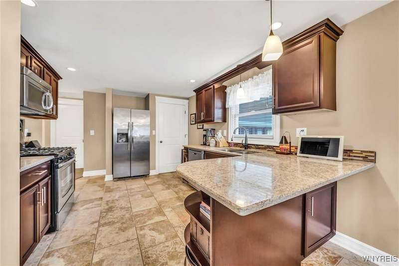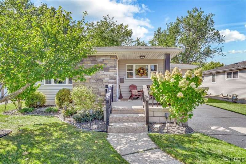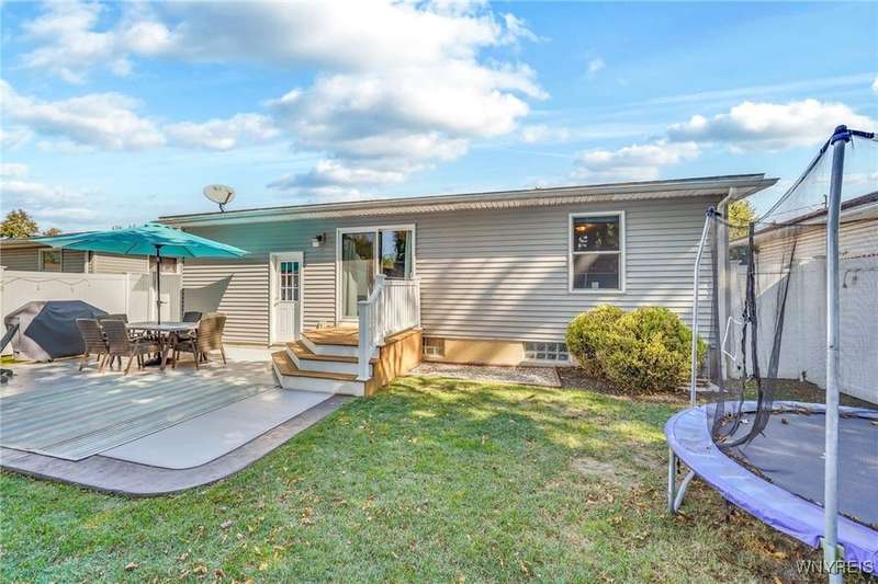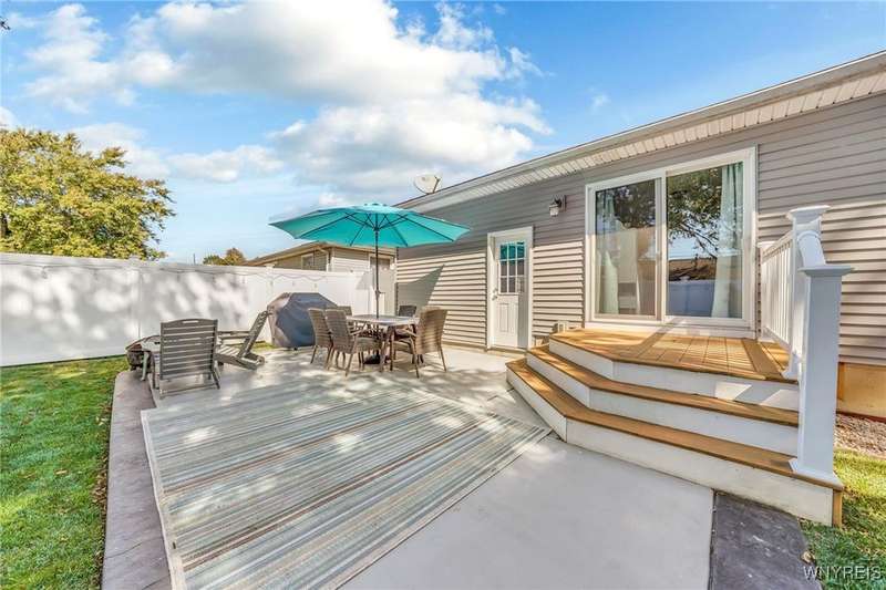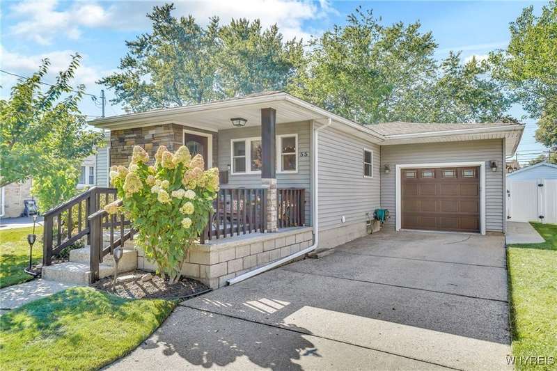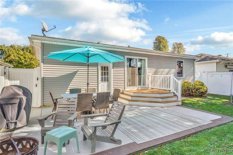 Charming three-bedroom ranch with an inviting open front porch and beautifully updated interior. The living room features bamboo flooring, while the modern kitchen offers recessed lighting, ceramic tile floors, glass backsplash, quartz countertops, cherry Java cabinetry, and stainless steel appliances. The updated bathroom includes a ceramic tile floor. Three bedrooms with wall-to-wall carpeting provide comfort and style throughout. Outside, enjoy a fully fenced yard with deck and concrete patio. Additional highlights include a resurfaced garage floor by Proshield Concrete Coatings, one-car attached garage, central air, and flagstone detail at the front of the home. Conveniently located within walking distance to parks, playgrounds, youth bureau, senior center, shops, restaurants, and schools. This home is immaculate with nothing to do but move in! Showings start immediately. Offers will be entertained Wednesday 10/8/25 at 3pm.