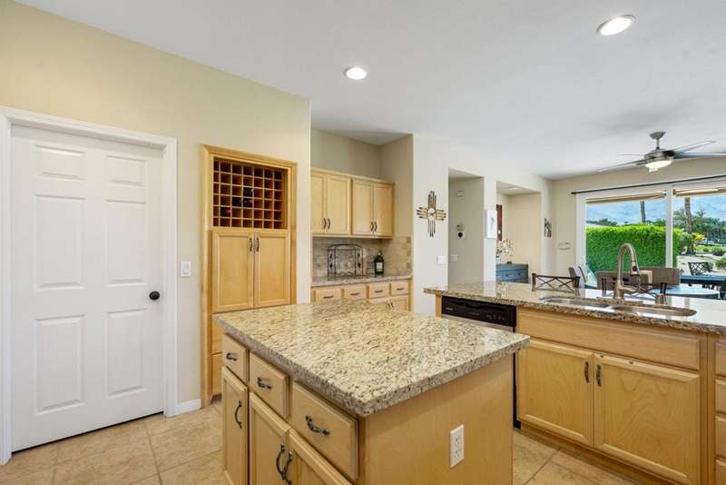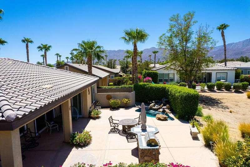 Welcome to your dream retreat just off the 18th Tee at Trilogy La Quinta! This stunning west-facing oasis, complete with a charming Casita, offers a resort-style backyard that's perfect for entertaining or relaxing. Picture yourself unwinding in the pebble-finished spa, enjoying the tranquil sound of the rock waterfall, or grilling up a feast at the fully equipped BBQ island. With panoramic views of the mountains, lake, and golf course, your evenings on the shaded patio will be nothing short of magical. Step inside this 1,806-square-foot single-level gem to find three spacious bedrooms, three luxurious baths, and a great room designed for comfort with a cozy tile-encased fireplace and custom built-ins. Recently updated flooring throughout the home. The primary suite is your personal sanctuary, featuring plantation shutters, private patio access, a walk-in closet, and a spa-like en suite bath. The gourmet island kitchen, open to the dining room, boasts granite countertops, a custom backsplash, stainless steel appliances, double ovens, and ample cabinetry--everything a chef could desire. The attached Casita, with elegant wood flooring, provides the perfect haven for guests, ensuring comfort and privacy. An extended 2-car garage, all new Milgard windows, upgraded carpets, ceiling fans, and automatic sunshades complete the package, making this home a perfect blend of luxury and functionality.