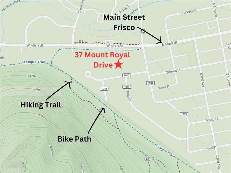 Welcome to this spacious and beautifully maintained 3-bedroom, 3-bathroom townhouse nestled on a quiet cul-de-sac in the heart of Frisco. Spanning 1,555 square feet across three levels, this home offers comfort, convenience, and stunning views of Mount Royal from the brand-new rear decks off the primary bedroom and living room. Enjoy the cozy ambiance of a woodburning fireplace, a one-car garage with extra-tall ceilings for overhead storage, and a thoughtfully designed layout that maximizes space and natural light. The entryway stairs have also been recently updated, adding to the home's fresh and inviting feel. Located just 50 yards from the bike path and only one block from the vibrant shops and restaurants of Main Street, this property offers unbeatable walkability and easy access to I-70. Whether you're heading to Breckenridge, Copper, Keystone, or A-Basin, you're centrally positioned for all Summit County ski resorts. Additional amenities include a common hot tub and a peaceful community setting. This is a rare opportunity to own in one of Frisco’s most desirable neighborhoods—perfect as a full-time residence, mountain getaway, or investment property