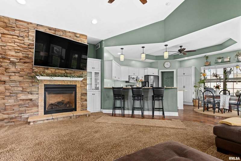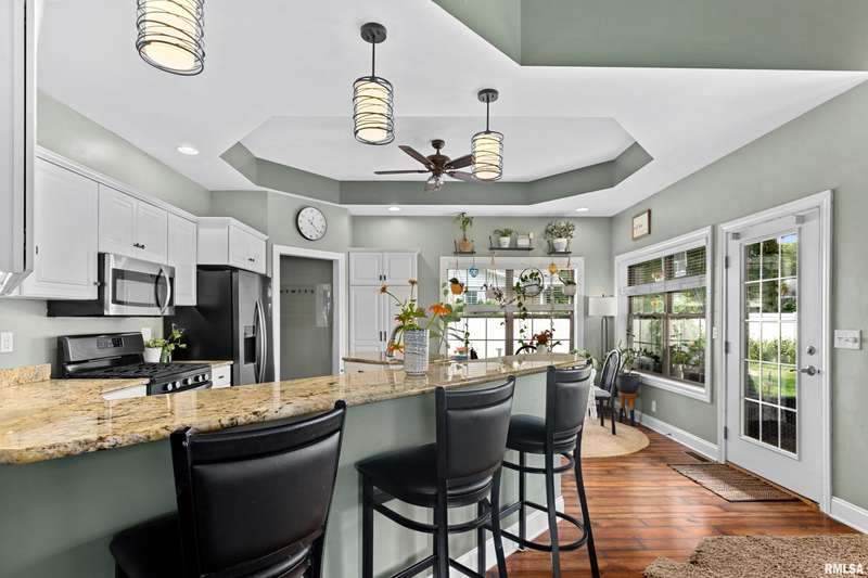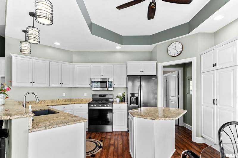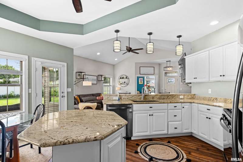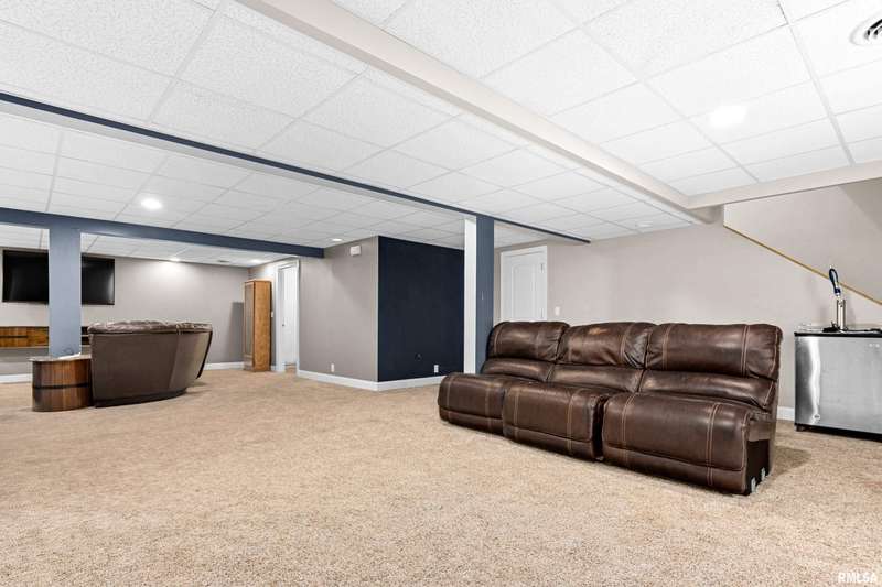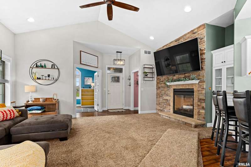 Location! Location! Location! This gorgeous 4-bedroom, 3-bathroom home, built in 2014 is perfectly located within walking distance to the park, pool, grocery store, high school, and grade school, this stunning home sits on a private double lot with a fully fenced backyard, stamped concrete patio, and covered seating area complete with a ceiling fan—perfect for relaxing or entertaining. Inside, you'll find beautiful ceramic-tiled walk-in showers, granite countertops in the kitchen and all bathrooms, and stainless-steel appliances with elegant under-cabinet lighting. The kitchen also features a breakfast bar and island (moveable). The finished basement has 10 ft ceilings that offers a large wet bar, a built-in TV lift system behind the bar, a beverage refrigerator, and abundant storage—including an 11x5 storm shelter room. This home is absolutely gorgeous throughout and checks all the boxes for comfort, style, and convenience. Main floor laundry as well. Extra egress window for another bedroom if needed. Don't miss out on this one! Schedule your showing today!