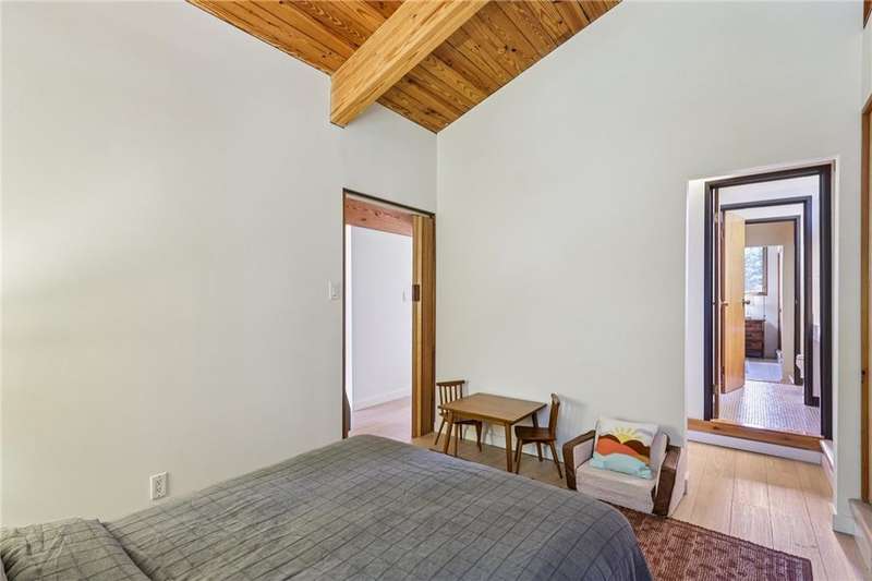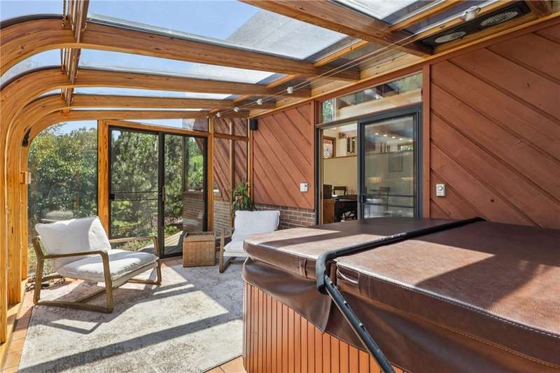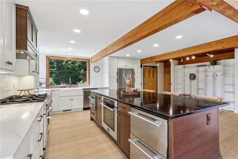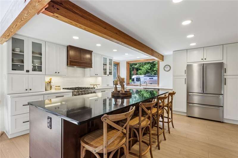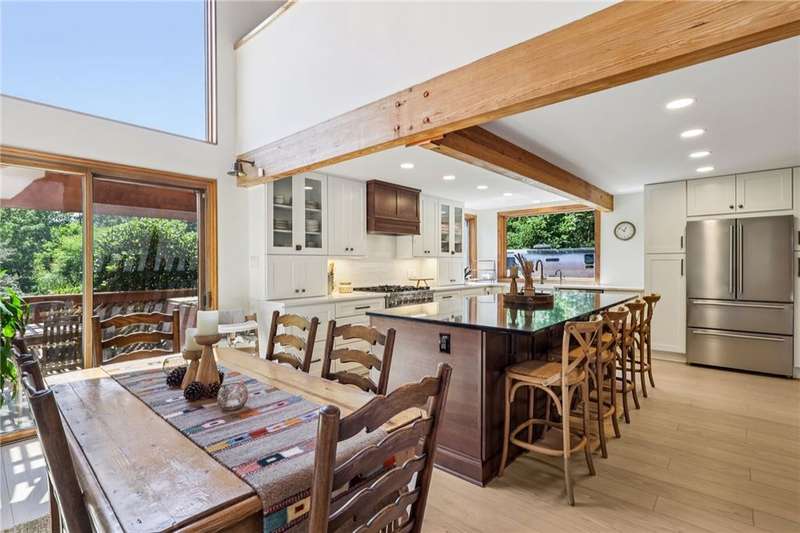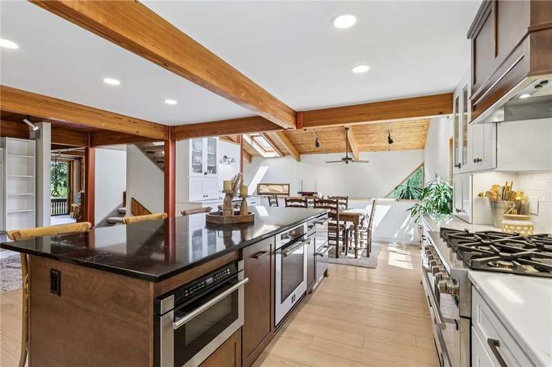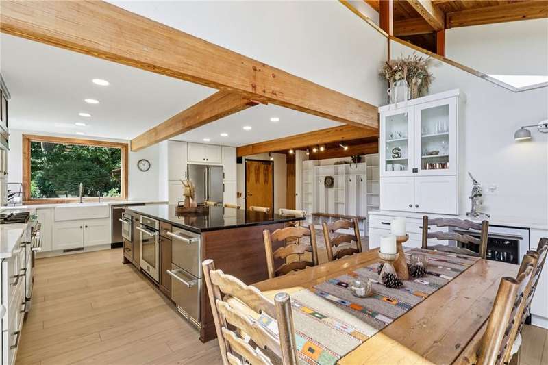 Originally built in 1979, the home is anchored by a monolithic 10-inch concrete foundation and showcases dramatic tube-and-beam construction using steel and pine. The reimagined open-concept floor plan centers around a spectacular custom kitchen with quartz countertops, a 10-foot island, premium Forno appliances, and a dry bar—perfect for entertaining or everyday living. A massive picture window above the sink fills the space with light and provides a perfect view of the driveway, yard, and woods beyond.