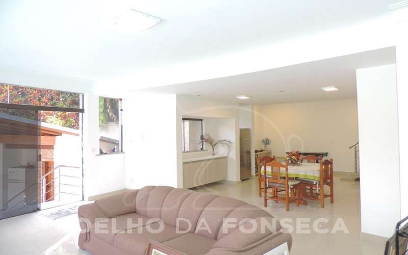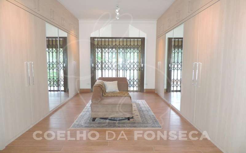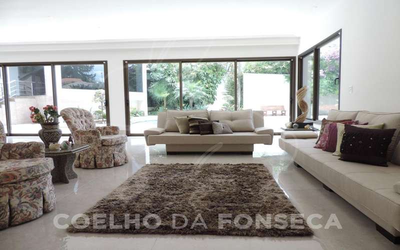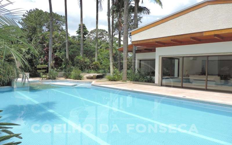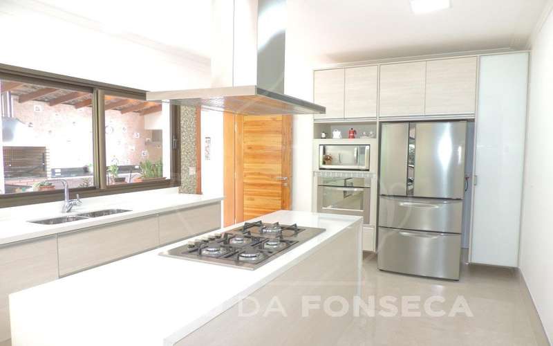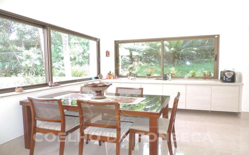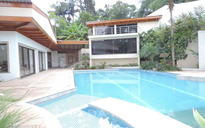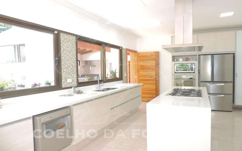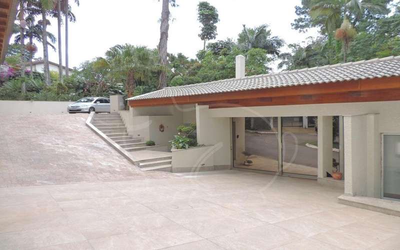 Residência térrea com 750 m² de construção e 1870 m² de terreno. Possui home theater e 5 dormitórios, sendo 4 suítes: 1 máster com closet repleto de armários, 1 americana e 2 convencionais. Cozinha planejada. Churrasqueira equipada com forno de pizza e adega climatizada. Piscina com trampolim, bar molhado e salão de festas com vista para a piscina. Jardim com projeto paisagístico. Sala de estar com piso em porcelanato polido e vista para o quintal. Sistema de energia solar.