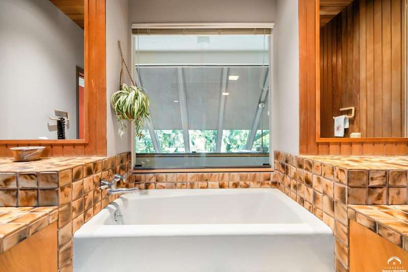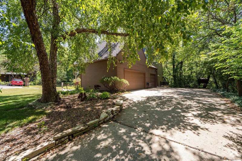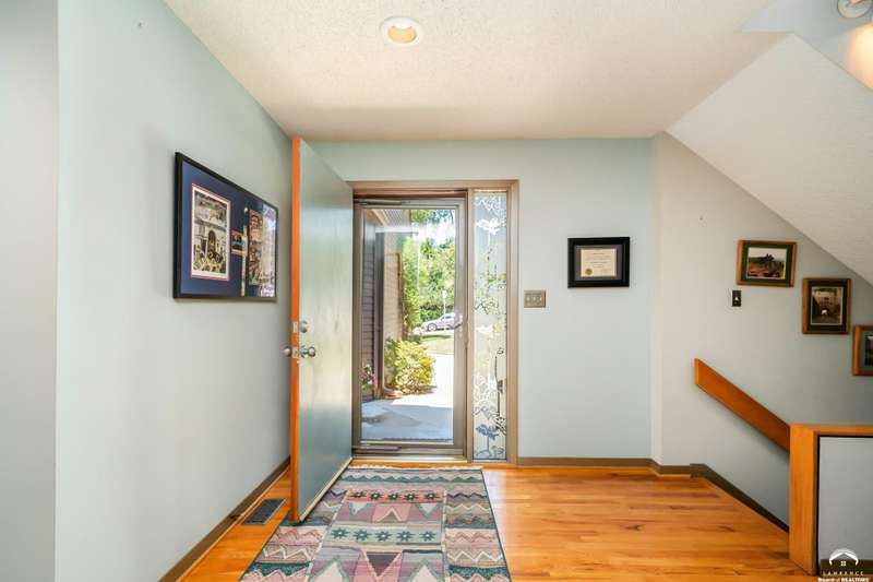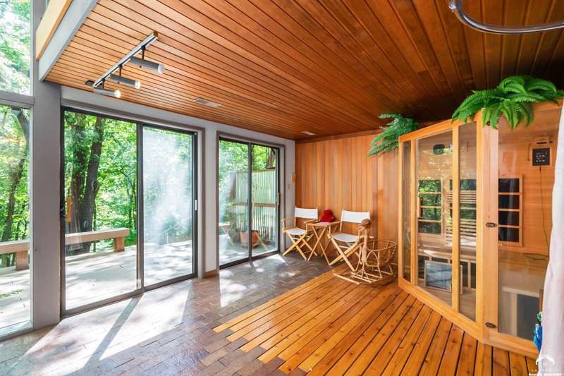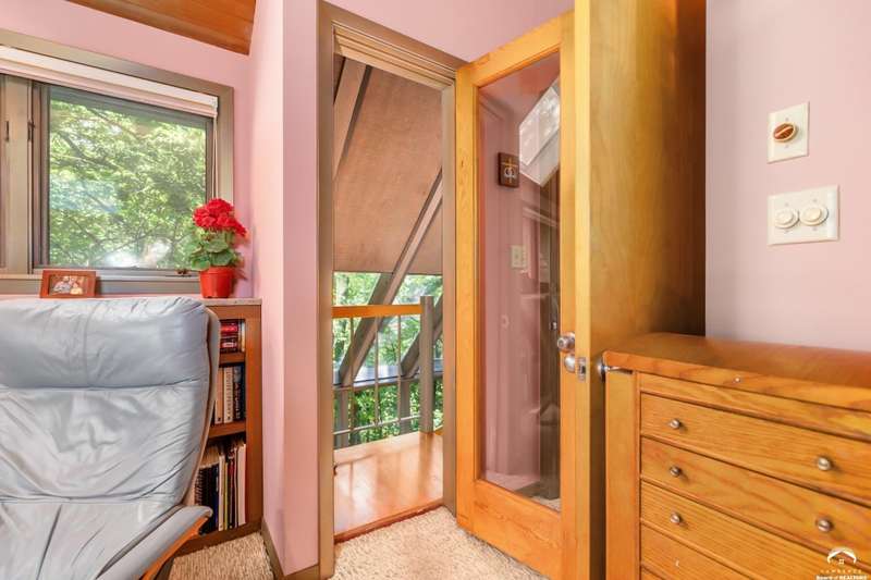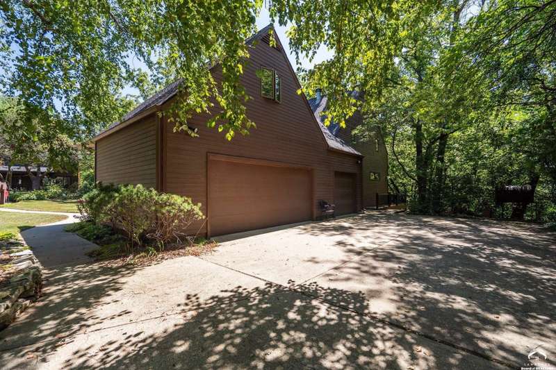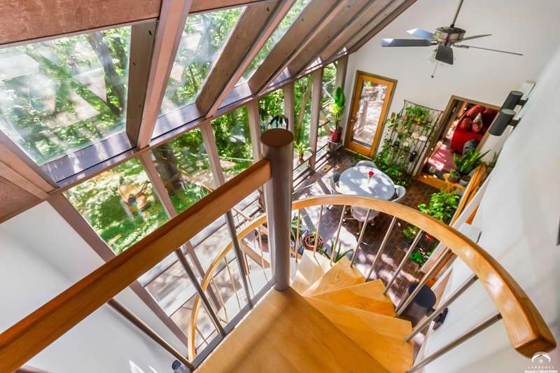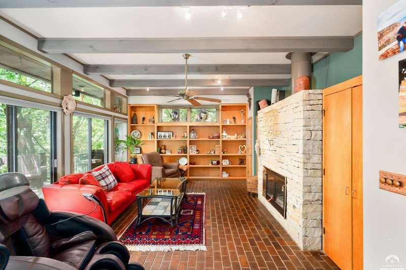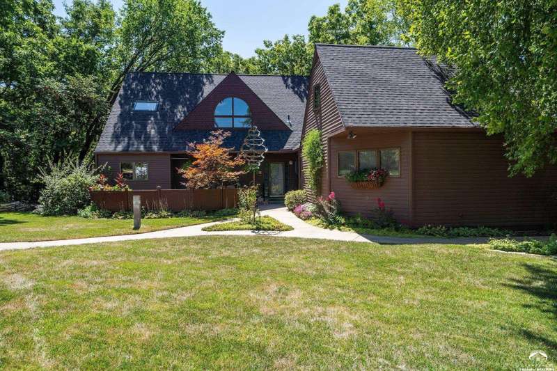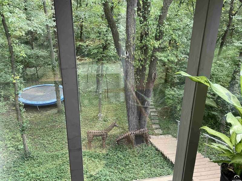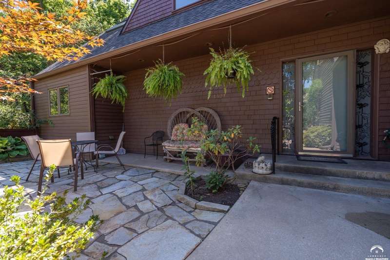 This captivating urban oasis sits on a wooded ½-acre lot just five blocks from the University of Kansas. The flower-lined walkway leads to a fenced flagstone patio with a vibrant waterfall feature, elevated flowerbeds, and an impressive 12-foot wind sculpture. Inside, the entry opens to a stunning two-story foyer with rounded walls. The kitchen features granite countertops, an expansive peninsula, upscale European cabinetry, oak flooring, and a distinctive oak ceiling. A walk-in pantry and closet provide storage next to the garage. The formal dining room is highlighted by a rounded end wall, and the main-level study offers custom oak shelving. The sun-filled living room includes a wood-burning fireplace, an entertainment center, high windows, and a wet bar with lighted glass shelving, mini-fridge, and ice-maker. The kitchen opens to a three-story solarium with a glass ceiling and automated insulated panels. The panels open to capture winter sunlight and close at night or on cloudy days to prevent heat loss. Brick floors over a 9-inch concrete base provide thermal storage for passive solar heating. A three-story spiral staircase connects all levels, however, another convenient staircase is located at the front of the house. Upstairs, the Primary ensuite features a cedar ceiling, walk-in closet, cedar bookshelves, veranda, and two new skylights with shades and dual sinks, separate shower, tub, toilet, and bidet. Two bedrooms each include a ladder-accessed loft and newly replaced skylights with solar-powered blackout shades. A fourth bedroom has a shaded skylight, a winter closet (some cedar lined), and an exercise room (non-climate controlled) over the garage. Also upstairs is a convenient laundry room with cabinets, folding counter, and laundry basin. The lower-level features a vitalizing infrared sauna with adjacent shower, an entertainment area with 65” TV and built-in shelving, and a wet bar with full-size refrigerator, wine rack, and sink. This award winning home also features a downstairs tiled recreation room, a full bath, and an ample storage area with shelving. The lower level opens to a 35-foot Trex deck, with an 8-person Spa and has stairs leading down to the wooded backyard, where you’ll find a cozy firepit beside the creek. Estate Sale October 24th thru 26th.