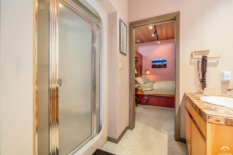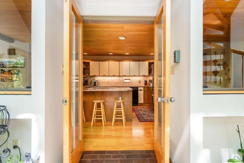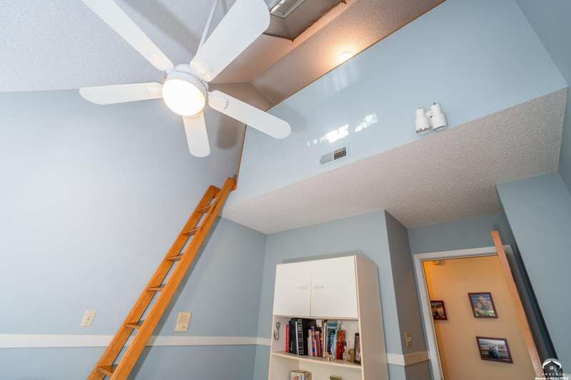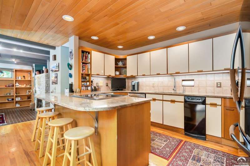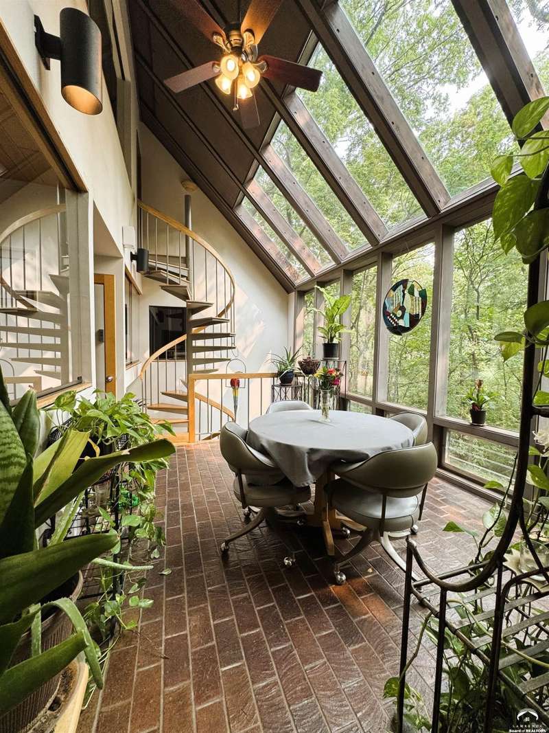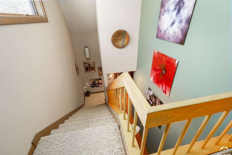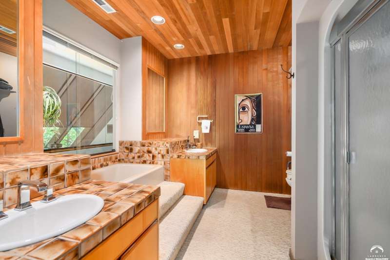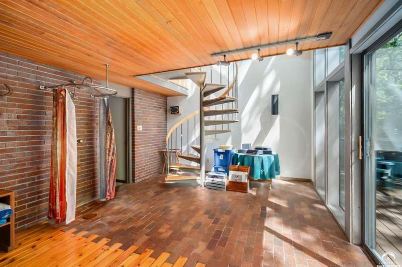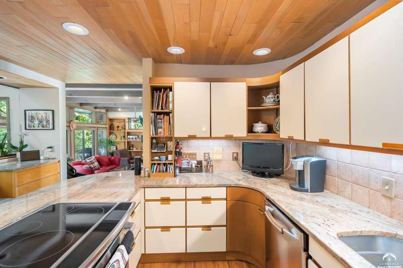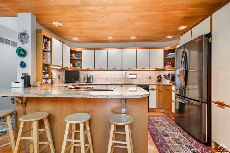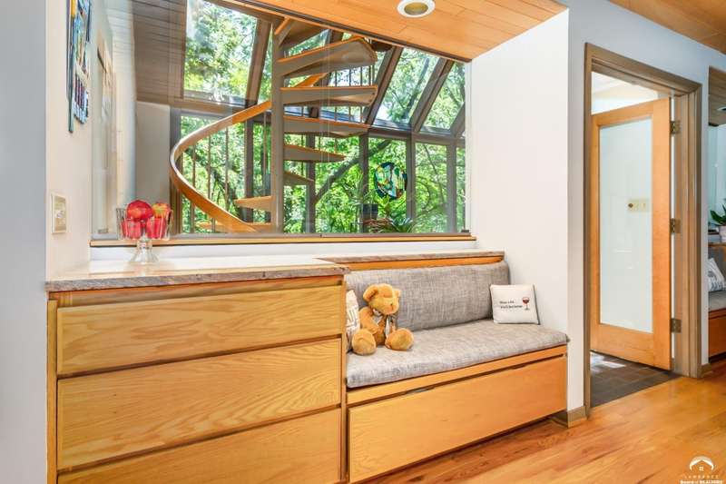 This captivating urban oasis sits on a wooded ½-acre lot just five blocks from the University of Kansas. The flower-lined walkway leads to a fenced flagstone patio with a vibrant waterfall feature, elevated flowerbeds, and an impressive 12-foot wind sculpture. Inside, the entry opens to a stunning two-story foyer with rounded walls. The kitchen features granite countertops, an expansive peninsula, upscale European cabinetry, oak flooring, and a distinctive oak ceiling. A walk-in pantry and closet provide storage next to the garage. The formal dining room is highlighted by a rounded end wall, and the main-level study offers custom oak shelving. The sun-filled living room includes a wood-burning fireplace, an entertainment center, high windows, and a wet bar with lighted glass shelving, mini-fridge, and ice-maker. The kitchen opens to a three-story solarium with a glass ceiling and automated insulated panels. The panels open to capture winter sunlight and close at night or on cloudy days to prevent heat loss. Brick floors over a 9-inch concrete base provide thermal storage for passive solar heating. A three-story spiral staircase connects all levels, however, another convenient staircase is located at the front of the house. Upstairs, the Primary ensuite features a cedar ceiling, walk-in closet, cedar bookshelves, veranda, and two new skylights with shades and dual sinks, separate shower, tub, toilet, and bidet. Two bedrooms each include a ladder-accessed loft and newly replaced skylights with solar-powered blackout shades. A fourth bedroom has a shaded skylight, a winter closet (some cedar lined), and an exercise room (non-climate controlled) over the garage. Also upstairs is a convenient laundry room with cabinets, folding counter, and laundry basin. The lower-level features a vitalizing infrared sauna with adjacent shower, an entertainment area with 65” TV and built-in shelving, and a wet bar with full-size refrigerator, wine rack, and sink. This award winning home also features a downstairs tiled recreation room, a full bath, and an ample storage area with shelving. The lower level opens to a 35-foot Trex deck, with an 8-person Spa and has stairs leading down to the wooded backyard, where you’ll find a cozy firepit beside the creek. Estate Sale October 24th thru 26th.