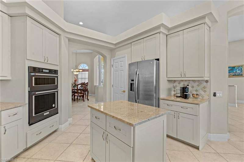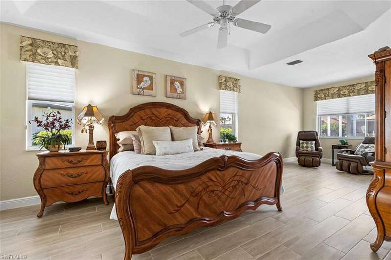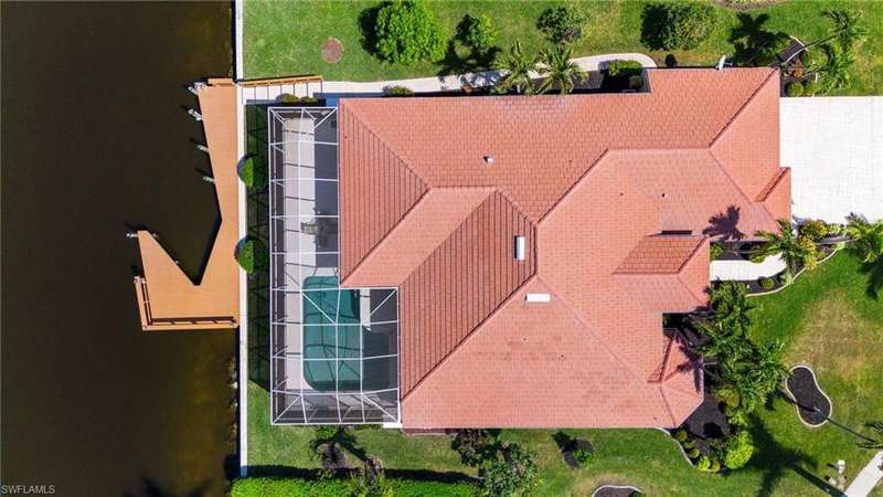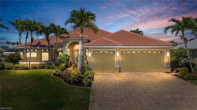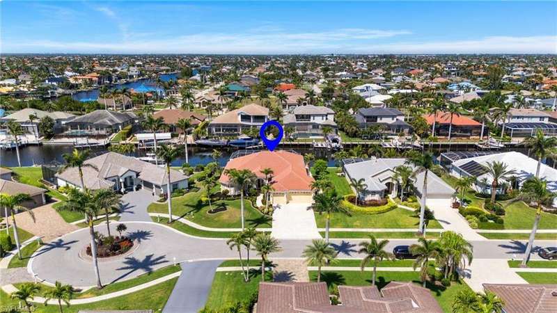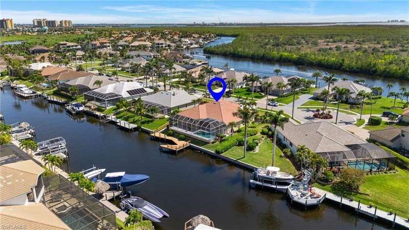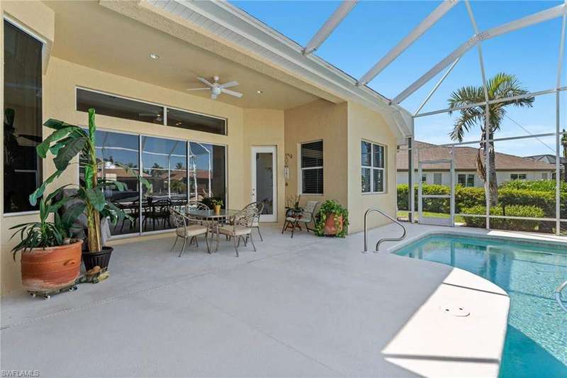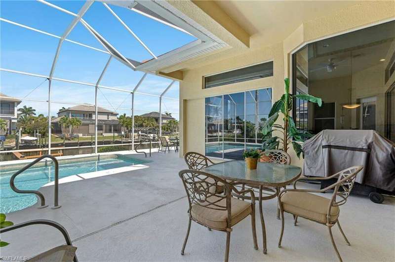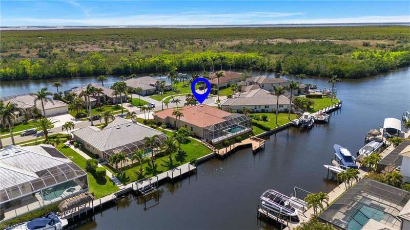 Welcome to your dream home in Cape Harbour, where luxury, comfort, and coastal living come together in perfect harmony. Nestled within one of Southwest Florida's most prestigious waterfront communities, this stunning pool home offers the ideal blend of elegance and ease. Known for its scenic canals and direct Gulf of Mexico access, Cape Harbour is a paradise for boaters and water enthusiasts alike. As you arrive, you'll be captivated by the curb appeal of this expansive 4-bedroom + den, 3.5-bath, 3-car garage residence, offering over 5,000 square feet of indoor and outdoor living space. Step through custom etched glass French doors into a grand formal living area where soaring ceilings and sliding glass doors frame views of the pool and canal. A built-in wet bar with a beverage refrigerator makes entertaining effortless. The updated kitchen is a chef's delight, featuring shaker-style cabinetry, a custom range hood, tile backsplash, granite countertops, stainless steel appliances, a pantry, and a large center island perfect for gatherings. The kitchen opens seamlessly to a bright eat-in area and spacious family room, where disappearing sliding glass doors invite the outdoors in and fill the space with light and tranquil waterfront views. The home also features a formal dining room, a versatile den or home office, and a stylish half bath for guests. The primary suite is a private retreat, featuring new plank tile flooring, a tray ceiling, a generous sitting area, and private pool access through an etched glass door. Wake each morning to water views and unwind in the spa-inspired bath, complete with two walk-in closets, an oversized soaking tub, dual vanities with new sinks, and a walk-through shower with a teak seat. The guest bedrooms are equally inviting, with two sharing a Jack-and-Jill bath and the third enjoying a private ensuite that also serves as the pool bath. All guest rooms feature wide plank tile flooring, and two have walk-in closets. Step outside to the oversized screened lanai, which spans the full length of the home and offers ample space for lounging, dining, and entertaining under the Florida sun. A short stroll takes you to your private composite boat dock, where you're just minutes from open water-perfect for boating and fishing. Recent updates include a new roof ('23) and new AC system '(24), providing peace of mind and long-term value. Located on a quiet cul-de-sac, this home also offers access to Cape Harbour's resort-style amenities, including a marina, pools, fitness center, and a vibrant social scene. Stroll through the walkable waterfront village, featuring boutique shopping, waterfront dining, live music, and spectacular sunsets-all just steps away. This home is being sold turnkey and includes a transferable flood policy, so you can move right in and start enjoying the Florida sunshine. More than just a residence, this is a lifestyle-where every day feels like a vacation!
