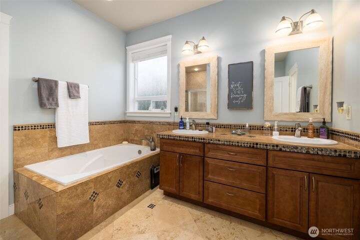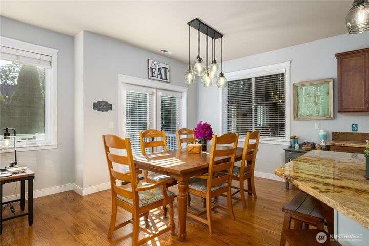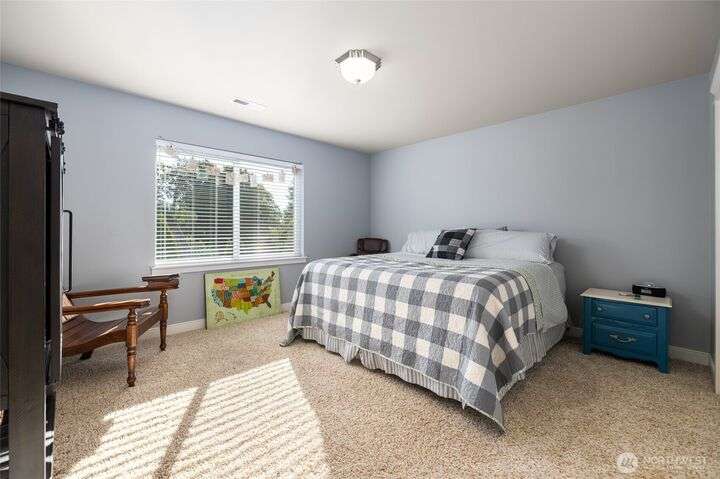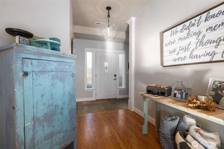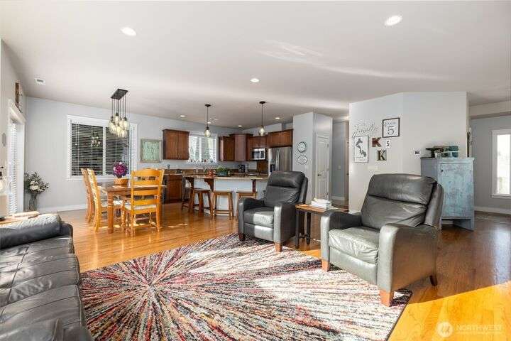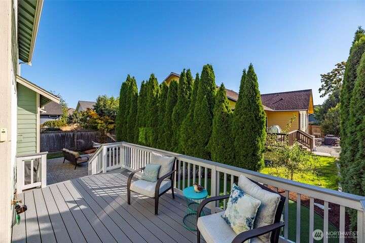 Tucked at the end of quiet lane in charming La Conner, this home has so many upgrades: hardwood & tile flooring, slab granite counters, new composite deck & paver patio. Light-filled great rm w/oak floors, natural gas fpl w/stone surround, spacious kitchen w/ss appliances, gas range, huge island w/seating. Home office off tiled front entry. Laundry w/utility sink & main floor 3/4 bath w/tile floors. Main floor primary suite w/ensuite 5piece bath w/tile floor, double vanity, soaking tub, shower w/tile surround, walk-in-closet. Upstairs are two generous guest rms, full bathroom w/tile floor, & a big, finished bonus room. Fenced yard w/water feature, putting green. Attached garage. Walkable to shops, dining, marina, boardwalk. Not leased land!