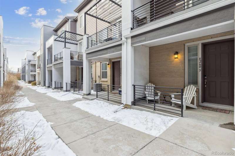 Seller offering to purchase a 2-1 interest rate buydown, plus $5000 toward Buyer closing costs!! This meticulously maintained, 3 story townhome is only 6 years old and in brand new condition! This well designed home features a spacious, open-concept floorplan with 10ft ceilings. With south facing windows, custom wood blinds and tons of natural light--the feeling is bright and elegant. Both the primary and secondary bedrooms feature their own en-suite baths. The kitchen is open to the dining and great room living areas with an island, stainless appliances, including a gas stove, subway tile backsplash and quartz countertops. The great room and kitchen are perfect for entertaining. A sizable balcony with mountain views adjoins the great room/living area which has sleek LVP flooring and plenty of wall space for hanging art. The oversize 1 car garage is 16X23 feet and has a 10 ft ceiling with practical steel overhead storage racks. It features an epoxy-coated floor, extensive workshop space, walls of high-end cabinetry, and a newly installed, energy conscious 220V EV charging outlet. The Midtown neighborhood is conveniently located only minutes from downtown Denver. One of north Denver's newest upscale communities, Midtown features excellent amenities, all only steps away, including a clubhouse, community gardens, dog parks, a splash pad for kids at Midtown's Home Plate Park, and an amphitheater with seasonal concerts. Don't miss your chance to live in this charming, vibrant community.