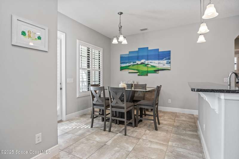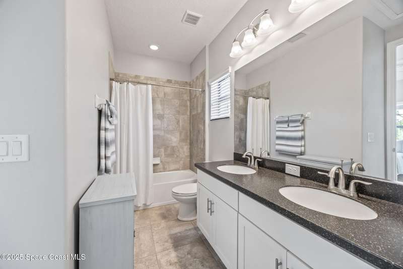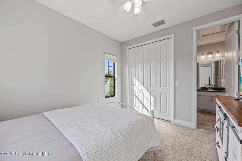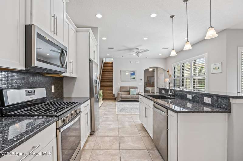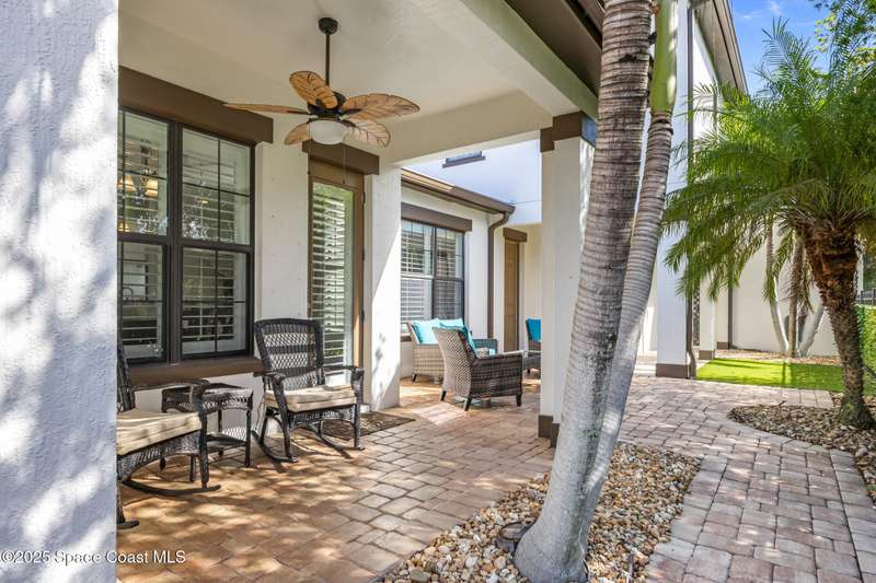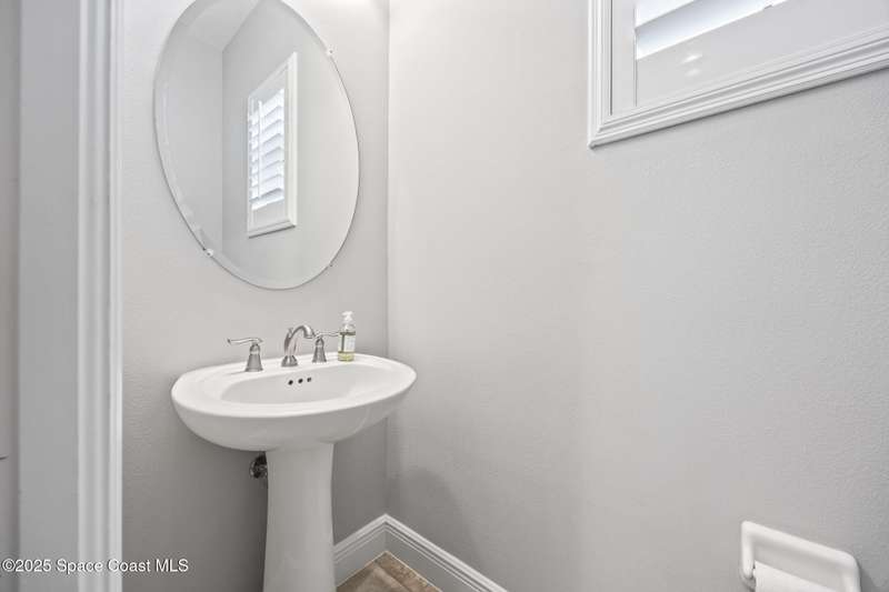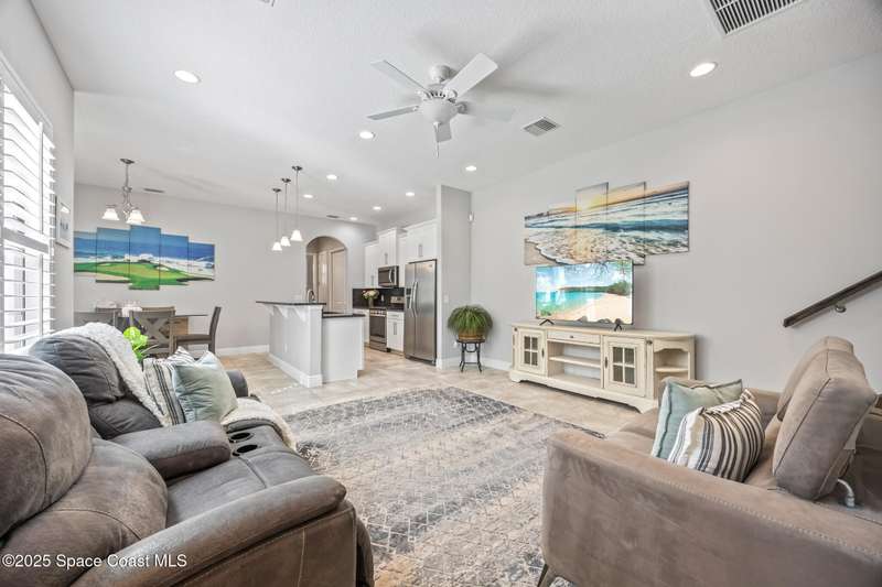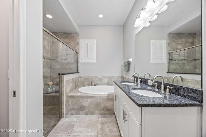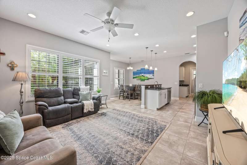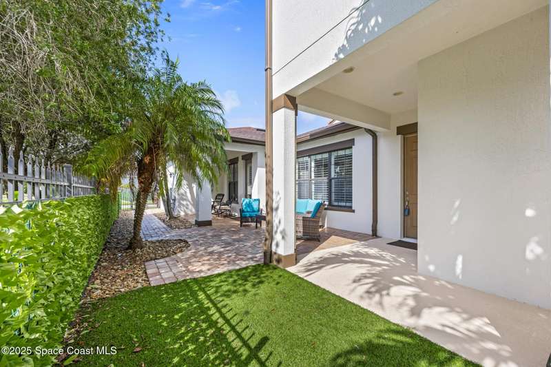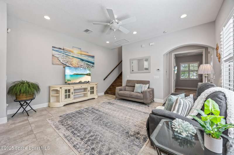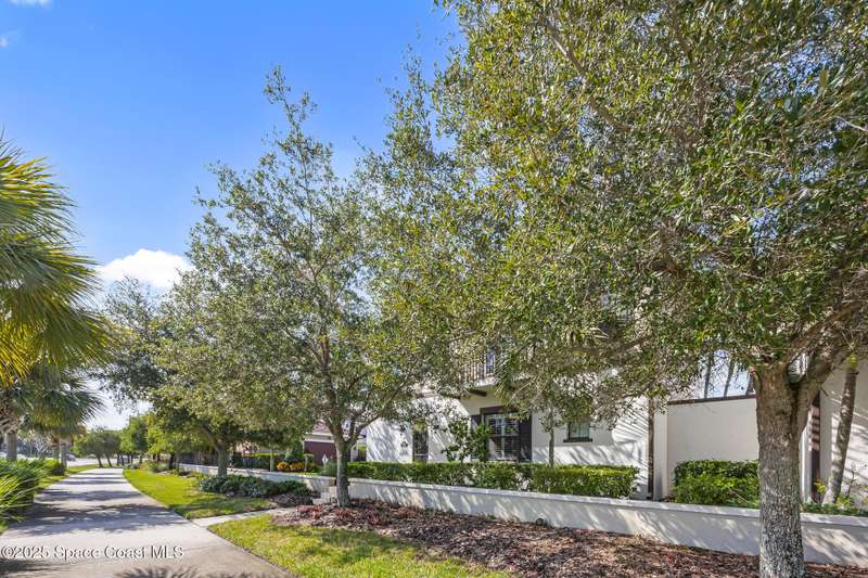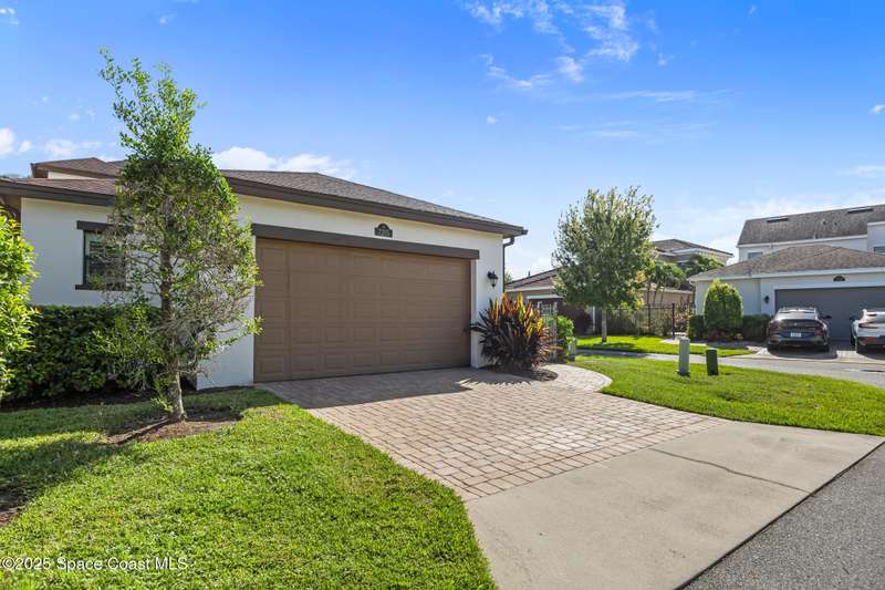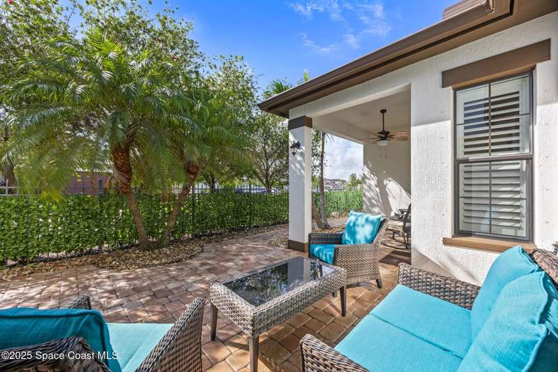Located in Arrivas Village, directly across from The Avenues in Viera, this Aflora floor plan blends style with convenience. Inside, the open living, dining, and kitchen area features 24'' tile floors, granite counters, gas range, and plantation shutters for a crisp finish. The downstairs primary suite offers a double-door entry, walk-in closet, dual sinks with granite, garden tub, and step-in shower. Upstairs, two carpeted bedrooms share a Jack-and-Jill bath with dual sinks, plus a Juliette balcony and oversized closet. Hurricane-rated windows upstairs, panels for downstairs, and a hurricane rated garage door add peace of mind. Extras include a tankless gas water heater, and paved covered patio with privacy, and two sets of laundry connections. Enjoy modern living steps from shopping, dining, and entertainment.