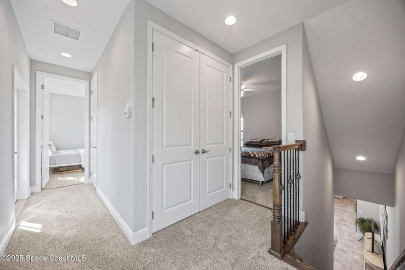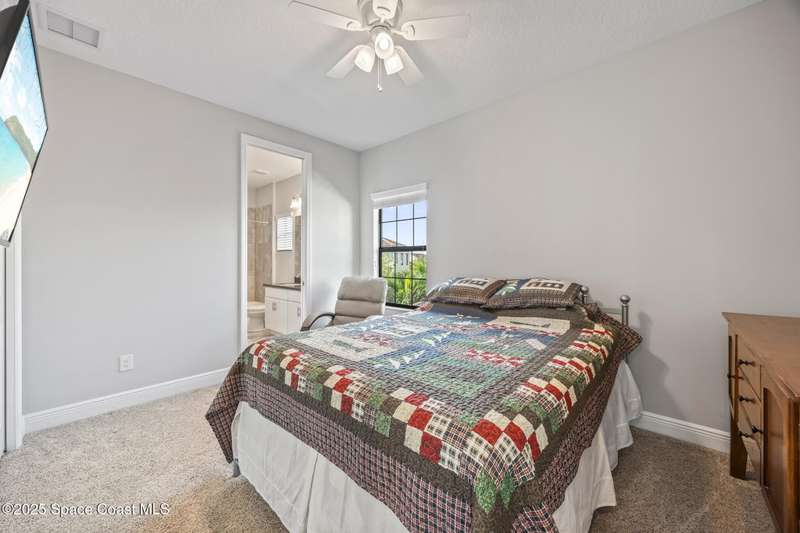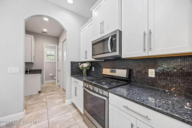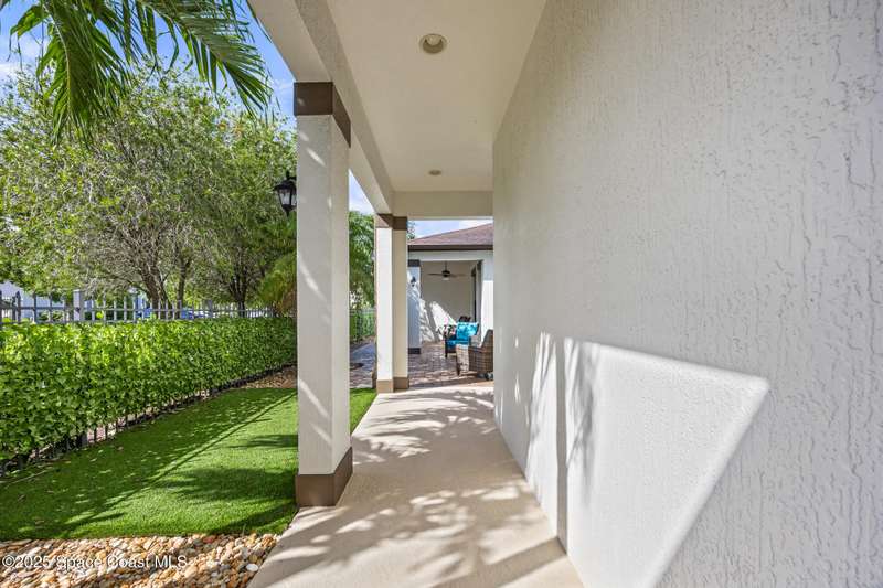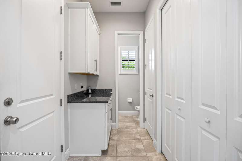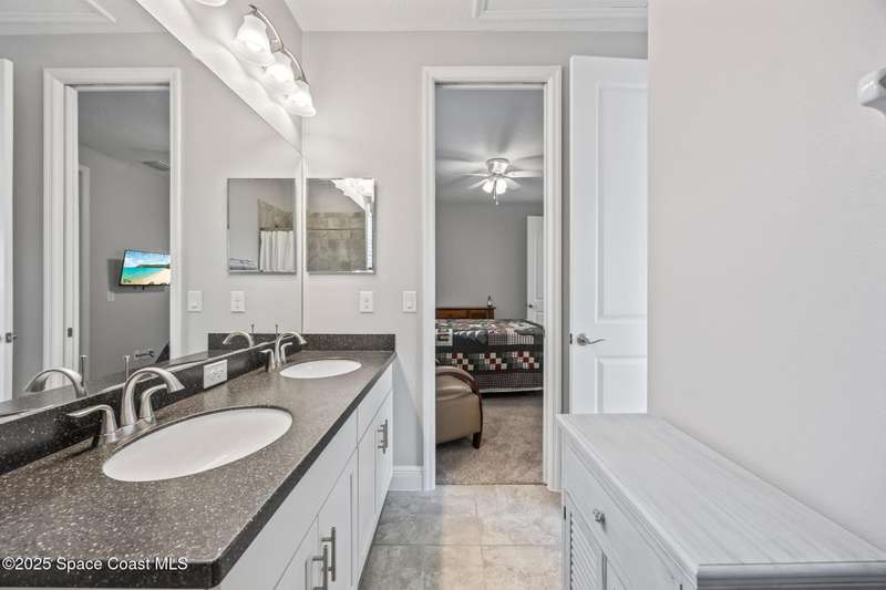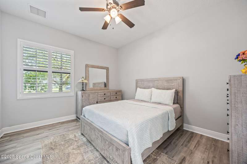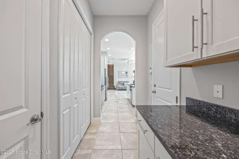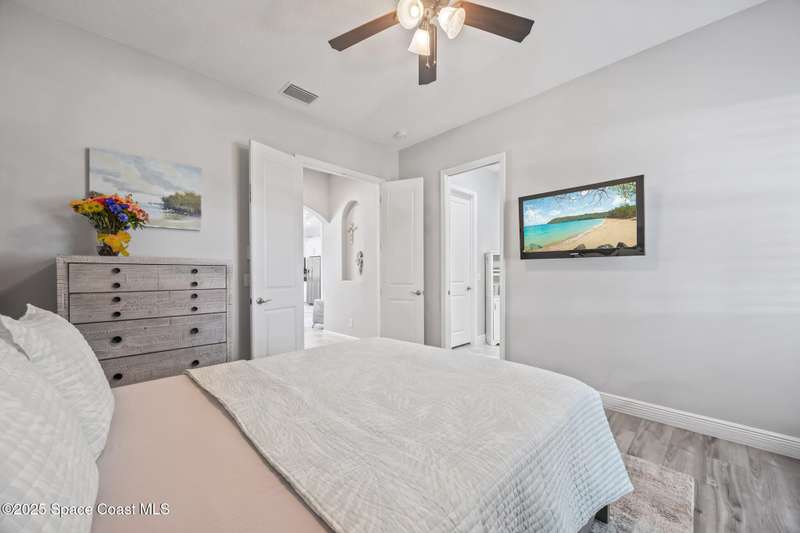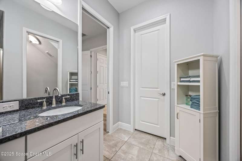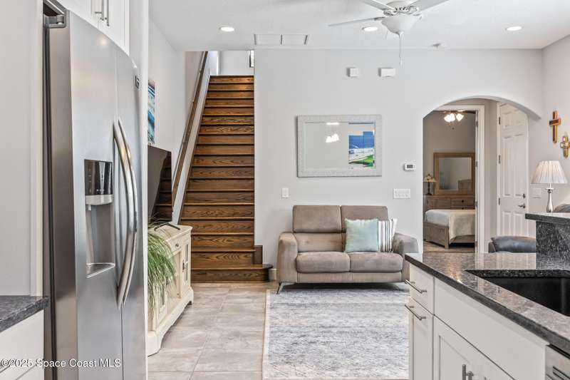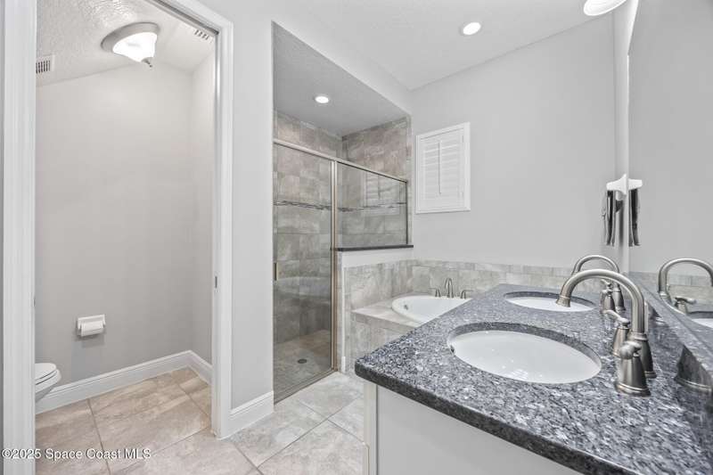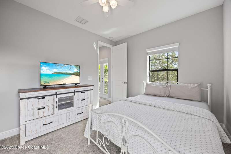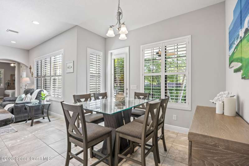 Located in Arrivas Village, directly across from The Avenues in Viera, this Aflora floor plan blends style with convenience. Inside, the open living, dining, and kitchen area features 24'' tile floors, granite counters, gas range, and plantation shutters for a crisp finish. The downstairs primary suite offers a double-door entry, walk-in closet, dual sinks with granite, garden tub, and step-in shower. Upstairs, two carpeted bedrooms share a Jack-and-Jill bath with dual sinks, plus a Juliette balcony and oversized closet. Hurricane-rated windows upstairs, panels for downstairs, and a hurricane rated garage door add peace of mind. Extras include a tankless gas water heater, and paved covered patio with privacy, and two sets of laundry connections. Enjoy modern living steps from shopping, dining, and entertainment.
