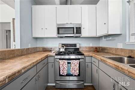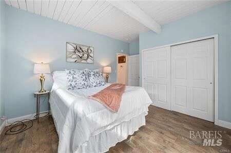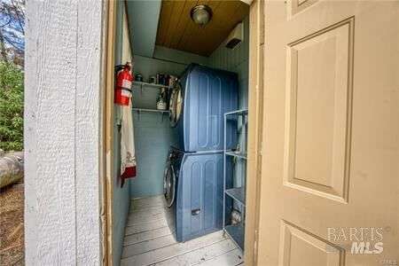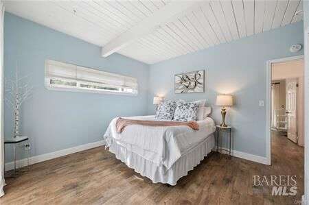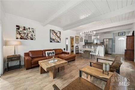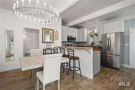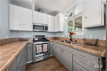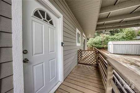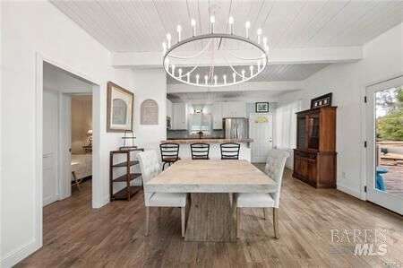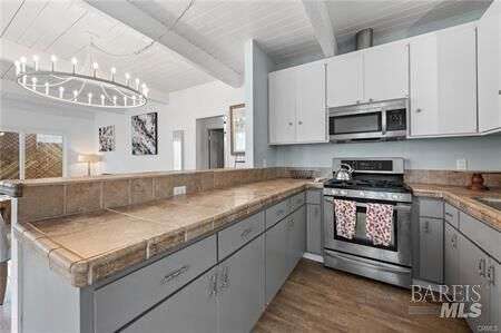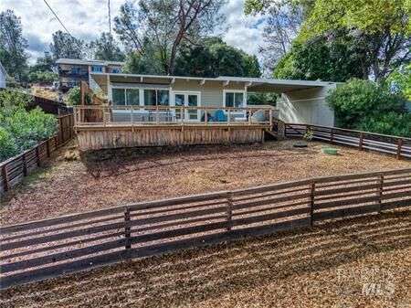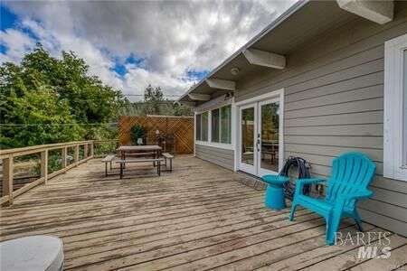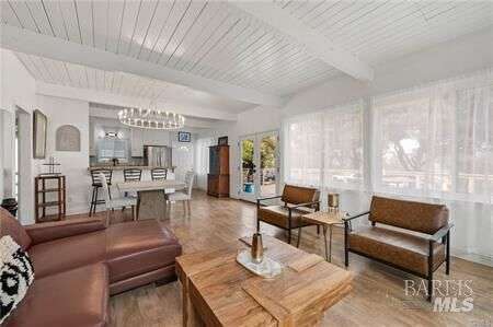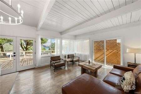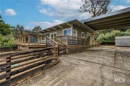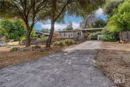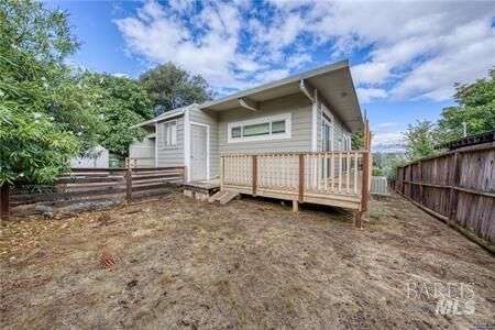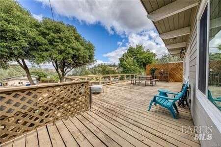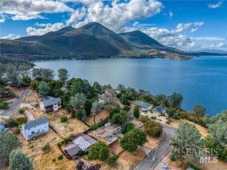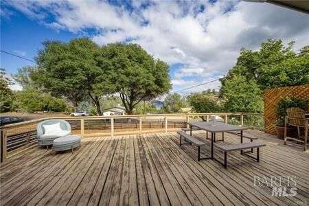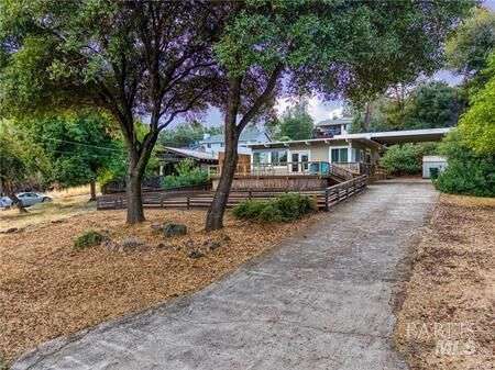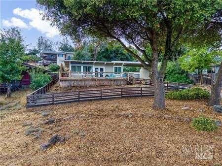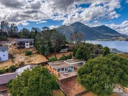 This charming modernized single-level mid-century style lake view home that has been recently upgraded to reflect modern styling. The home features new windows and French doors, laminate flooring throughout, and a light-filled great room with exposed beams and doors that open to a large front deck overlooking the lake. The modern kitchen is equipped with bar counter seating and tile countertops. The stainless steel appliances include a propane range, microwave hood, and refrigerator. The integrated dining room is elevated by a modern chandelier and is located off the French doors that lead to the wrap-around style deck, perfect for entertaining and barbecues. The residence includes two bedrooms that offer slider doors to the wrap around style deck, the rooms are full of natural light. The bathroom was updated with a walk in tiled shower, wainscoting and a single furniture style vanity. Outside, you will find an attached carport with built-in storage, a laundry room and a long, flat driveway that accommodates many cars. The front yard is fenced and is graced by oak trees and nature sightings. Located in Kelseyville Riviera, the home is close to schools, shopping, and the lake. Enjoy country living in a centrally located community in Lake County, California.