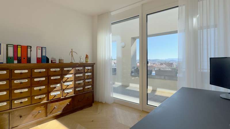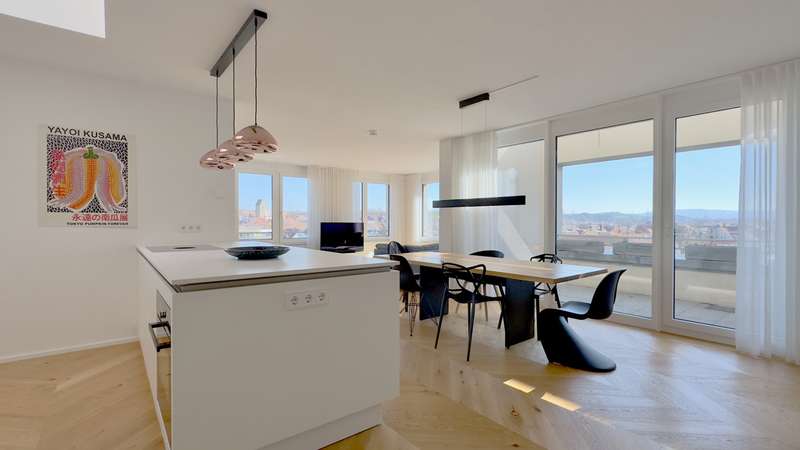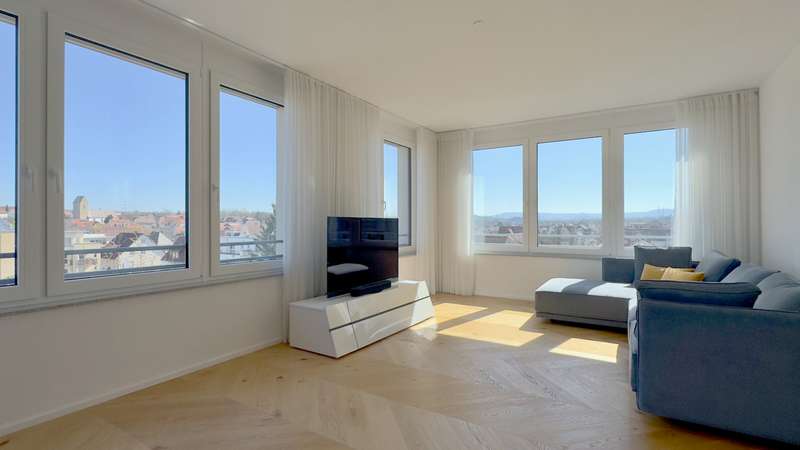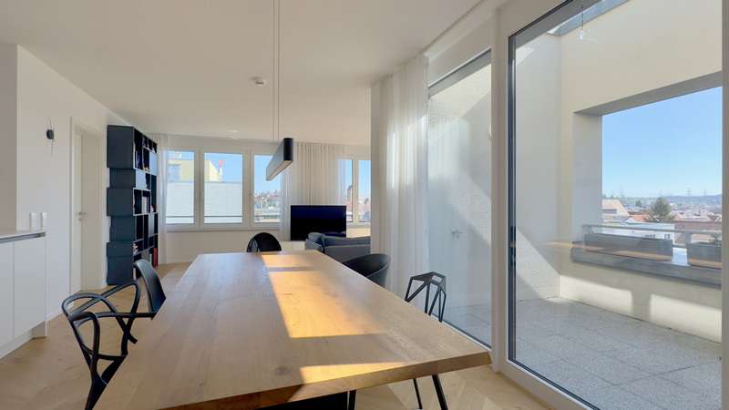 Exclusive penthouse with breathtaking views - your new home at the highest level Welcome to this exceptional penthouse, which was completed in 2021 and provides sophisticated living with a living space of approx. 121.44 m². This modern, as-new property not only offers a luxurious home, but also unparalleled views for families or discerning couples looking for a blend of exclusivity, luxury, as-new comfort and generous space. With a total of 4.5 rooms, the completely barrier-free apartment offers an open, light-flooded living concept that leaves nothing to be desired. The spacious living and dining area forms the heart of the home and offers a panoramic view through the large window fronts that will make any heart beat faster. The floor-to-ceiling windows harmonize perfectly with the additional skylights and fill the room with light for an inviting, friendly atmosphere. Ideal for a lifetime of living enjoyment for young and old alike. The exclusive kitchen is a real highlight: Equipped with an oversized kitchen block and high-quality built-in appliances, it becomes the ideal place for culinary experiences. The open, elegant style harmonizes perfectly with the rest of the living concept and invites you to experience unforgettable moments both when cooking and when eating together. The apartment has three spacious bedrooms, each offering plenty of room for relaxation and retreat. Whether for parents or children - everyone will find their own personal feel-good area here. The modern bathroom impresses with its elegant furnishings and functional design. With space for a washing machine and tumble dryer, it meets all the requirements of a modern bathroom. A large, practical storage room, which is located directly at the entrance door to the apartment, creates additional storage space and makes everyday life easier. Here you can conveniently store everyday items without cluttering up the living area. A herringbone oak parquet flooring from Austria provides a special feeling of warmth and underfoot comfort. This harmonizes perfectly with the underfloor heating. Combined with the electric shutters, which provide convenient shading, you can enjoy a perfect indoor climate all year round. A DigitalStrom Smart Home solution ideally complements the features of this range. Traditionally, you operate all elements using a wall switch - digital enthusiasts can of course operate everything via an app. The spacious balcony is accessible from both the dining area and two bedrooms and offers plenty of space to spend time outdoors. Enjoy the wonderful view of the surrounding area and create a private retreat with an extraordinary ambience above the rooftops of Wendlingen. The apartment's location is ideal for families who want to combine urban living with proximity to nature. Numerous shops, restaurants and leisure facilities are in the immediate vicinity, while the surrounding area offers a high recreational value. The offer is rounded off by two parking spaces in the underground garage, which ideally complete the overall package and guarantee you convenient parking for your vehicles. This penthouse apartment is a rare opportunity for all those who value luxury, as-new quality and design. It not only guarantees exclusive living and lifestyle, but also a perfect combination of functionality and design. Arrange a viewing appointment today and see for yourself. A very special living ambience awaits you here - at the highest level and for a quality of life that leaves nothing to be desired.