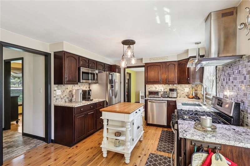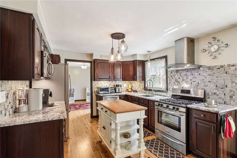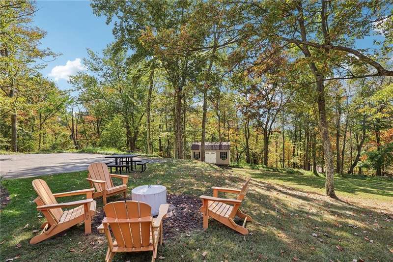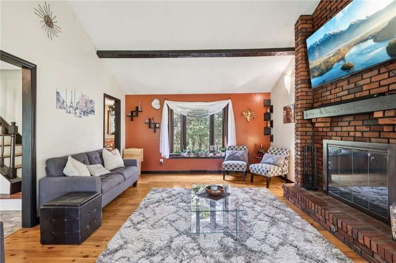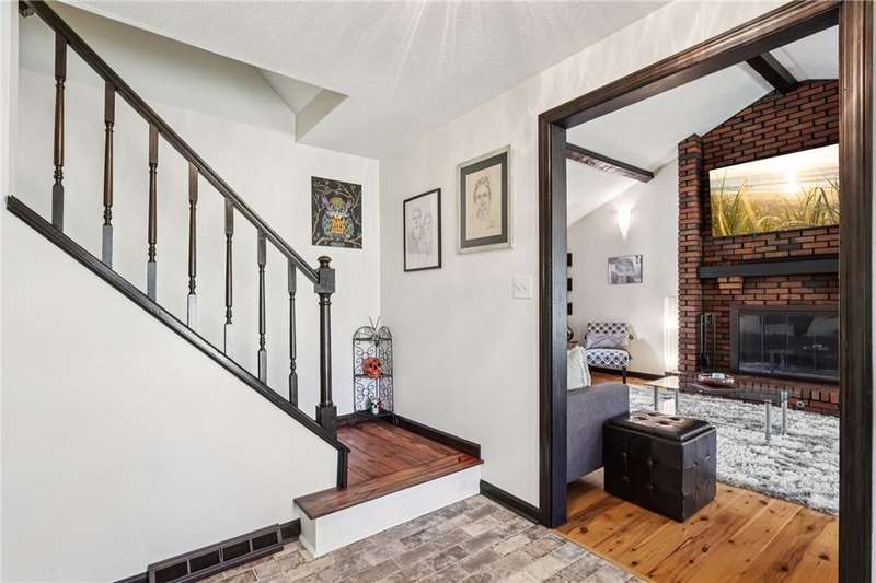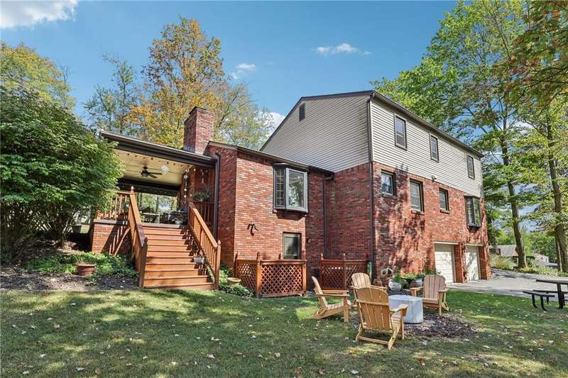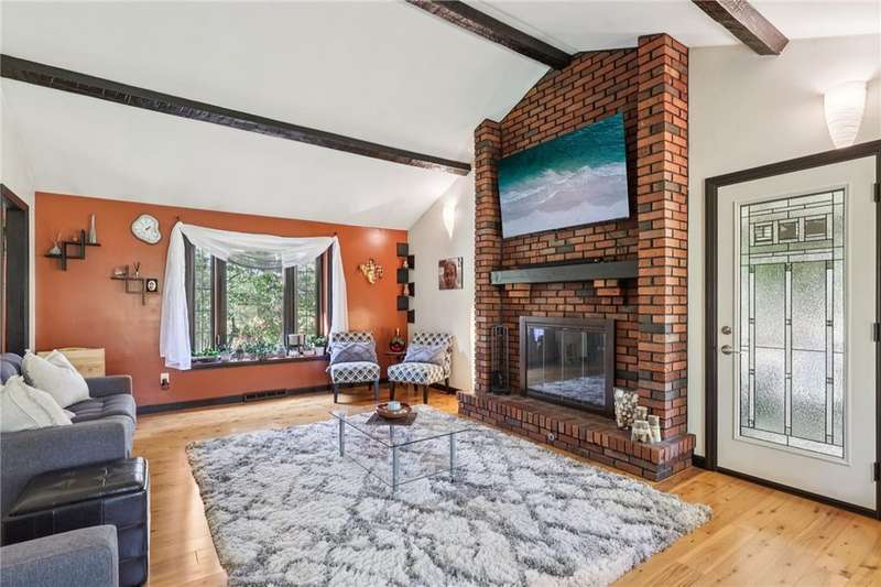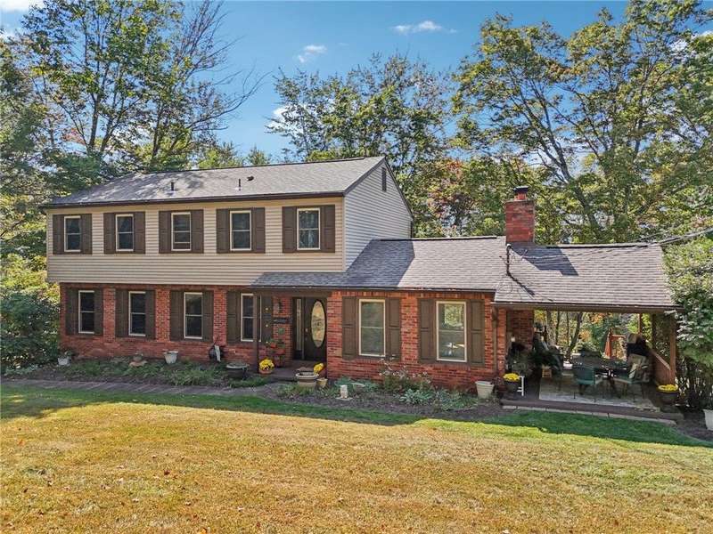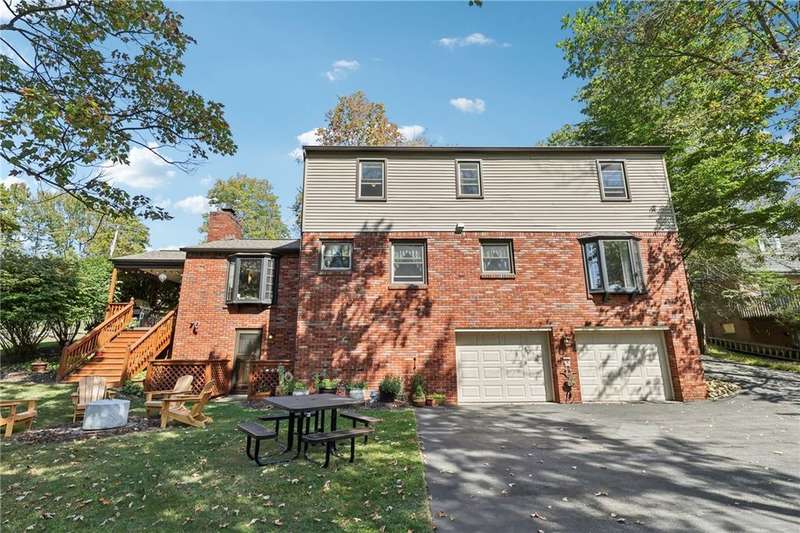 Parklike Setting! Charm meets Modern! Stunning foyer w/leaded glass door opens to hardwood floors & rich moldings. Spacious formal living room & dining room w/ bay window. Updated kitchen boasts stainless appliances, dark cabinetry, granite counters, tile backsplash & breakfast nook. Large family room features vaulted beamed ceiling, brick fireplace to the ceiling, bay window, & leaded glass door to covered side porch. First-floor powder room. Primary suite offers 2 closets & updated ensuite bath w/ barn door & walk-in shower. 3 add'l bedrooms & updated main bath w/European Flair featuring double vessel sinks & tub/shower combo. Finished lower-level game room w/ walkout to rear yard. Outdoor space includes firepit area & shed. Leaf guards on gutters! Fantastic location close to shopping, dining & major routes!