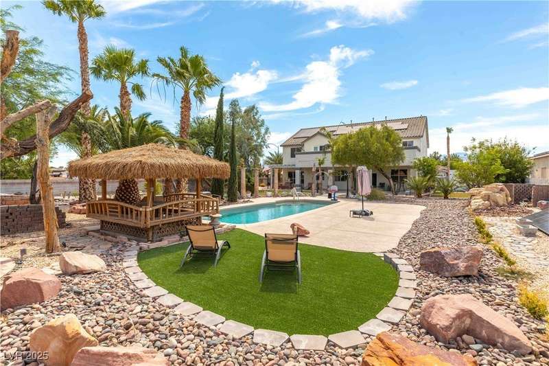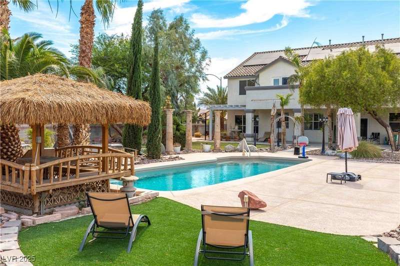 Rare newer home on ½-acre corner lot w/ large salt water pool in Torrey Pines Estates. ** Owned solar covers 100% of power even in summer ** Lot is large enough to build casita, separate RV garage, or second living space! 3-car garage, oversized driveway, RV parking w/wide gate, and add’l side yard space. Over 4,000 SF, 5 beds, loft, and useful floorplan separating primary wing from guest beds. Grand entry w/vaulted ceilings and staircase. Kitchen features granite, dbl ovens, SS appliances, large walk-in pantry, and breakfast bar. Hardwood floors throughout, plantation shutters, ceiling fans, and fireplace in family room w/surround sound wiring and custom built-ins. Office/nursery off primary. Juliet balcony and access to large upstairs patio. Laundry room w/storage, closets w/built-ins. Resort-style yard: mature landscaping, real grass, fountains, tiki hut, extended cov’d patio, solar-heated pool, excellent privacy. Whole-home water filtration w/RO. Smart sprinklers front/back.