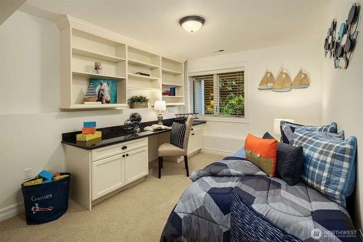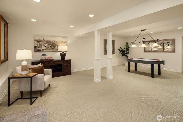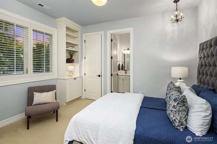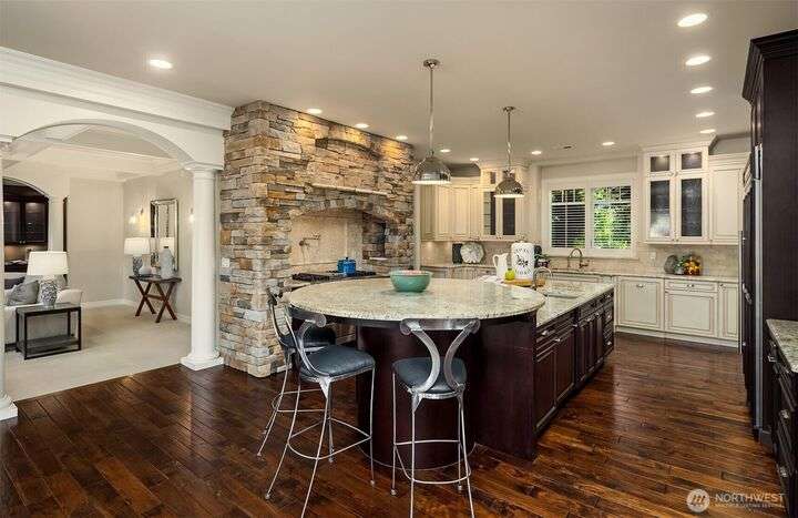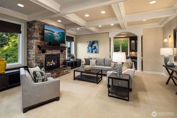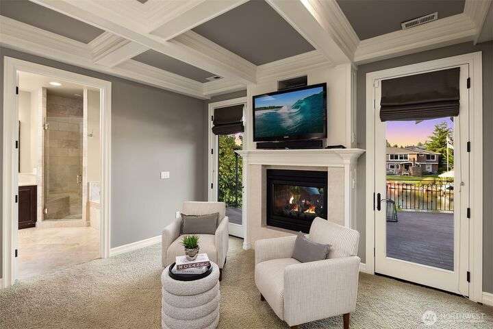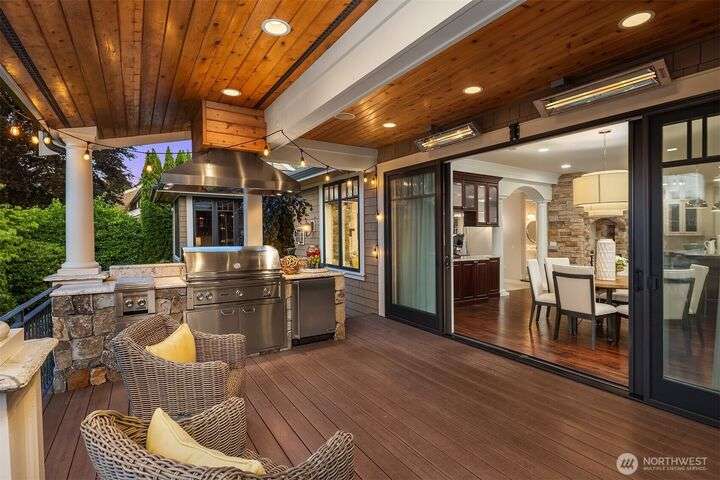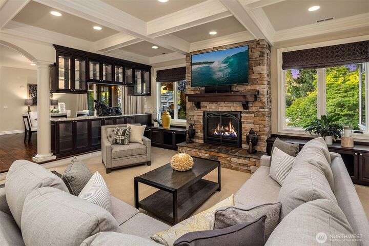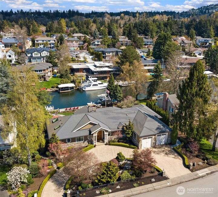 Luxury waterfront living in Newport Shores. Iconic property offering 105 feet of waterfront. This exquisite home blends timeless architecture and stonework with refined updates. Thoughtfully designed for effortless indoor-outdoor living, main level opens to an expansive deck, a lush, level lawn, and coveted canal frontage-sheltered moorage and dock access for boating and water toys. Inside, enjoy a gourmet kitchen, great room, & serene main-floor primary suite with spa-like bath and HUGE walk-in closet. Three additional bedrooms, rec room, home office and vaulted living room (or formal dining). A waterfront sanctuary in popular Bellevue neighborhood w/community engagement. Card & wine room, generator & 2 Walk-in storage rooms.
