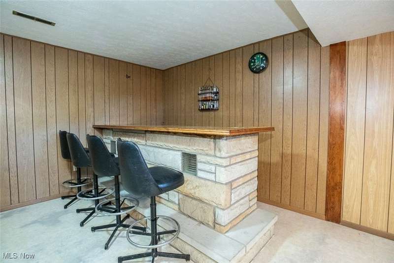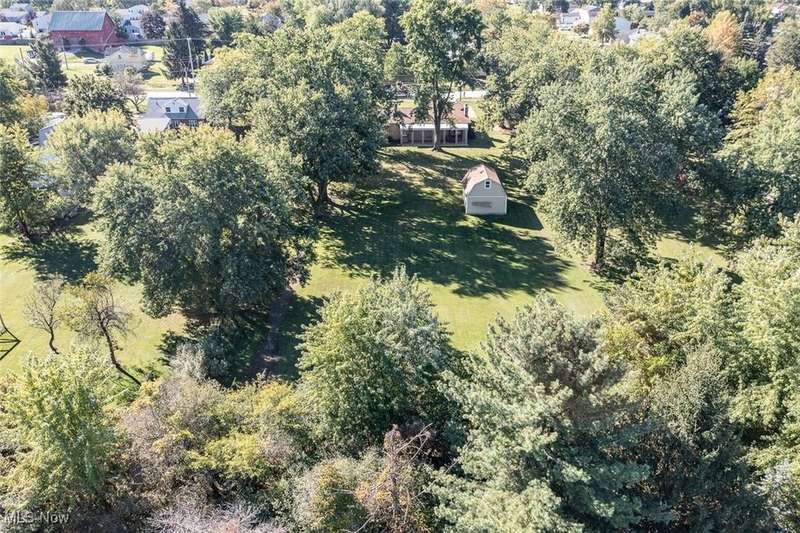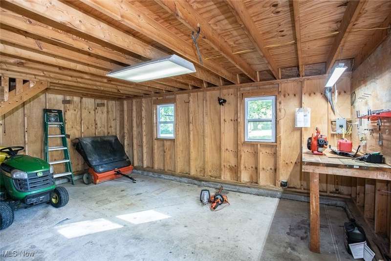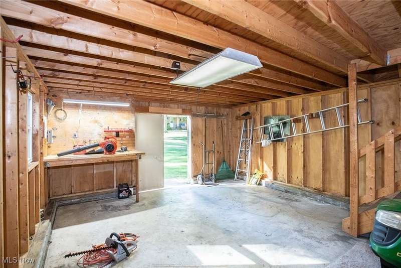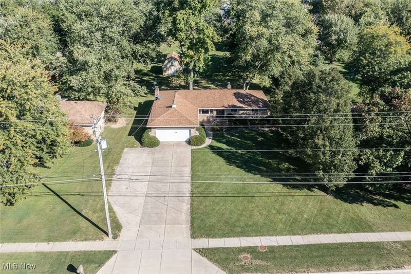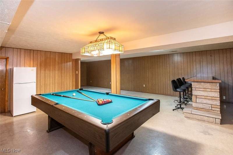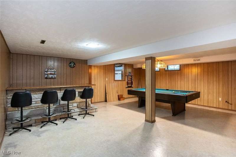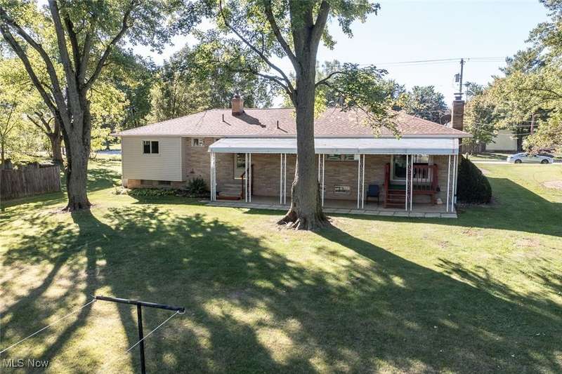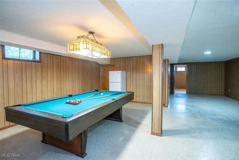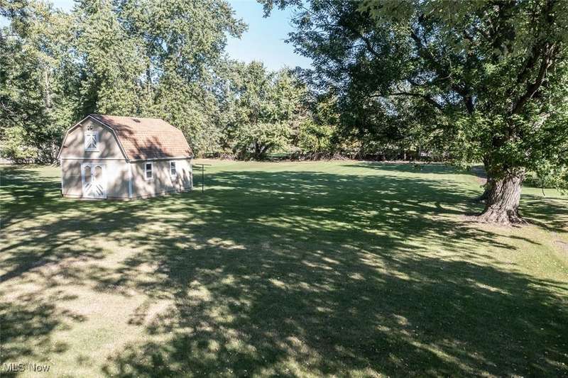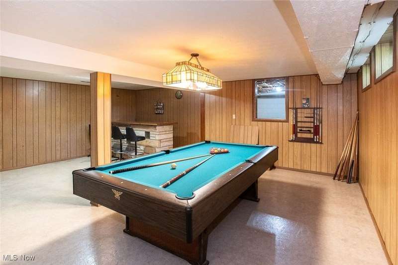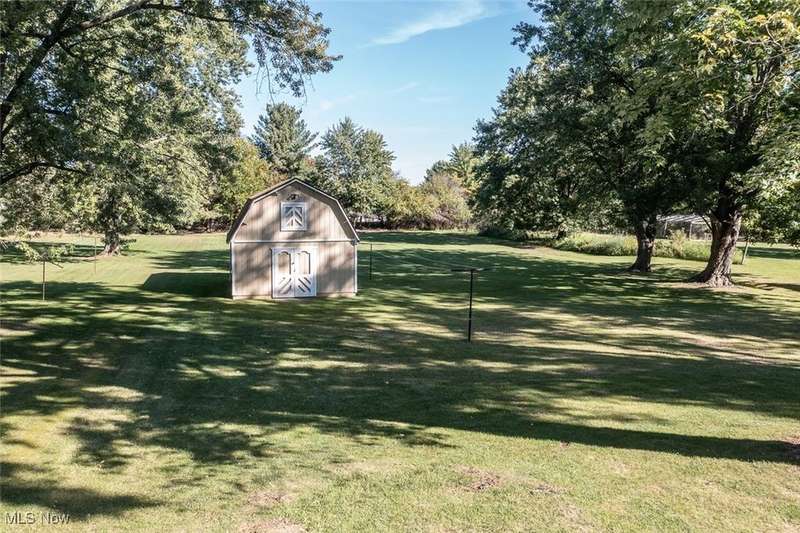 Welcome to this inviting all-brick ranch, perfectly set on a level 0.84-acre lot that blends comfort, charm, and versatility. Inside, you'll find 3 bedrooms with gleaming hardwood floors, 1.5 baths, and a spacious kitchen with generous cabinet storage that opens to a dining area and living room accented by a shared tray ceiling. The family room, warmed by a cozy gas fireplace and sliding glass doors to the patio, offers the perfect spot for gatherings. Downstairs, the fully finished basement extends the living space with a bonus room (currently used as a guest bedroom), a stone bar, workbench, pool table, and even an additional shower for convenience. Step outside to a large nature stone patio overlooking the extended backyard, where an impressive two-level outbuilding, wired with electricity, adds endless possibilities for a workshop, hobby space, or extra storage. Everyday ease comes with the attached 2-car garage and an extra-wide driveway with room to park up to 8 cars. Recent updates include fresh paint (2025), roof (2018), hot water tank (2016), and replacement windows (2006), making this move-in ready home a rare find that combines functionality, character, and charm on a peaceful, nearly acre-sized lot.