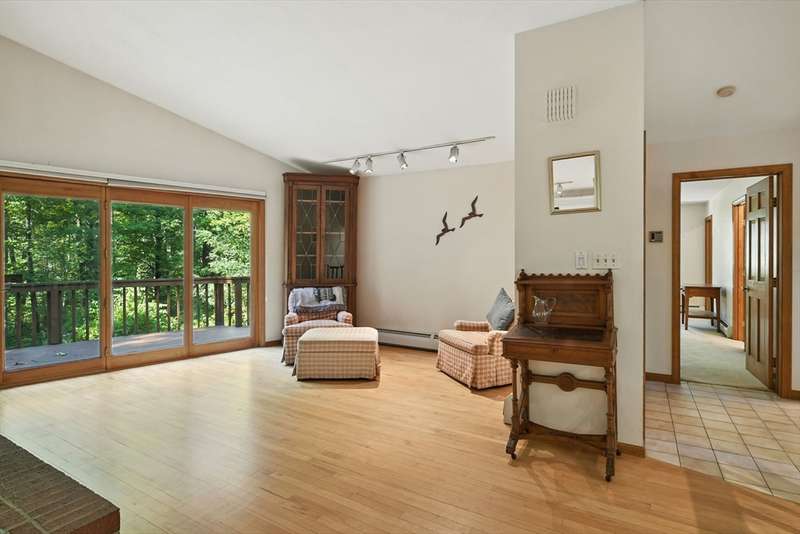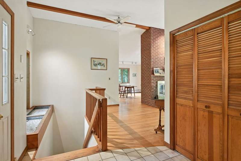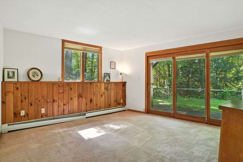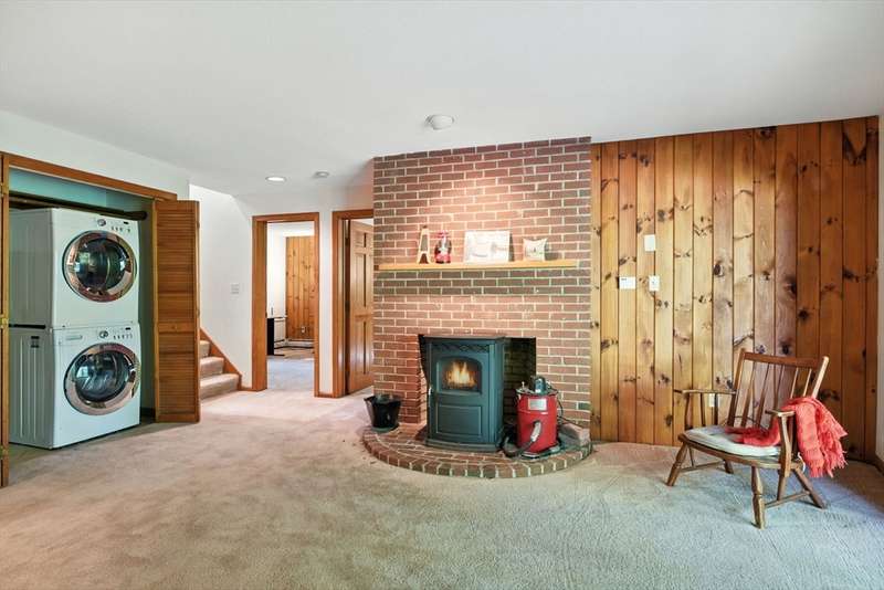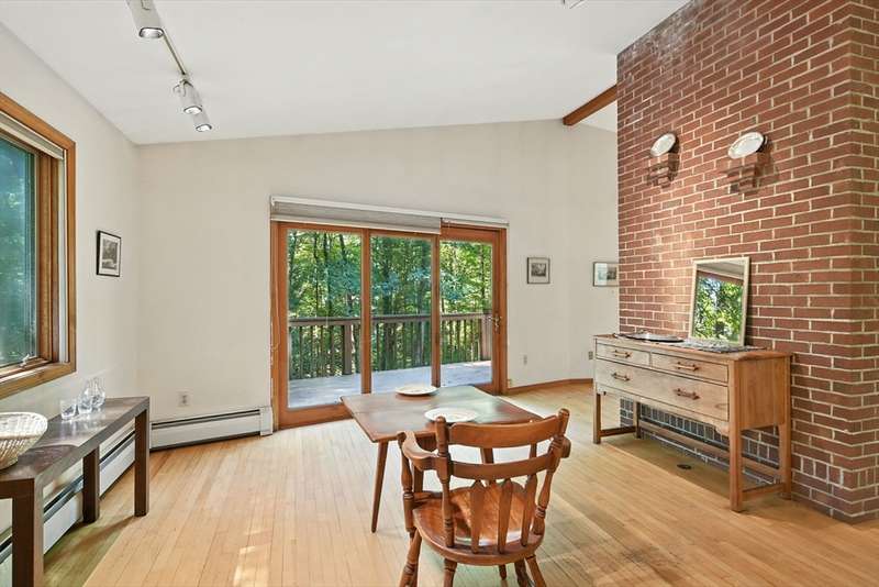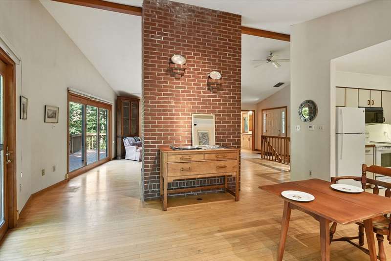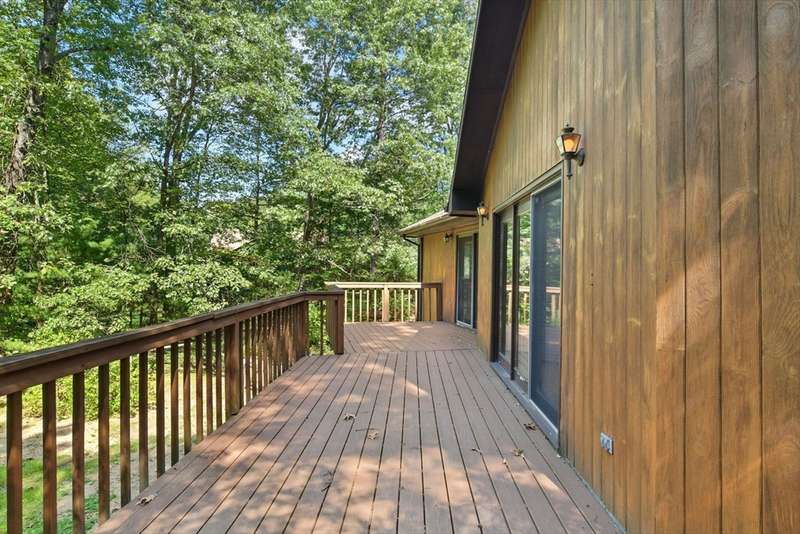 Located in the desirable Amherst Woods neighborhood, this inviting contemporary home is ready for its next chapter. The main level includes living & dining spaces situated on either side of a fireplace. The living and dining areas feature maple flooring and high ceilings. Both spaces are flooded with natural light, and offer access to the composite deck that spans the full length of the back of the home. While the kitchen, open to the dining space, retains original 1987 cabinetry and linoleum, the refrigerator & dishwasher are new. Also on the main level is a large (carpeted) primary suite, with a full en-suite bathroom, and a half bath. Downstairs, you'll find a cozy den area with a pellet stove, two additional bedrooms, laundry, another full bathroom, and access to the two-car garage and fenced backyard.