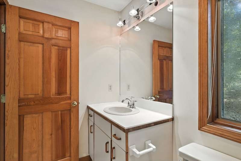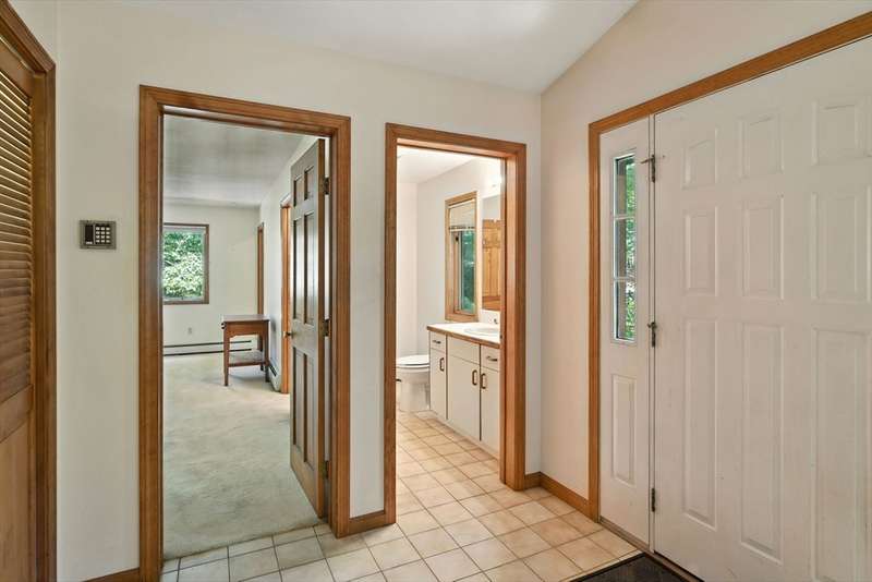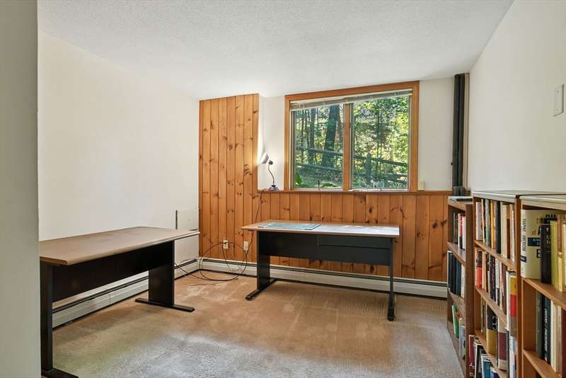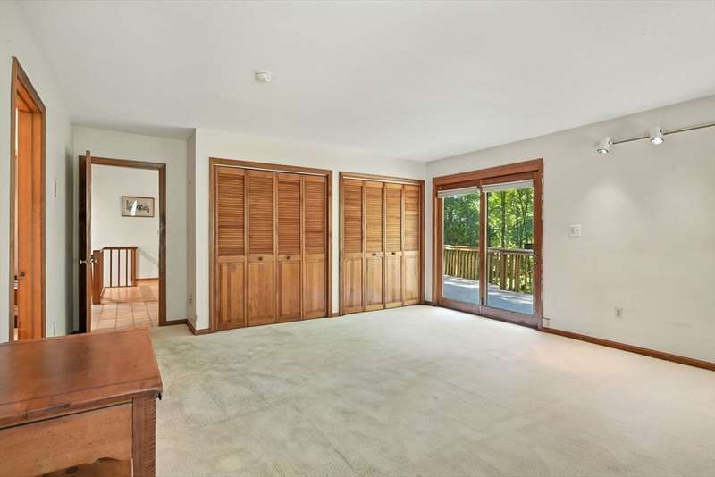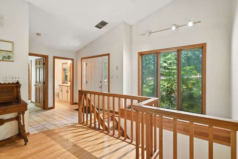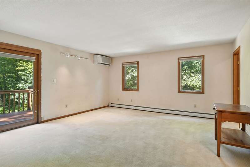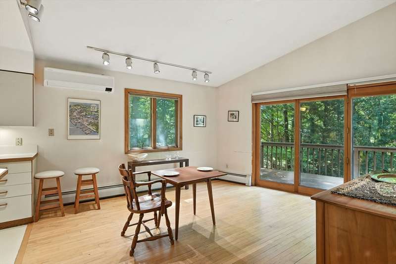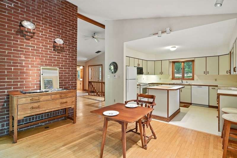 Located in the desirable Amherst Woods neighborhood, this inviting contemporary home is ready for its next chapter. The main level includes living & dining spaces situated on either side of a fireplace. The living and dining areas feature maple flooring and high ceilings. Both spaces are flooded with natural light, and offer access to the composite deck that spans the full length of the back of the home. While the kitchen, open to the dining space, retains original 1987 cabinetry and linoleum, the refrigerator & dishwasher are new. Also on the main level is a large (carpeted) primary suite, with a full en-suite bathroom, and a half bath. Downstairs, you'll find a cozy den area with a pellet stove, two additional bedrooms, laundry, another full bathroom, and access to the two-car garage and fenced backyard.